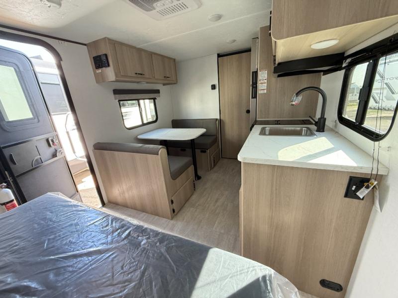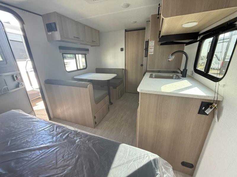 This single axle travel trailer is the perfect couple's trailer with space for an overnight guest on the booth dinette. The walk-around queen bed up front will provide a great night's rest instead of sleeping on an air mattress, and the full rear bath means you won't have to use the camp's facilities at night. You'll also find a refrigerator for food storage, a cooktop, plus a microwave oven for all your cooking needs!