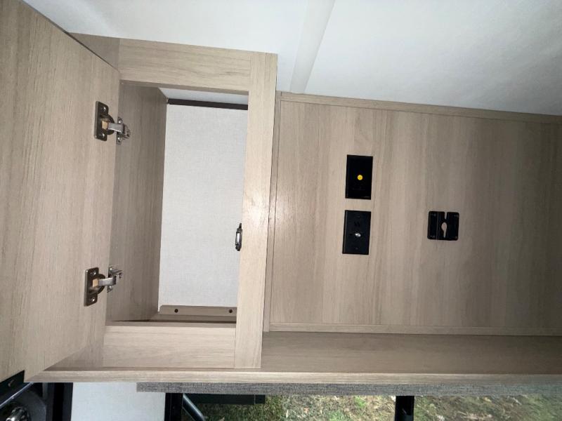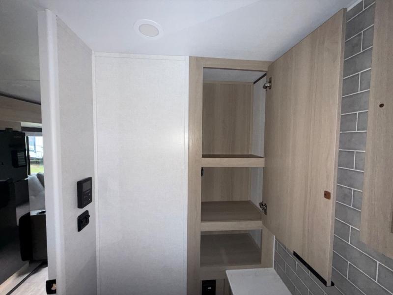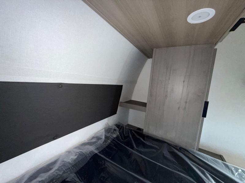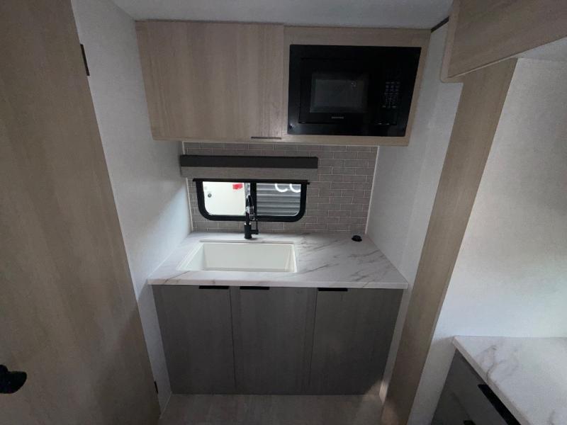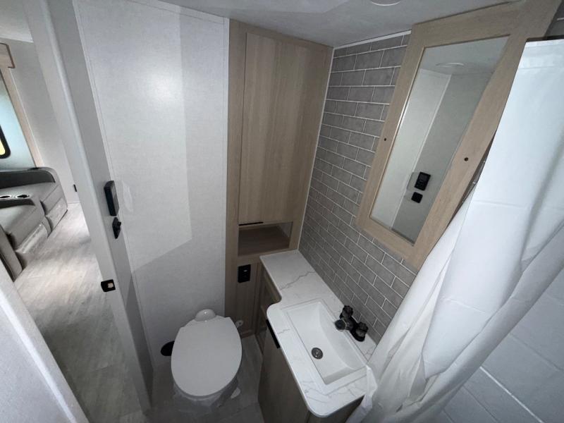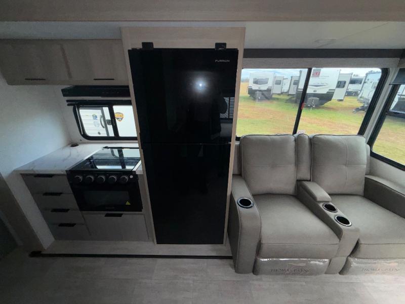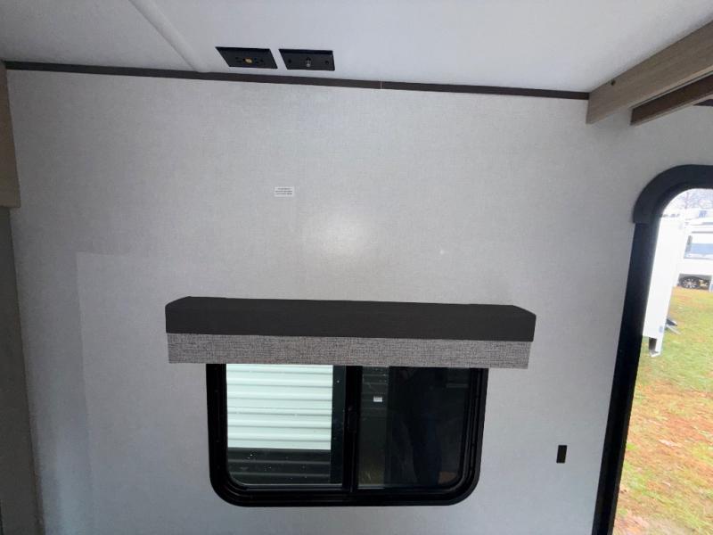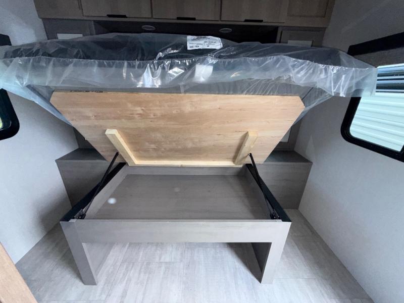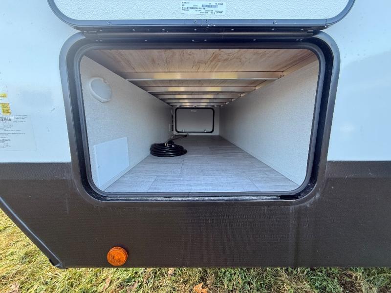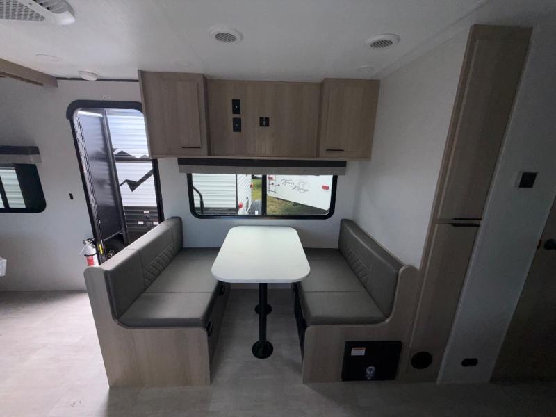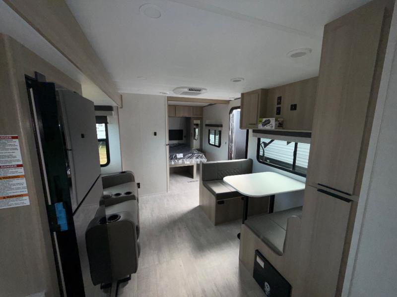 You'll love camping in this spacious travel trailer with a queen bed in the private bedroom, just like at home! The large slide out houses the theater seating and kitchen appliances, and there is a booth dinette across from the slide where you can dine at. The back of this unit includes ample counter space and a sink to clean dishes, plus a full bath with a shower, toilet, and linen closet for towels. You will also love the fiberglass exterior of this travel trailer for a sleeker look!
