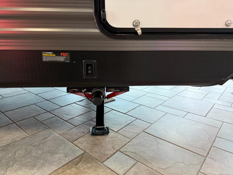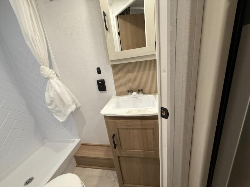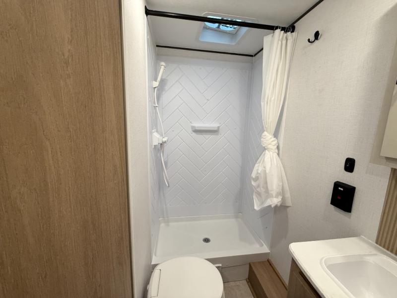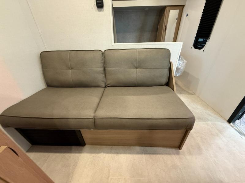 Load up for a fun weekend or long vacation with this trailer in tow! Whether you camp close or far away, you will have eight to nine sleeping spaces thanks to the residential queen bed in the semi-private bedroom, the double-size bunks near the rear corner bathroom, and the furniture in the middle. Everyone can take turns getting dressed in either the full bathroom, or front bedroom once the privacy curtain is closed. There is plenty of storage found throughout in the closets, overhead cabinets, and along the exterior in the pass-through compartment for those longer items. And the 14' power awning with LED lights gives you an outdoor living space protected from the elements, so just add your own camping chairs and such.