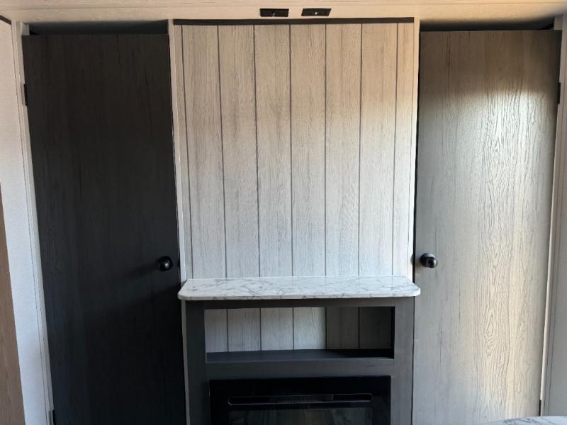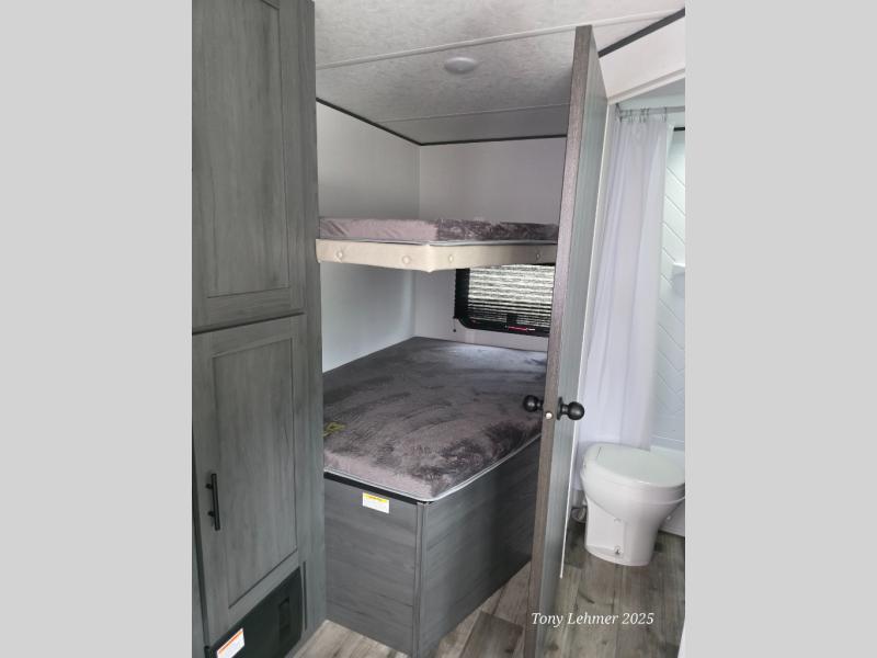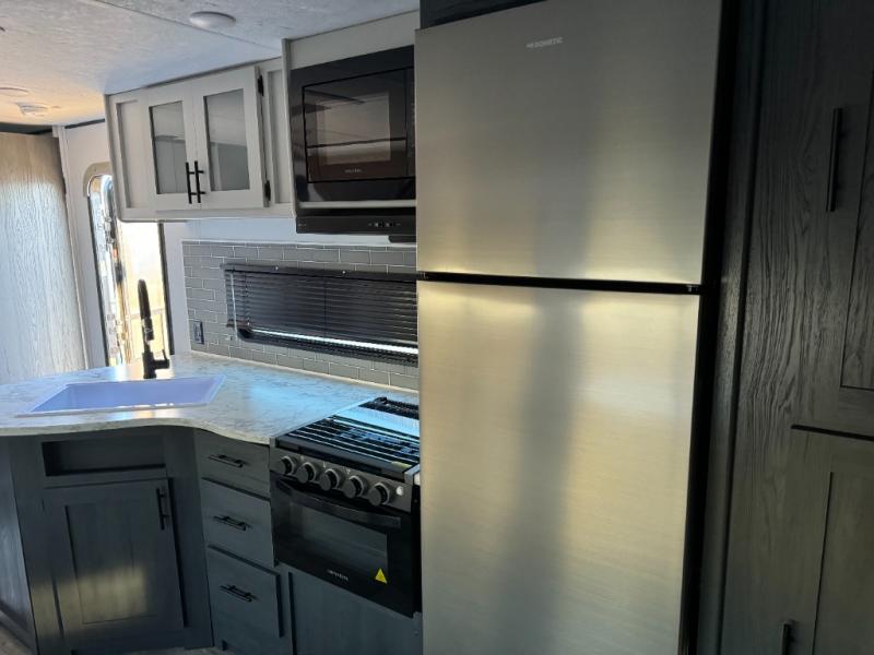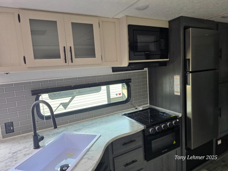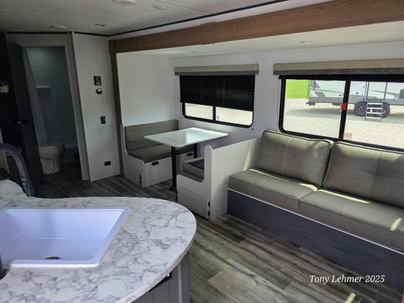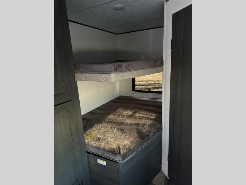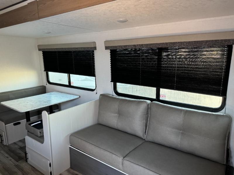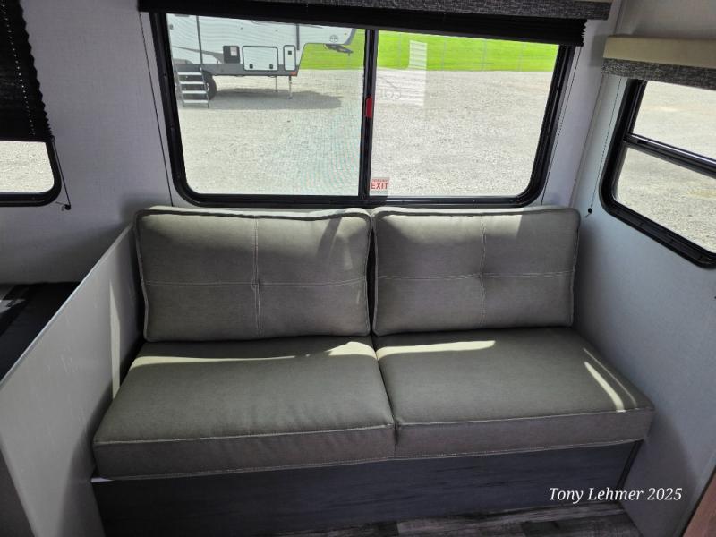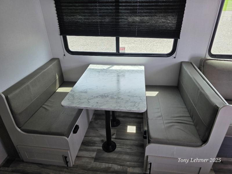 When you camp with your family you still need privacy, and this travel trailer will deliver that with the front bedroom with dual entry doors! Here, you'll find a residential queen bed with closets on each side and windows for some natural lighting. The main living and kitchen area offers a large slide out with a booth dinette and jack knife sofa with a foot rest and your guests can sleep here as well as the double-size bunks. The kitchen offers everything at the cook's fingertips to keep everyone fed, plus there is an outdoor griddle for breakfast outside. You'll also enjoy the 16' power awning with LED lights and the pass-through storage where fishing poles can be stored!