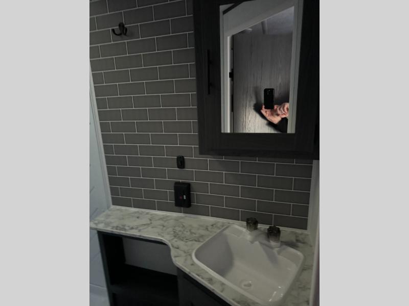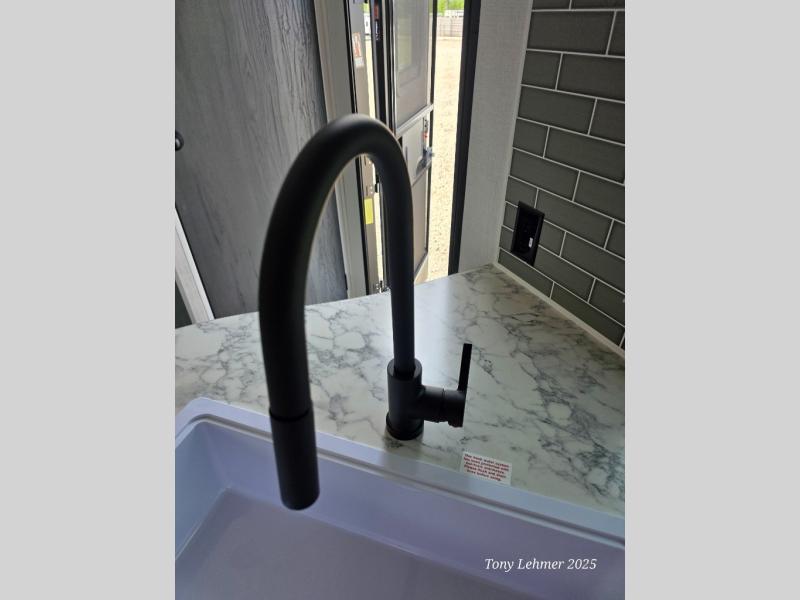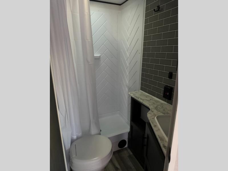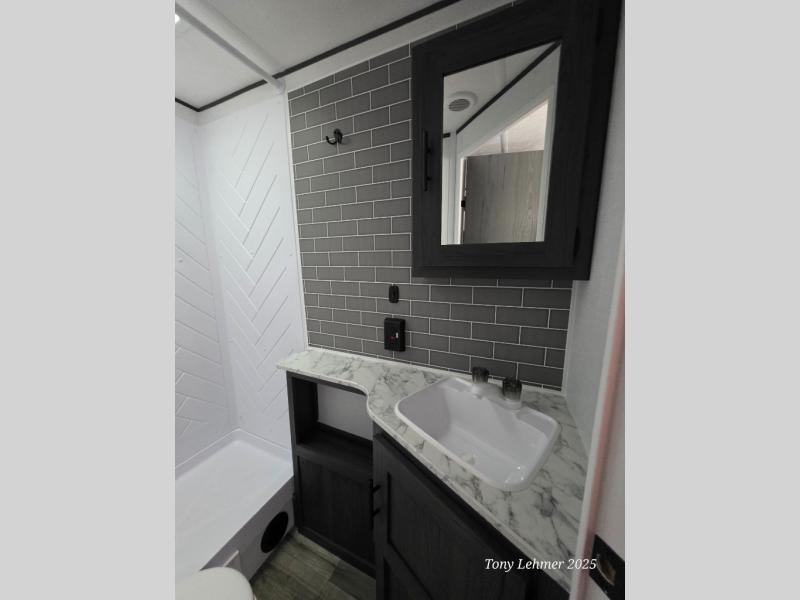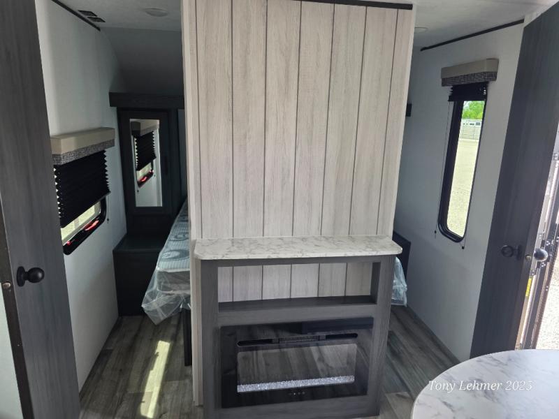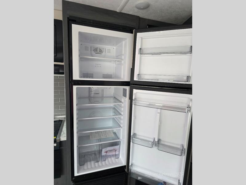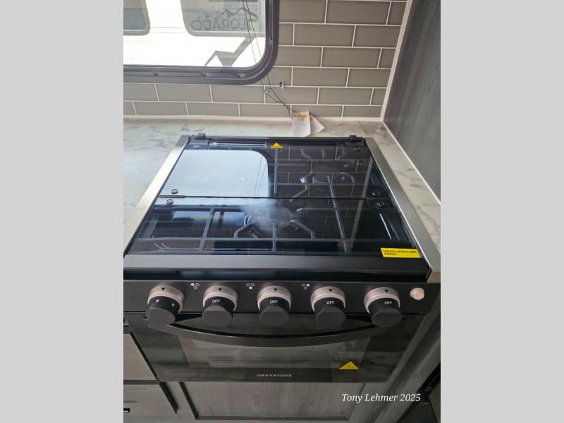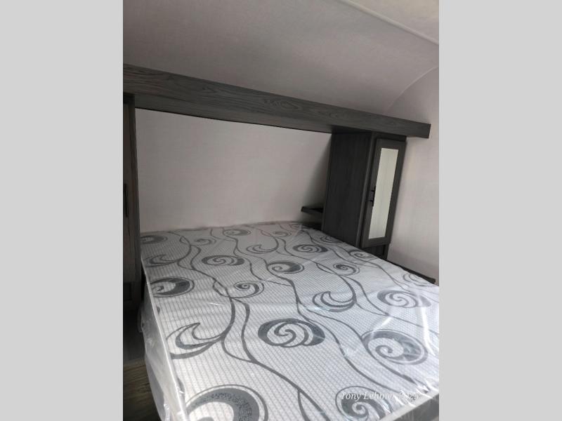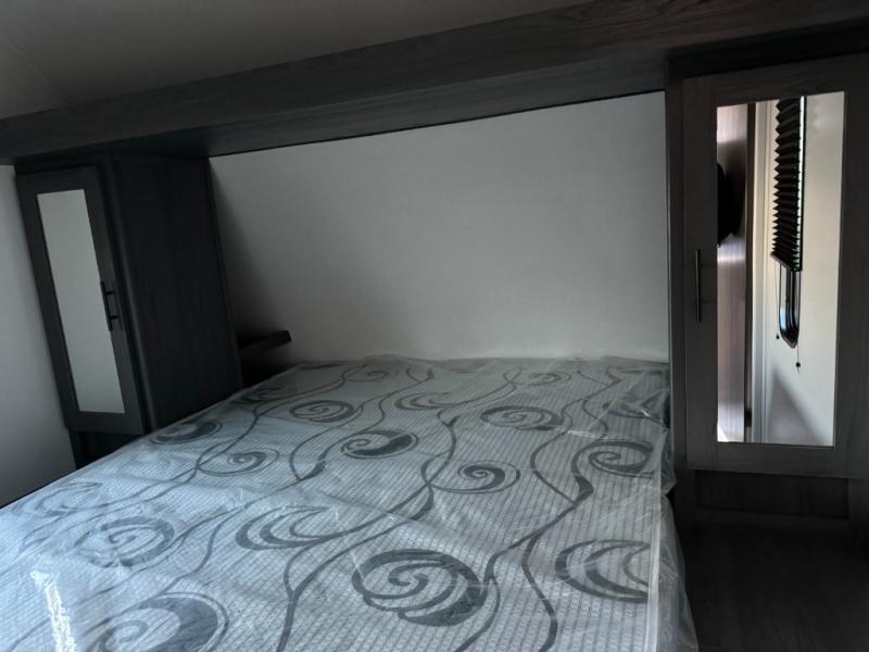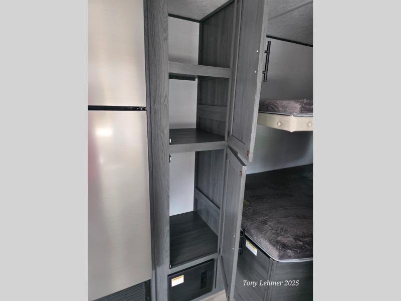 When you camp with your family you still need privacy, and this travel trailer will deliver that with the front bedroom with dual entry doors! Here, you'll find a residential queen bed with closets on each side and windows for some natural lighting. The main living and kitchen area offers a large slide out with a booth dinette and jack knife sofa with a foot rest and your guests can sleep here as well as the double-size bunks. The kitchen offers everything at the cook's fingertips to keep everyone fed, plus there is an outdoor griddle for breakfast outside. You'll also enjoy the 16' power awning with LED lights and the pass-through storage where fishing poles can be stored!