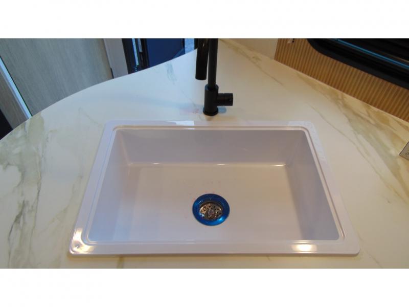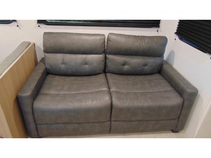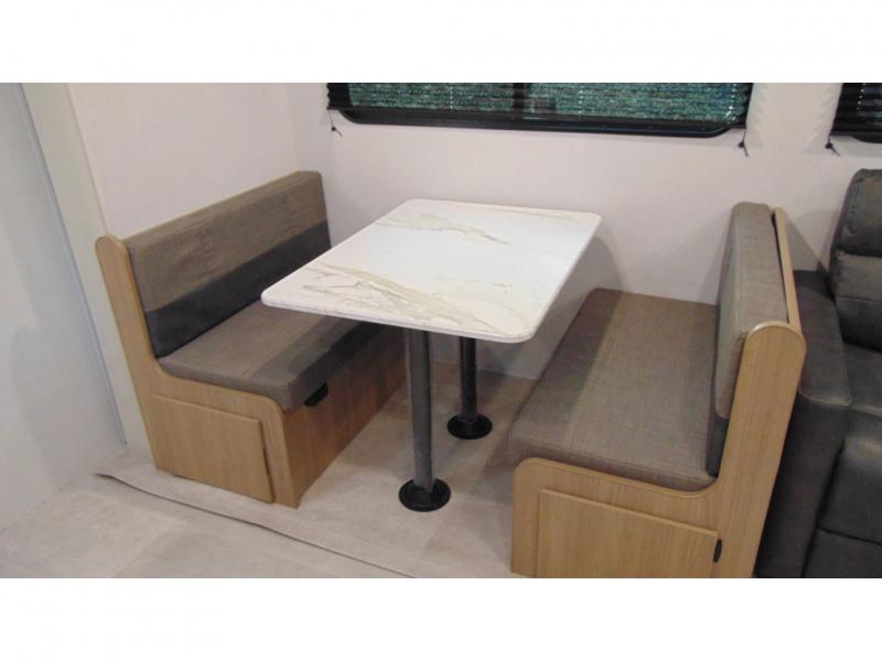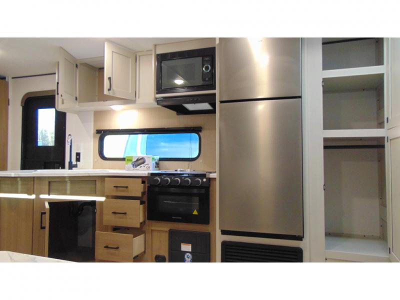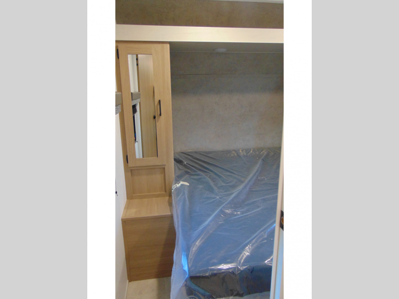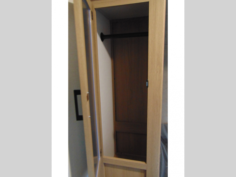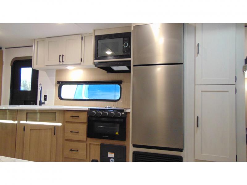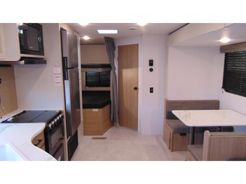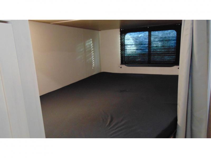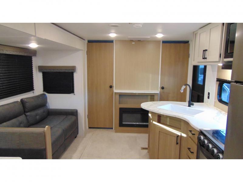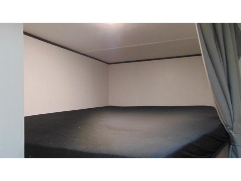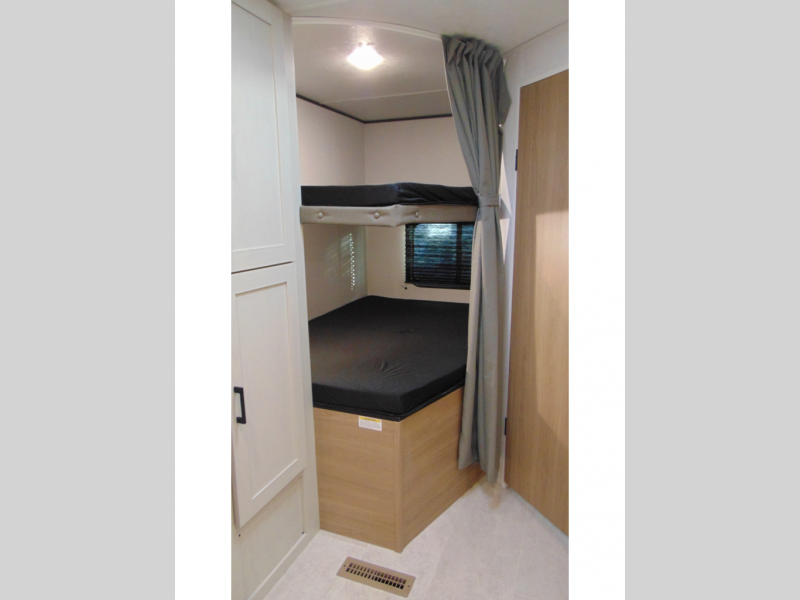 When you camp with your family you still need privacy, and this travel trailer will deliver that with the front bedroom with dual entry doors! Here, you'll find a residential queen bed with closets on each side and windows for some natural lighting. The main living and kitchen area offers a large slide out with a booth dinette and jack knife sofa with a footrest and your guests can sleep here as well as the double-size bunks. You'll also enjoy the 16' awning and the pass-through storage where fishing poles can be stored!
