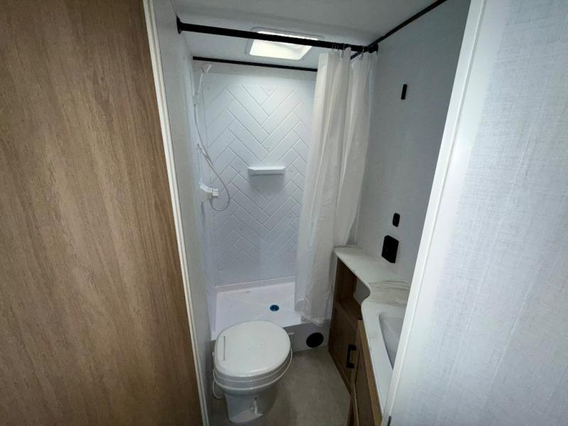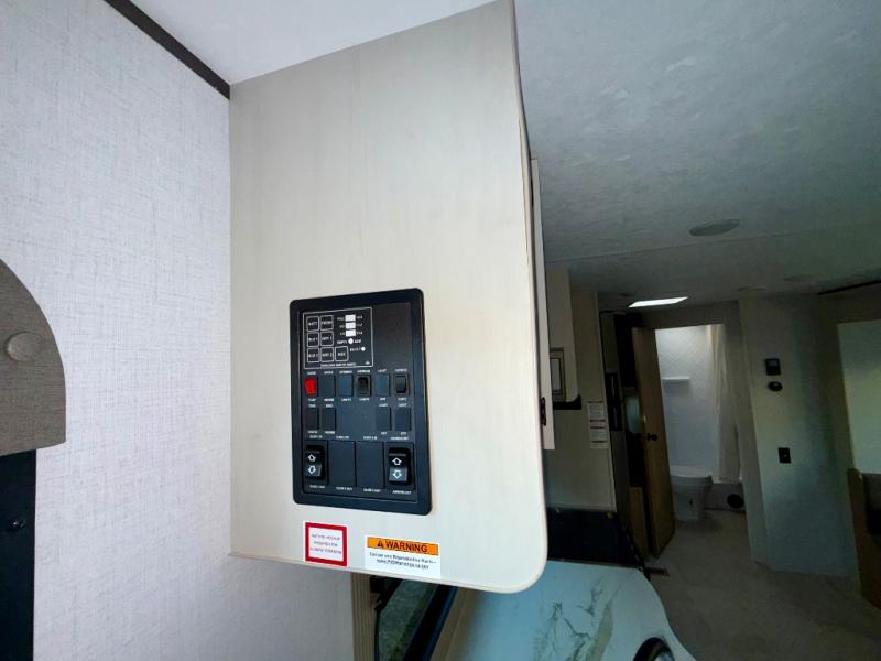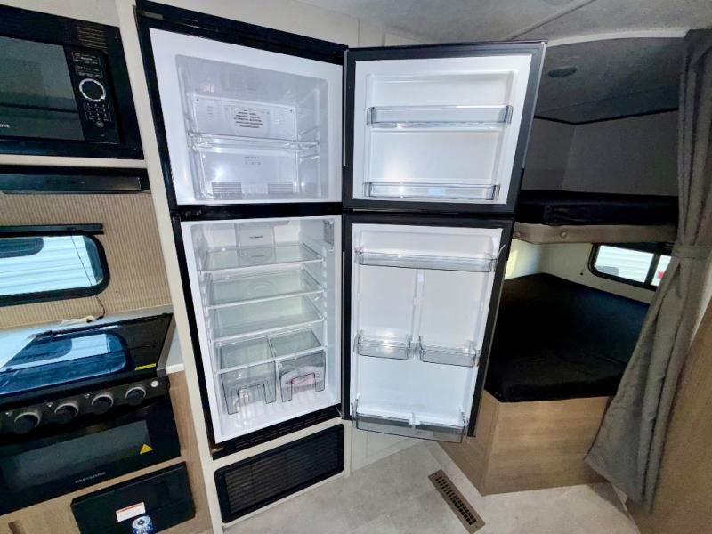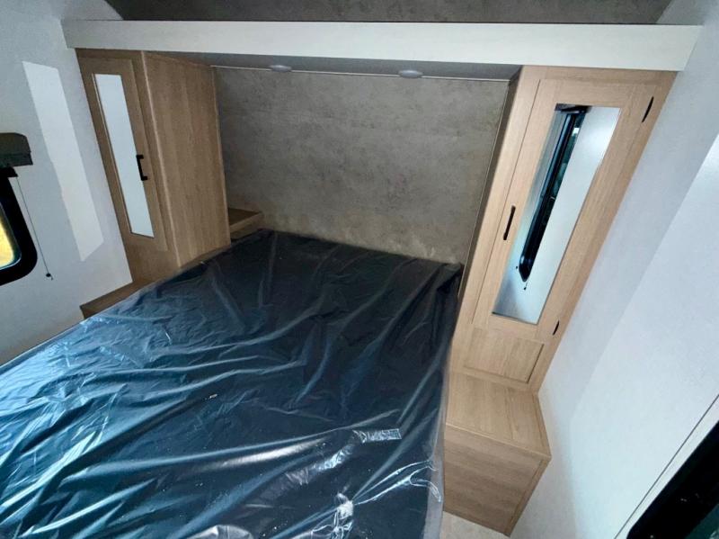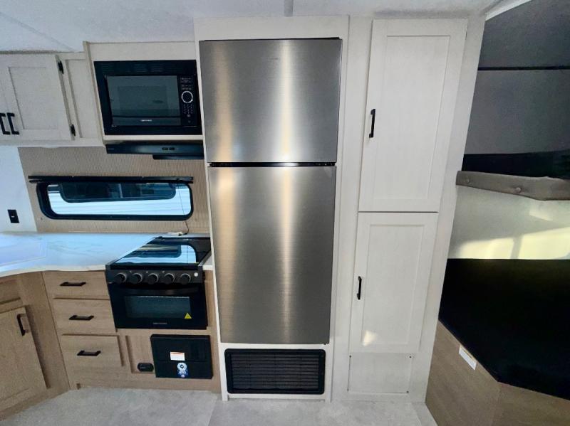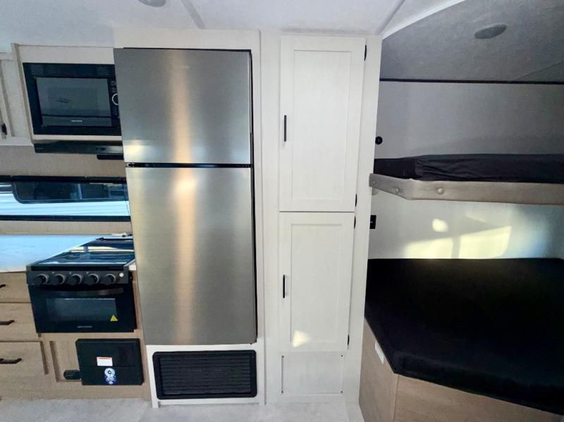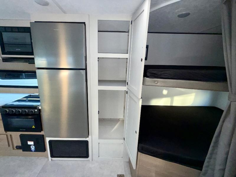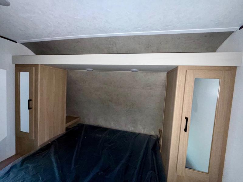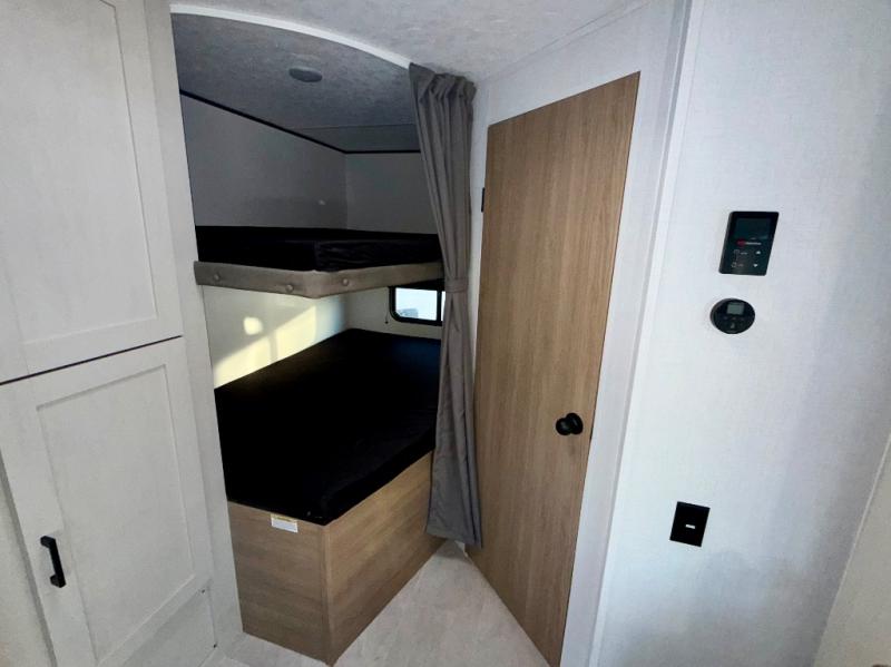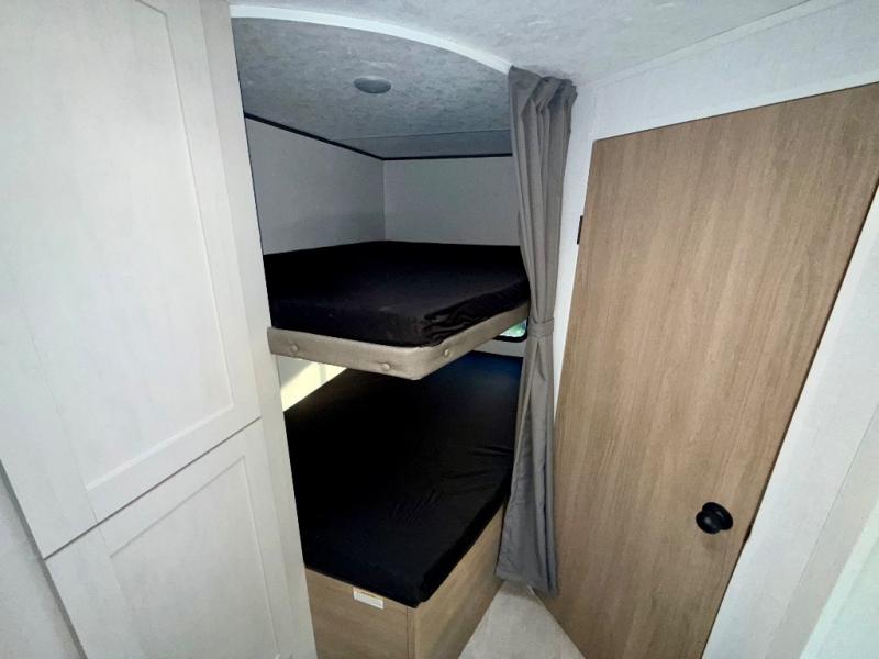 When you camp with your family you still need privacy, and this travel trailer will deliver that with the front bedroom with dual entry doors! Here, you'll find a residential queen bed with closets on each side and windows for some natural lighting. The main living and kitchen area offers a large slide out with a booth dinette and jack knife sofa with a footrest and your guests can sleep here as well as the double-size bunks. You'll also enjoy the 16' awning and the pass-through storage where fishing poles can be stored!