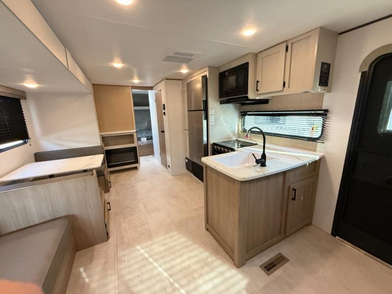 You'll love everything about this dual entry travel trailer, from the dual lounge chairs in the back to the queen bed in the front private bedroom! There are also dual bedroom closets to keep your clothes wrinkle free and one of the dual entry doors are here so you can quietly slip out in the mornings. Once you get back from fishing, you can prepare lunch on the three burner cooktop or in the microwave oven, and there is a 10 cu. ft. 12V refrigerator here to keep perishables fresh. There is also a full bath with a shower and an exhaust fan to keep everything fresh! When you're ready to relax in the evenings, you'll enjoy the jackknife sofa with a foot rest and the booth dinette, and the fireplace is sure to make your space feel like home!