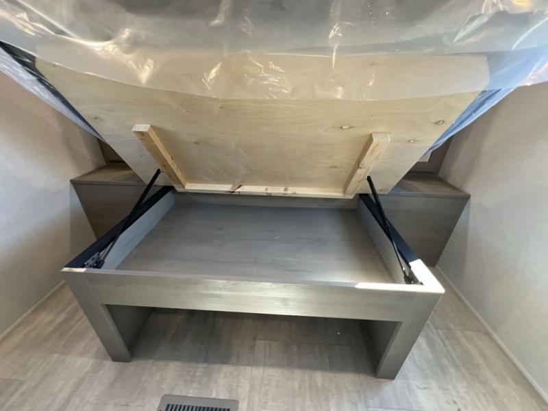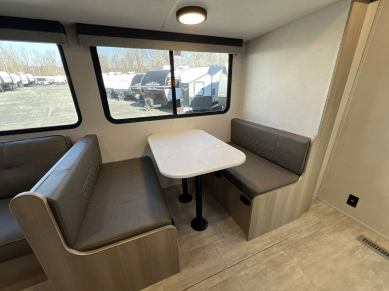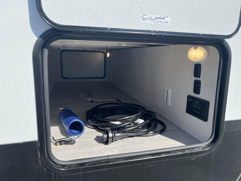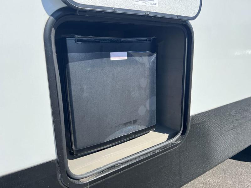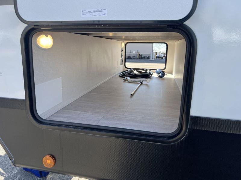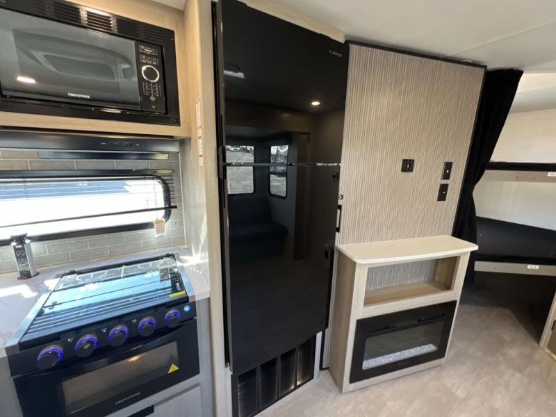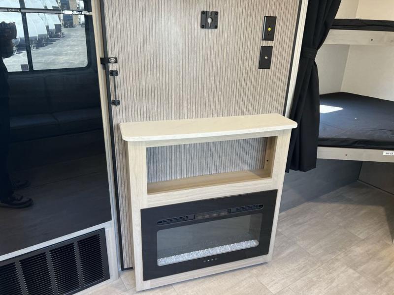 Your whole family will have a good time in this travel trailer! You can easily set up the 14' awning, grab your camp chairs from the pass-through storage, and start making meals using the inside kitchen amenities like a refrigerator and three burner range. After mealtime, you can play games at the booth dinette before getting cleaned up in the full corner bathroom. The kids or guests can have their own double-size bunk beds, and you will love having a front residential queen bed at night. There is even a hinged entertainment center with a fireplace and a hidden pantry behind it to conveniently grab a snack and set up a movie!