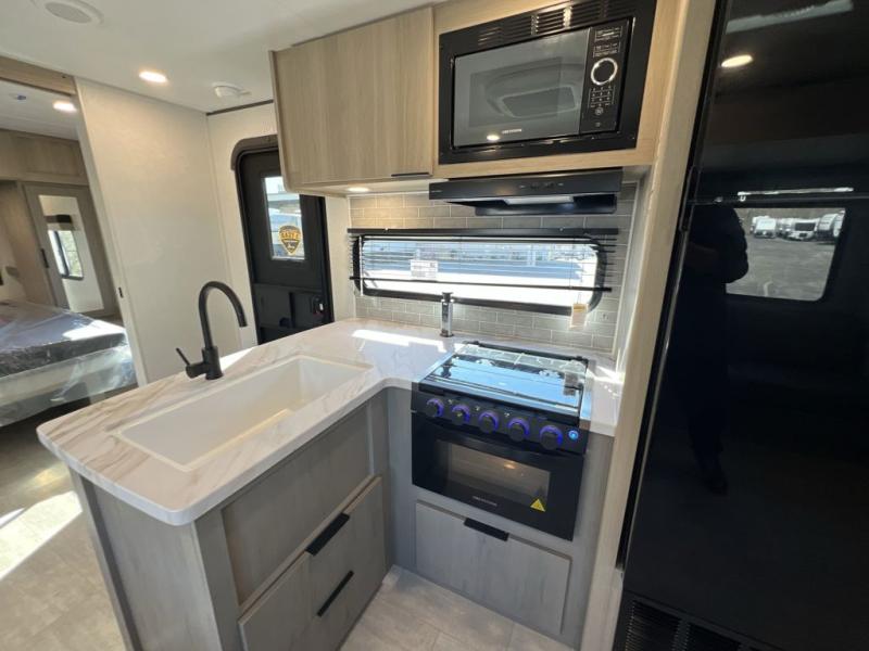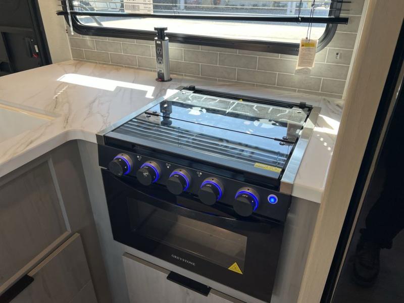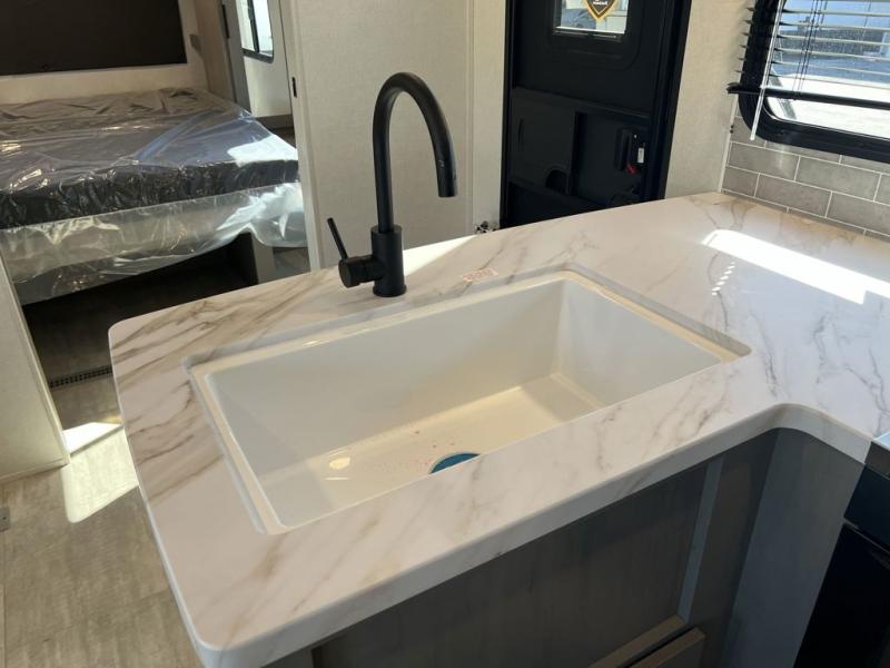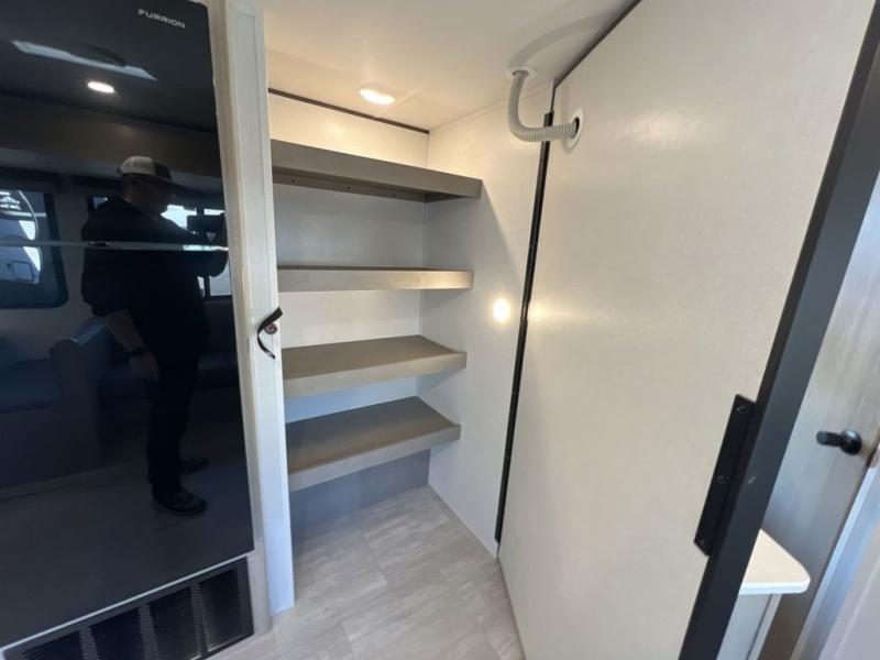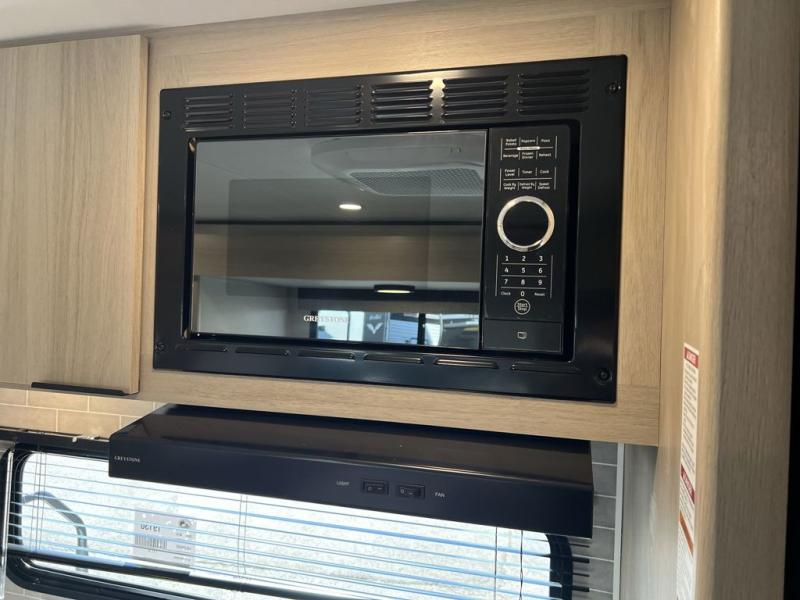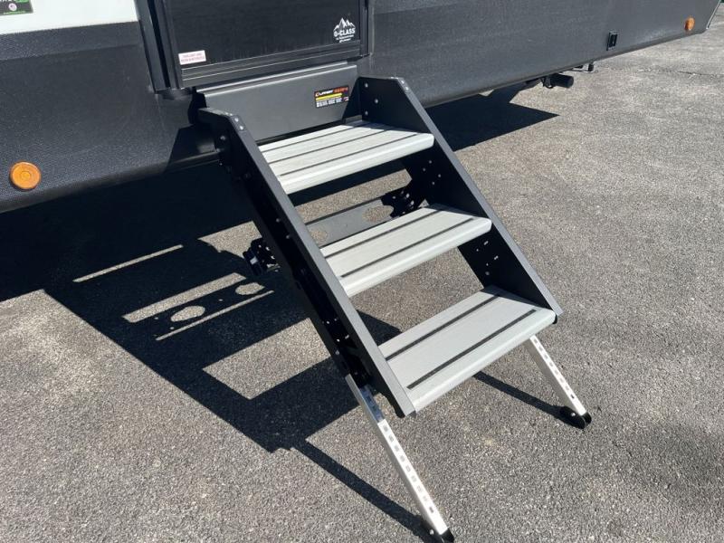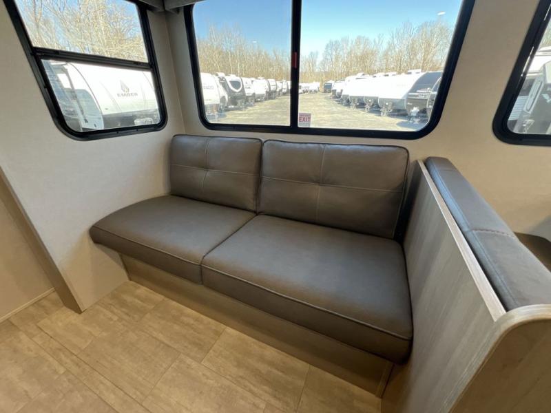 Your whole family will have a good time in this travel trailer! You can easily set up the 14' awning, grab your camp chairs from the pass-through storage, and start making meals using the inside kitchen amenities like a refrigerator and three burner range. After mealtime, you can play games at the booth dinette before getting cleaned up in the full corner bathroom. The kids or guests can have their own double-size bunk beds, and you will love having a front residential queen bed at night. There is even a hinged entertainment center with a fireplace and a hidden pantry behind it to conveniently grab a snack and set up a movie!