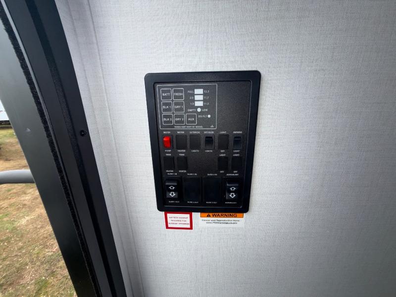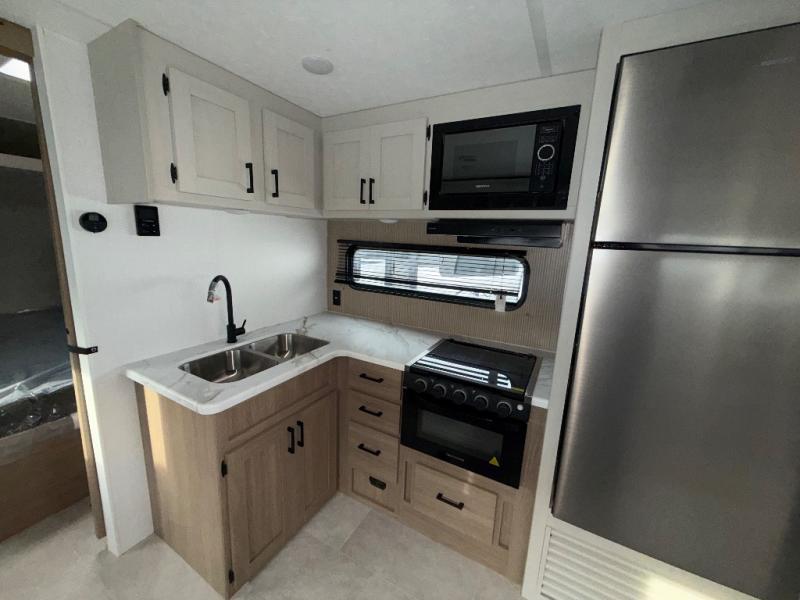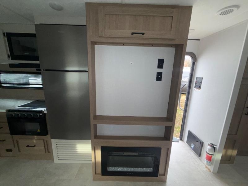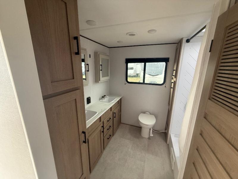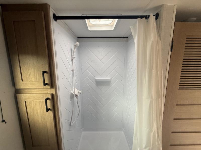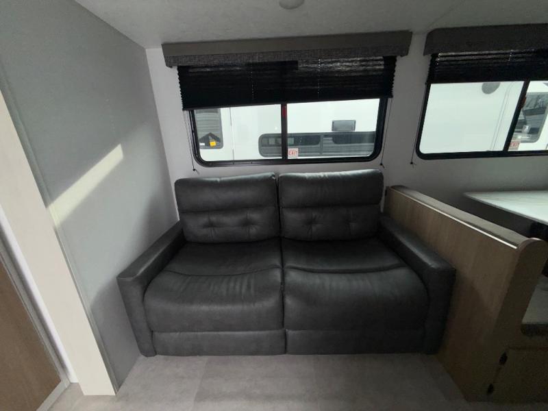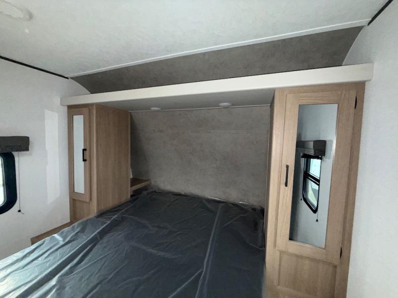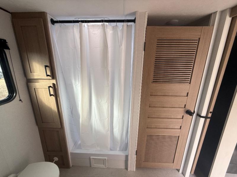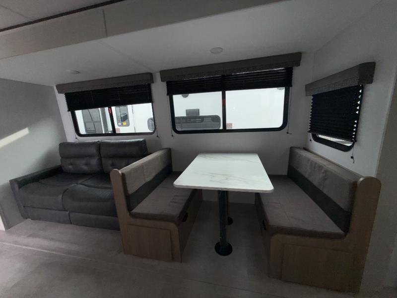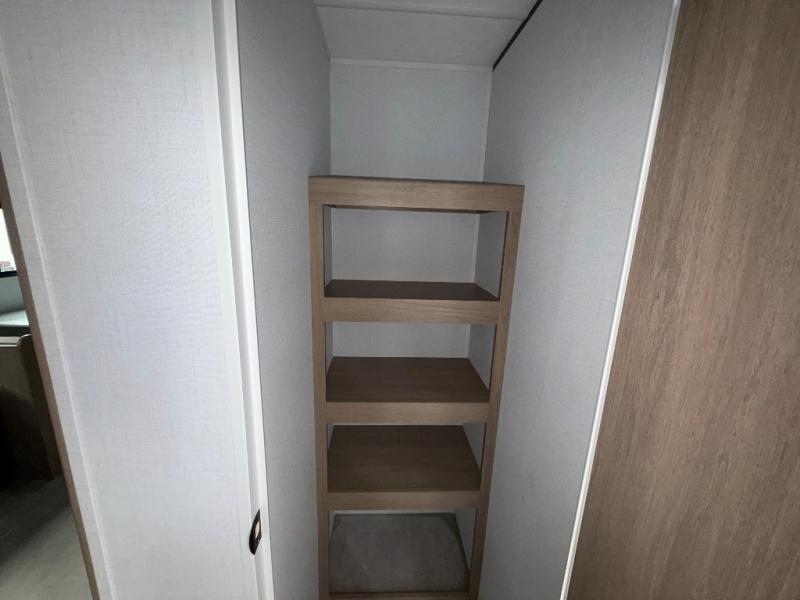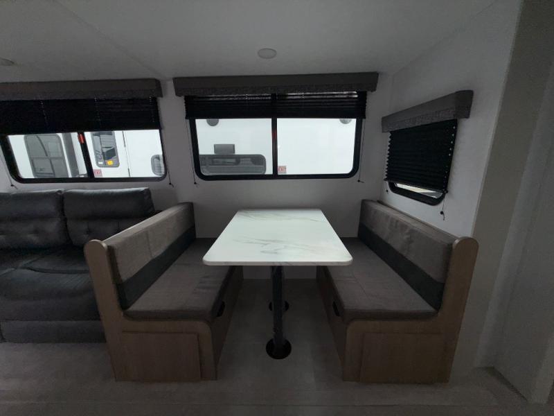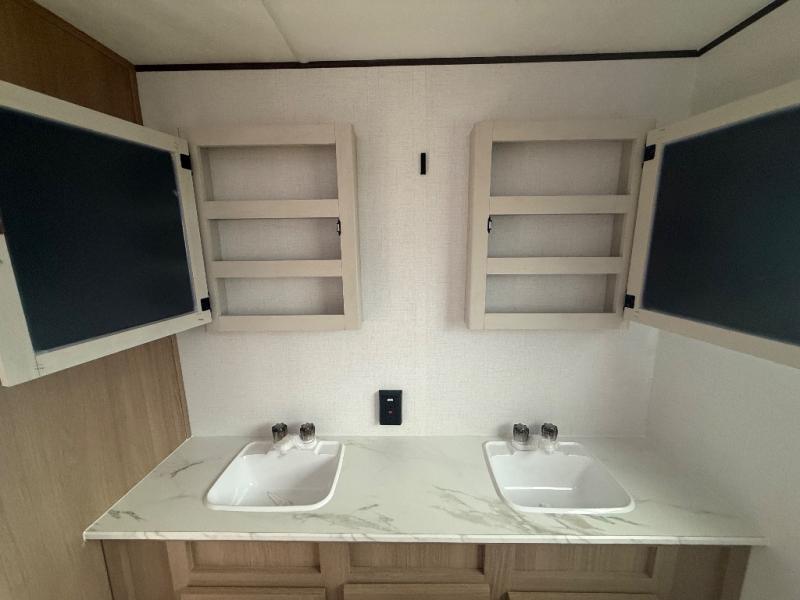 You'll love every minute spent in this spacious travel trailer! The front private bedroom includes a queen bed, dual closets, and an overhead shelf to keep your things organized. The U-shaped dinette and jack knife sofa within the large slide out in the living room can double as both seating space and sleeping space for guests. A full kitchen will let you make meals each day, and you'll appreciate the large pantry to keep snacks stocked. Head to the full rear bath to enjoy ample space to get ready, dual bath sinks, plus a linen closet with washer and dryer prep if you want to add these appliances.