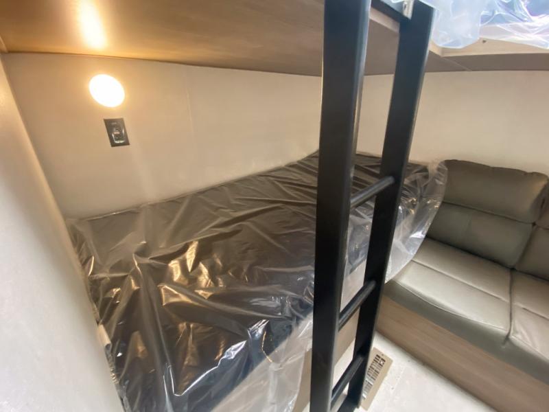 When you enjoy hosting family and friends, this bunkhouse trailer makes sense! You will be able to offer them a private bunkhouse with triple bunks and seating that doubles as sleeping space and/or the living room furniture to sleep on. Your oasis will be in the front bedroom which includes your own residential queen bed and plenty of storage for your clothes and things. The central living area offers seating, dining and cooking amenities, plus a full bathroom which is super convenient.