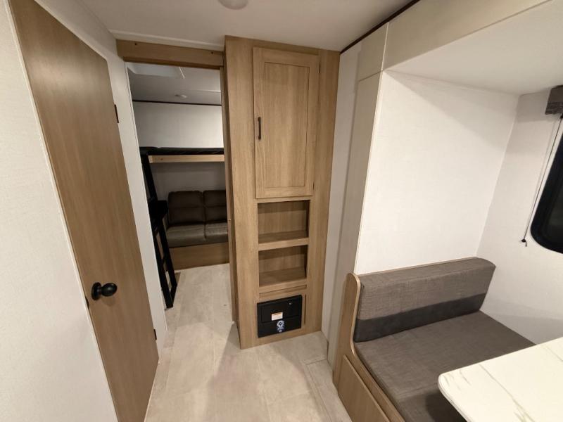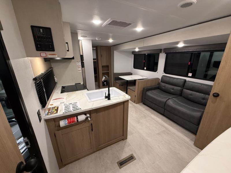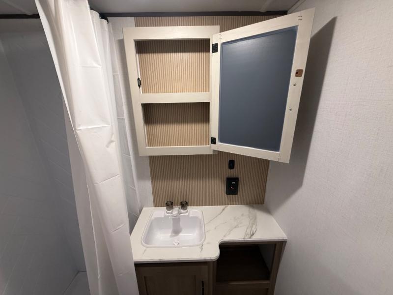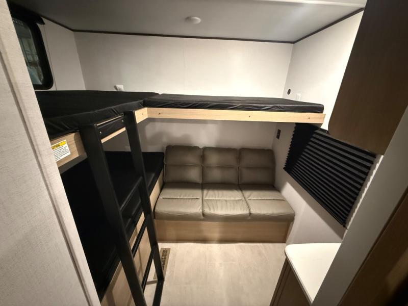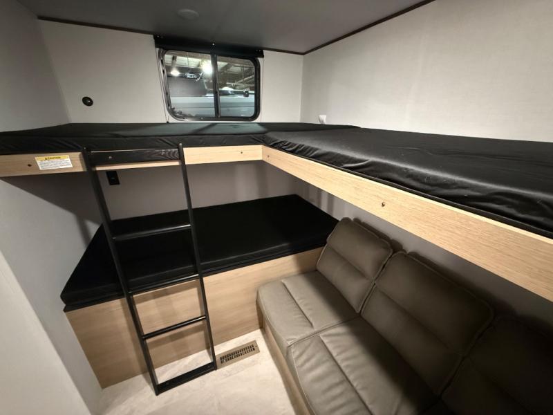 When you enjoy hosting family and friends, this bunkhouse trailer makes sense! You will be able to offer them a private bunkhouse with triple bunks and seating that doubles as sleeping space and/or the living room furniture to sleep on. Your oasis will be in the front bedroom which includes your own residential queen bed and plenty of storage for your clothes and things. The central living area offers seating, dining and cooking amenities, plus a full bathroom which is super convenient.