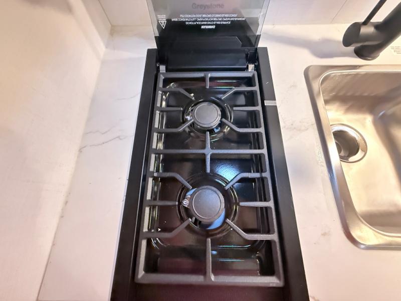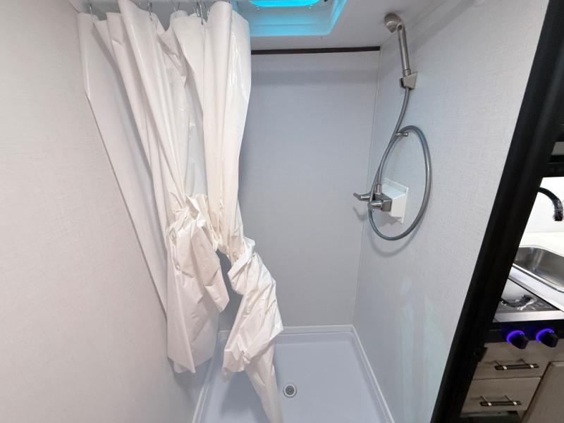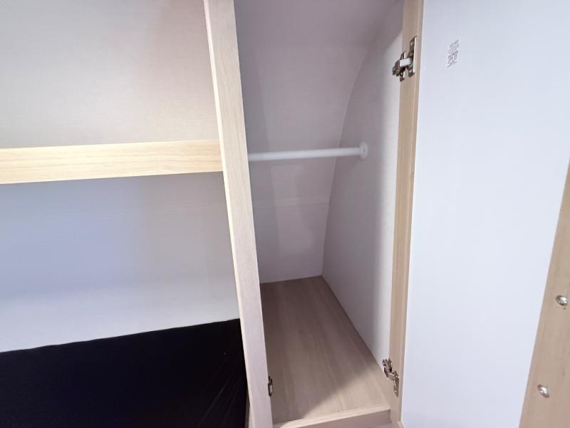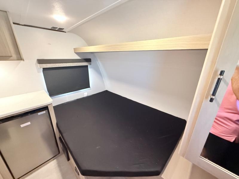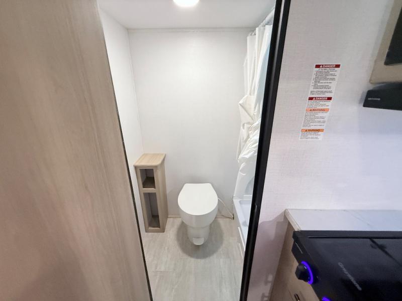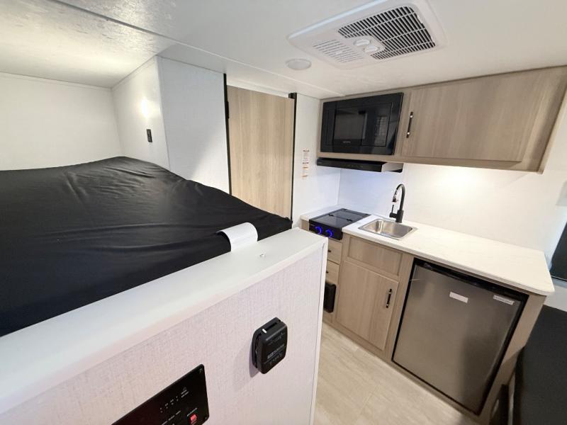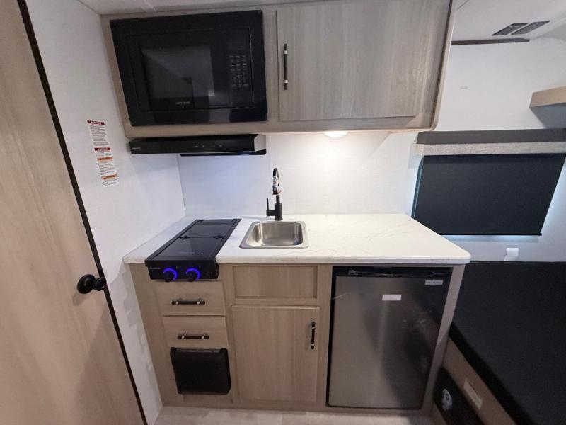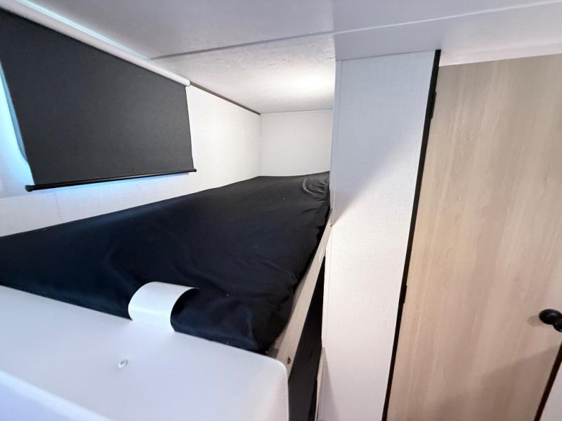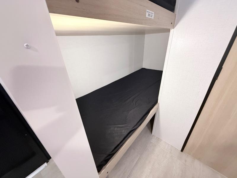 This family-friendly travel trailer is ideal for you! This model offers accommodations for all family members, starting with bunk beds for the kids (or kids at heart!), a queen bed for a comfortable night's sleep, and a private bathroom for personal convenience. Preparing meals has never been easier thanks to the two-burner cooktop, microwave for quick snacks, and a 3.3 cu. ft. refrigerator for keeping food and drinks fresh. You will be able to keep the RV organized due to an overhead cabinet for storing essentials, a closet for hanging clothes and gear, plus a pass-through storage for extra luggage or equipment.
