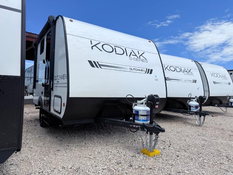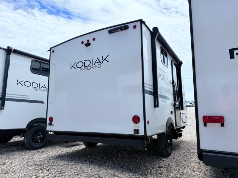 Each Kodiak travel trailer by Dutchmen includes a diamond front plate, easy lube axles, and a power tongue jack for hassle-free towing. The bear cave storage will allow you to bring along all the camp gear, and the power awning with an LED light will create an inviting outdoor space. Head inside to enjoy the designer valances, blackout roller shades, and seamless countertops. There is also HyperDeck flooring that will withstand your many adventures plus a 6' 8" interior height for more head room. A high output furnace and 13.5k BTU A/C will keep you comfortable, and the on-demand tankless water heater will provide instant hot water when you need it!