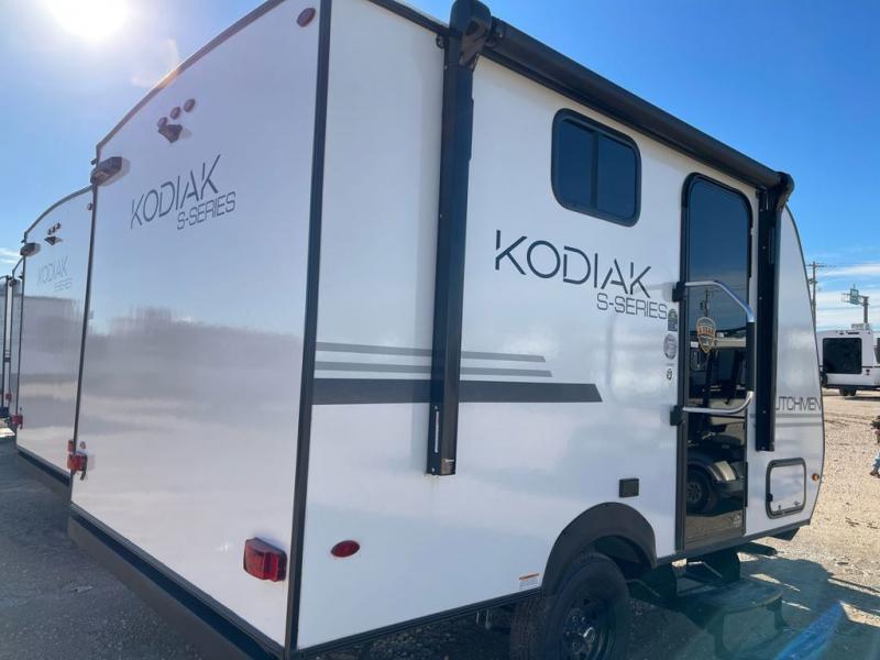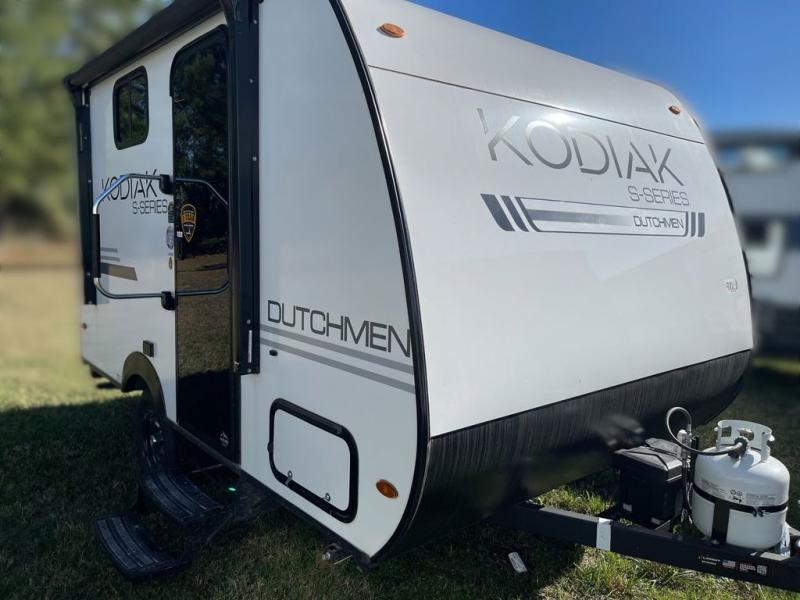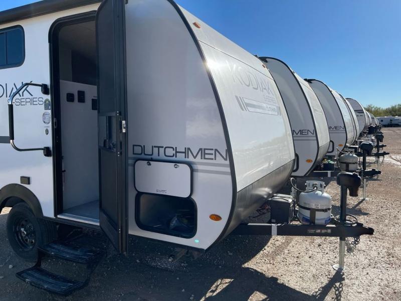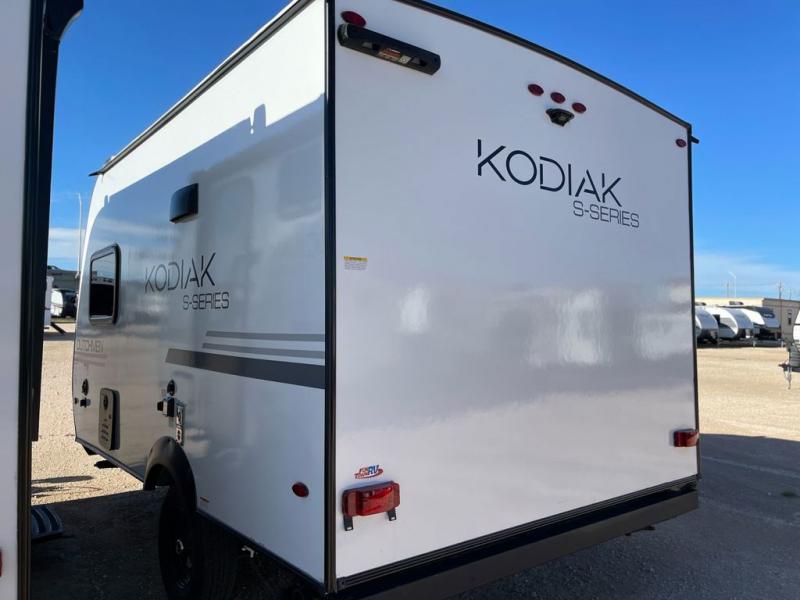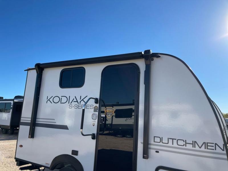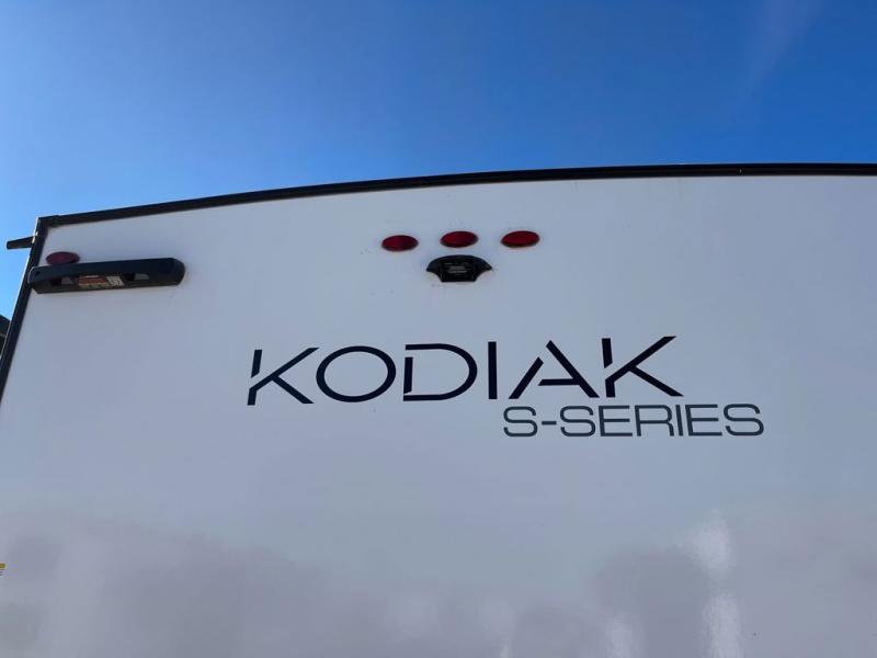 Each Kodiak travel trailer by Dutchmen includes a diamond front plate, easy lube axles, and a power tongue jack for hassle-free towing. The bear cave storage will allow you to bring along all the camp gear, and the power awning with an LED light will create an inviting outdoor space. Head inside to enjoy the designer valances, blackout roller shades, and seamless countertops. There is also HyperDeck flooring that will withstand your many adventures plus a 6' 8" interior height for more head room. A high output furnace and 13.5k BTU A/C will keep you comfortable, and the on-demand tankless water heater will provide instant hot water when you need it!