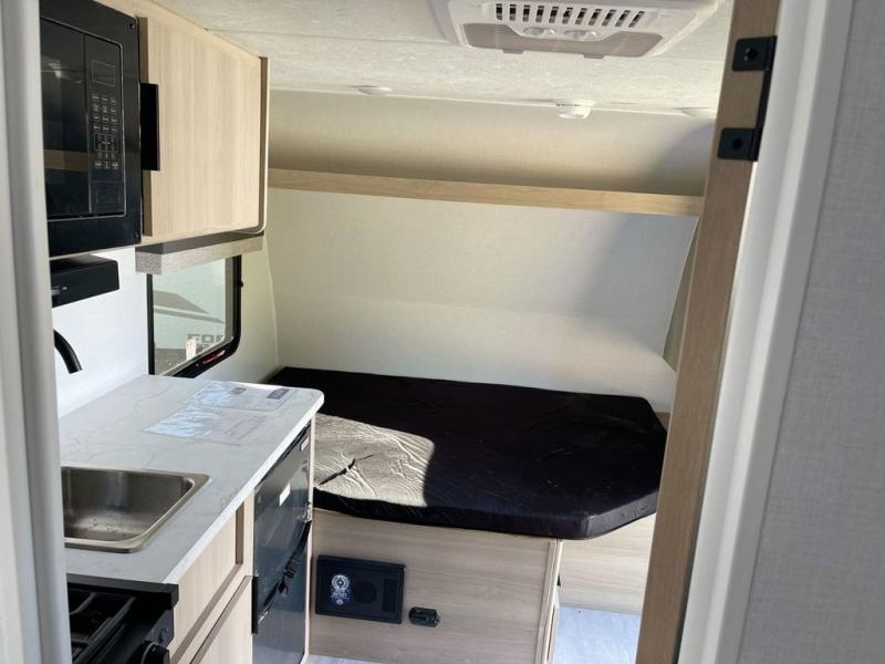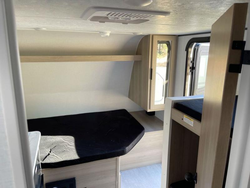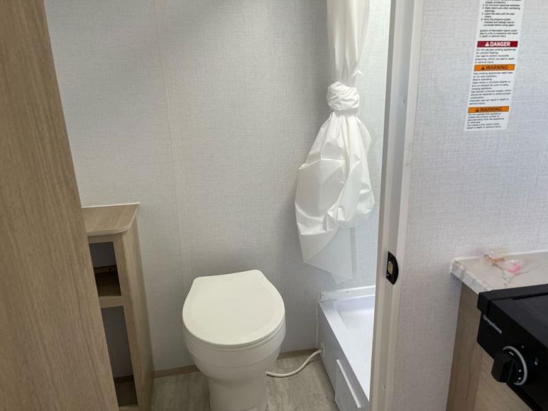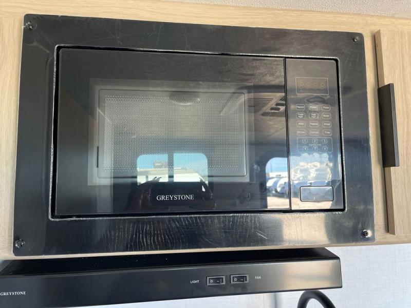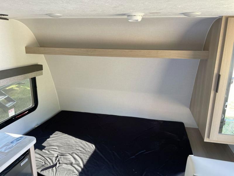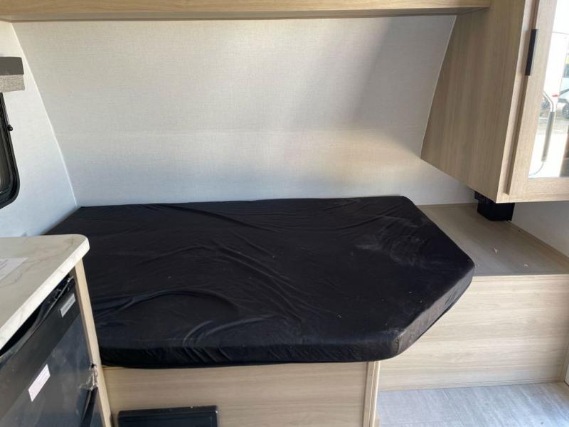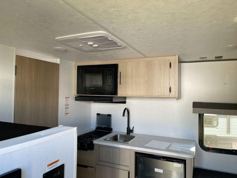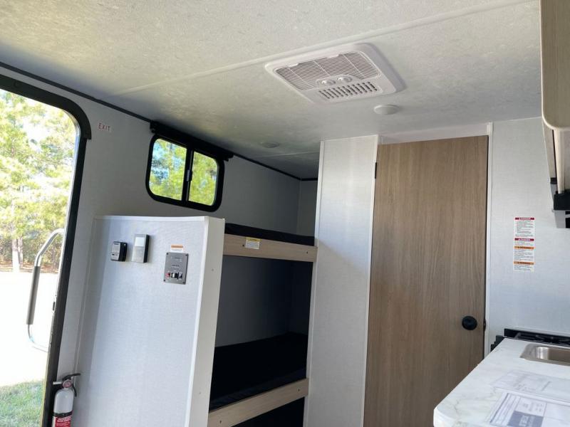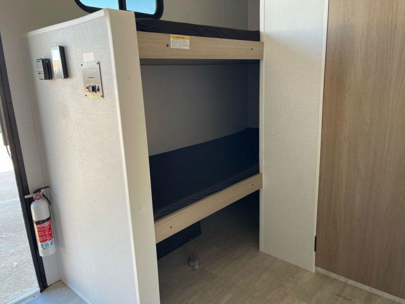 This family-friendly travel trailer is ideal for you! This model offers accommodations for all family members, starting with bunk beds for the kids (or kids at heart!), a queen bed for a comfortable night's sleep, and a private bathroom for personal convenience. Preparing meals has never been easier thanks to the two-burner cooktop, microwave for quick snacks, and a 3.3 cu. ft. refrigerator for keeping food and drinks fresh. You will be able to keep the RV organized due to an overhead cabinet for storing essentials, a closet for hanging clothes and gear, plus a pass-through storage for extra luggage or equipment.