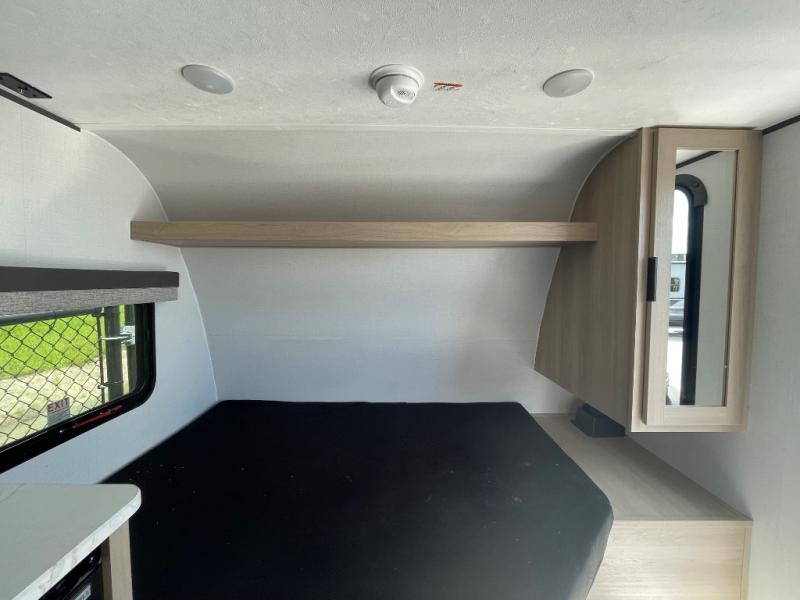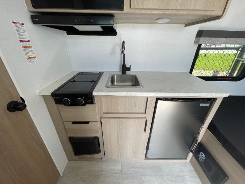 This family-friendly travel trailer is ideal for you! This model offers accommodations for all family members, starting with bunk beds for the kids (or kids at heart!), a queen bed for a comfortable night's sleep, and a private bathroom for personal convenience. Preparing meals has never been easier thanks to the two-burner cooktop, microwave for quick snacks, and a 3.3 cu. ft. refrigerator for keeping food and drinks fresh. You will be able to keep the RV organized due to an overhead cabinet for storing essentials, a closet for hanging clothes and gear, plus a pass-through storage for extra luggage or equipment.