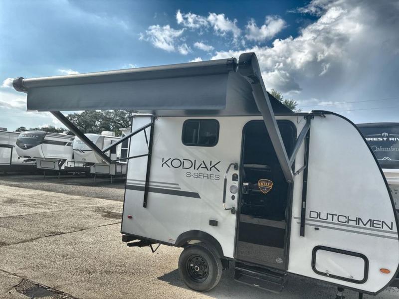Each Kodiak travel trailer by Dutchmen includes a diamond front plate, easy lube axles, and a power tongue jack for hassle-free towing. The bear cave storage will allow you to bring along all the camp gear, and the power awning with an LED light will create an inviting outdoor space. Head inside to enjoy the designer valances, blackout roller shades, and seamless countertops. There is also HyperDeck flooring that will withstand your many adventures plus a 6' 8" interior height for more head room. A high output furnace and 13.5k BTU A/C will keep you comfortable, and the on-demand tankless water heater will provide instant hot water when you need it!