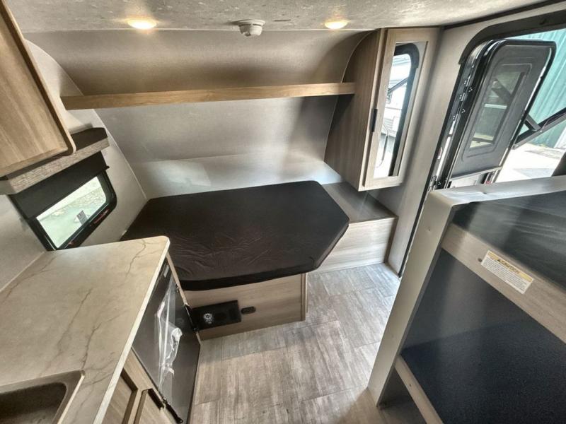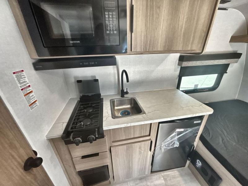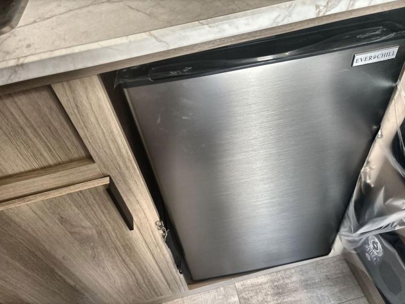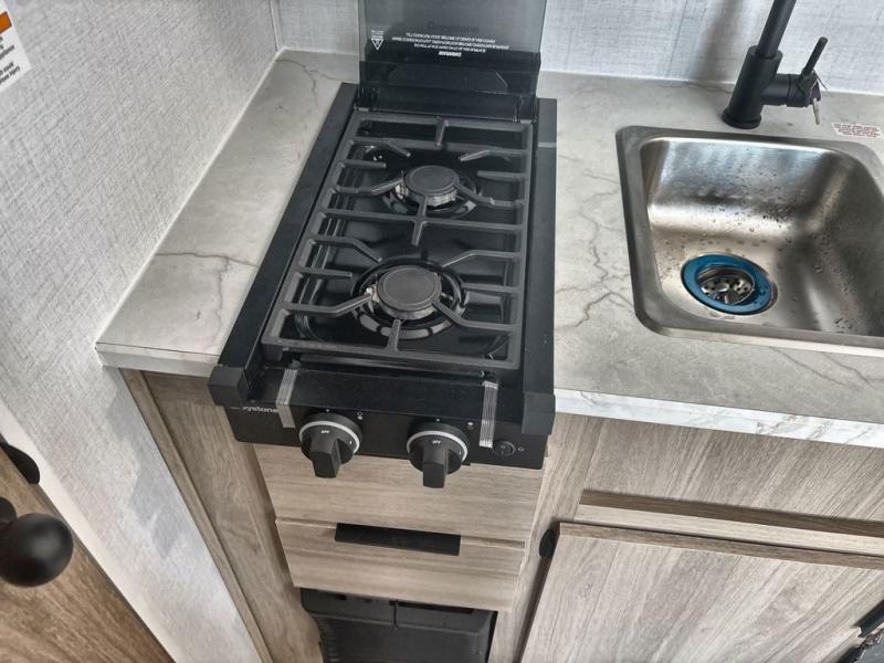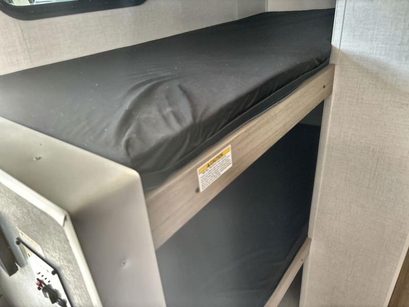 This family-friendly travel trailer is ideal for you! This model offers accommodations for all family members, starting with bunk beds for the kids (or kids at heart!), a queen bed for a comfortable night's sleep, and a private bathroom for personal convenience. Preparing meals has never been easier thanks to the two-burner cooktop, microwave for quick snacks, and a 3.3 cu. ft. refrigerator for keeping food and drinks fresh. You will be able to keep the RV organized due to an overhead cabinet for storing essentials, a closet for hanging clothes and gear, plus a pass-through storage for extra luggage or equipment.