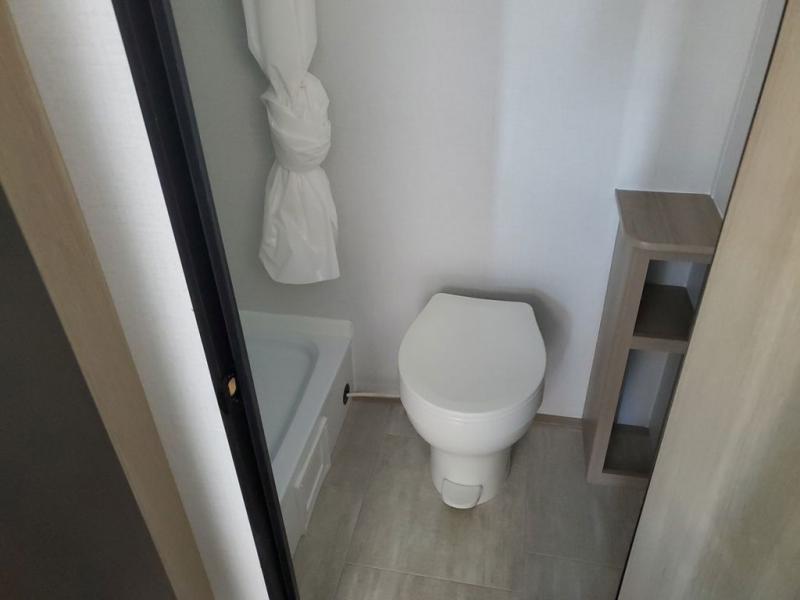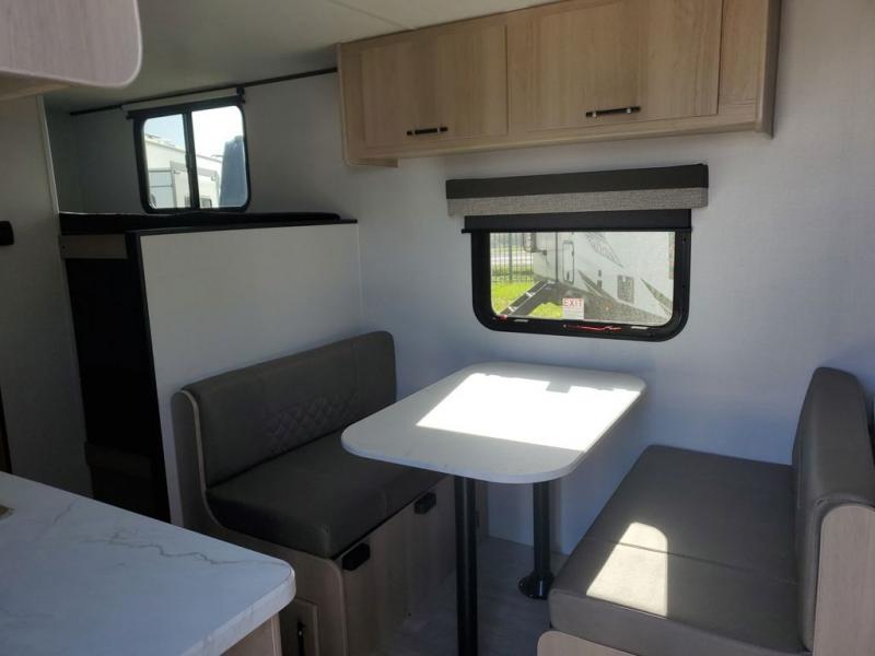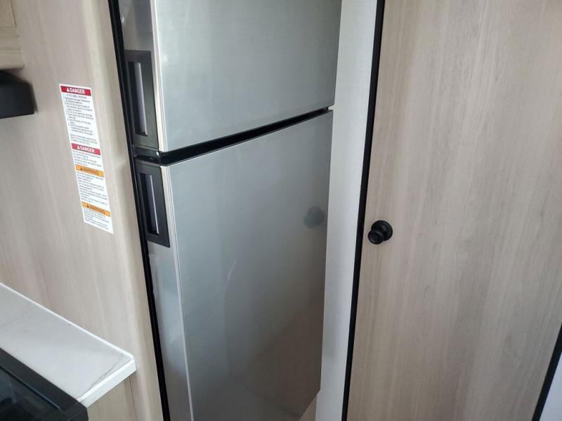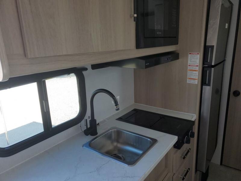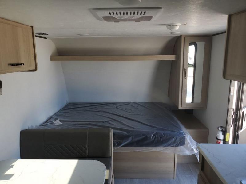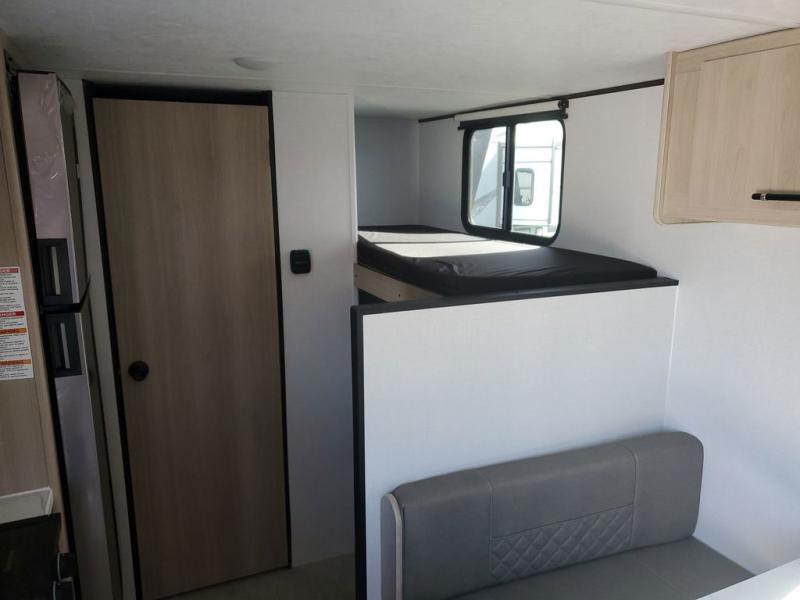 Luxurious travel trailer for the ultimate adventurer! This unit boasts spacious sleeping quarters, including bunk beds for kids or guests, and a plush queen bed for a restful night's sleep. Savor every meal with our premium kitchen features, including a microwave, two-burner cooktop, and spacious 10 cu. ft. refrigerator. The convenient amenities include a private bathroom with ample storage, an elegant booth dinette for meals or relaxation, overhead cabinets for organized storage, spacious closet for hanging clothes and gear, plus a pass-through storage for extra luggage or equipment.