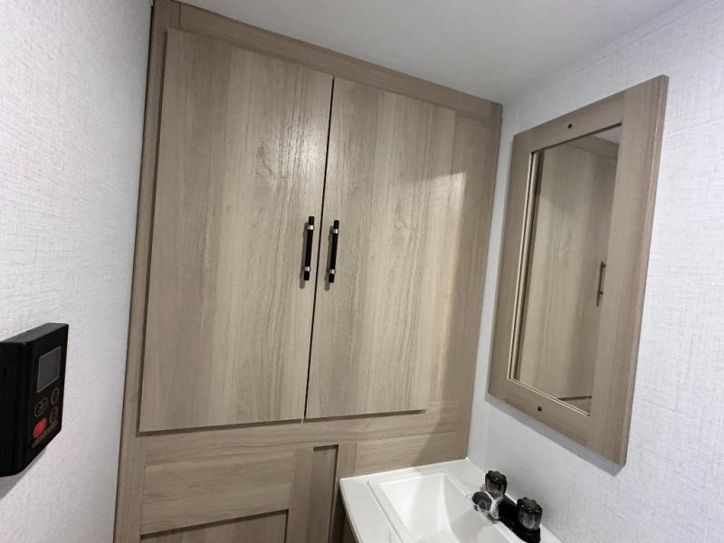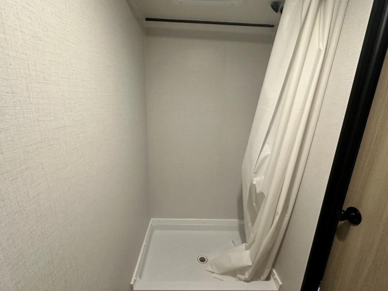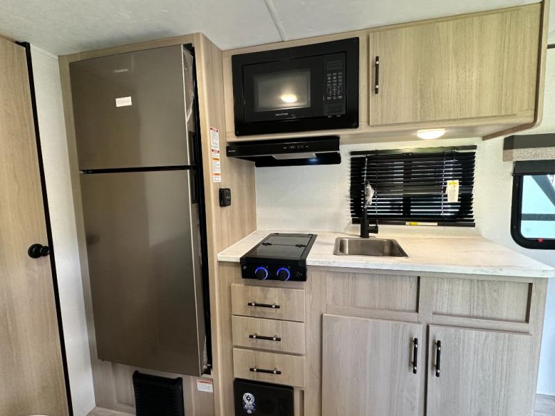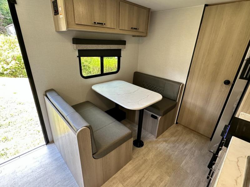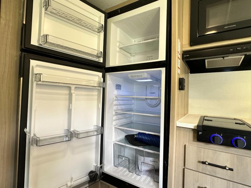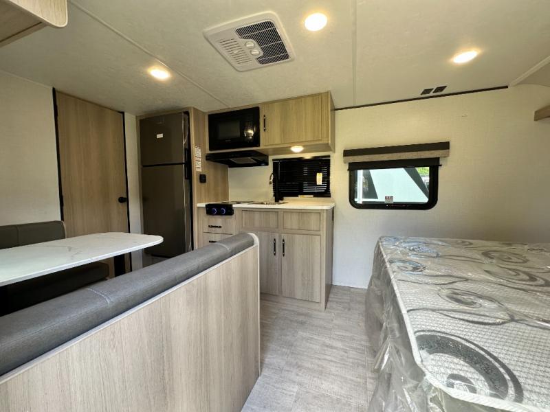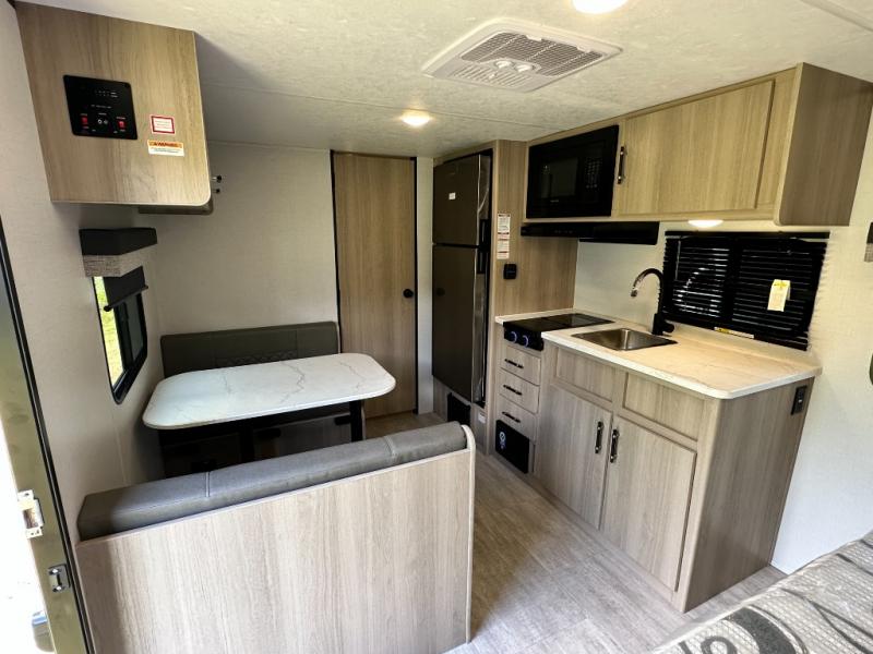 A full rear bathroom provides ample space and convenience for personal needs. The booth dinette is perfect for meals, games, or relaxation, offering a cozy and intimate atmosphere. The kitchen will be your favorite place from the unit, there is a 10 cu. ft. refrigerator for ample storage of food and drinks, a microwave for quick meals and snacks, and a two burner cooktop. Sleep like a baby in the queen bed which provides a restful night's sleep, while overhead cabinets offer convenient storage for essentials, Additionally, a spacious closet provides ample room for hanging clothes and gear, keeping your belongings organized and within reach.