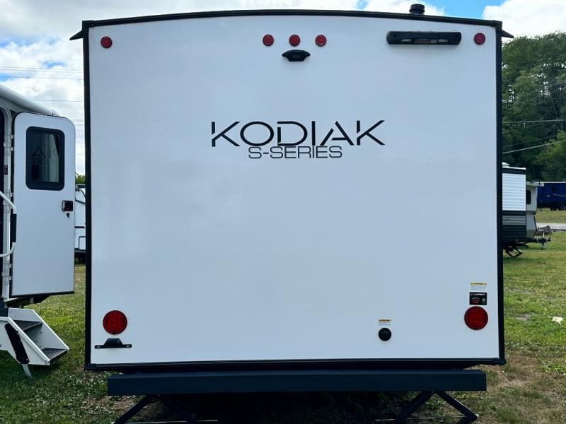 Each Kodiak travel trailer by Dutchmen includes a diamond front plate, easy lube axles, and a power tongue jack for hassle-free towing. The bear cave storage will allow you to bring along all the camp gear, and the power awning with an LED light will create an inviting outdoor space. Head inside to enjoy the designer valances, blackout roller shades, and seamless countertops. There is also HyperDeck flooring that will withstand your many adventures plus a 6' 8" interior height for more head room. A high output furnace and 13.5k BTU A/C will keep you comfortable, and the on-demand tankless water heater will provide instant hot water when you need it!