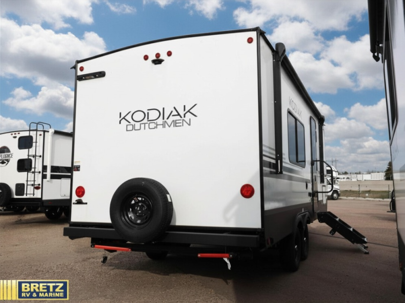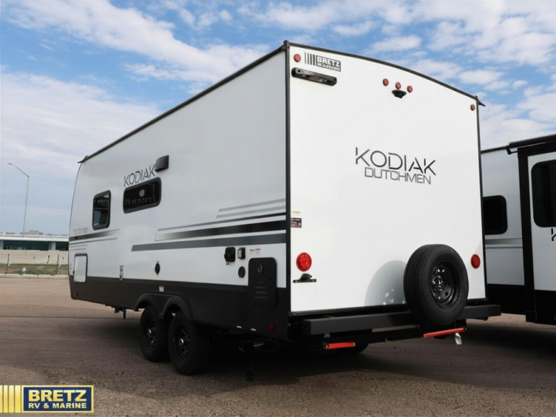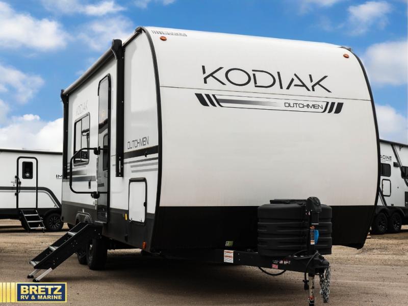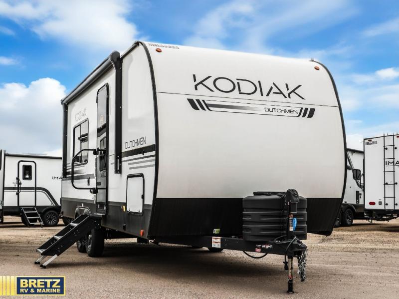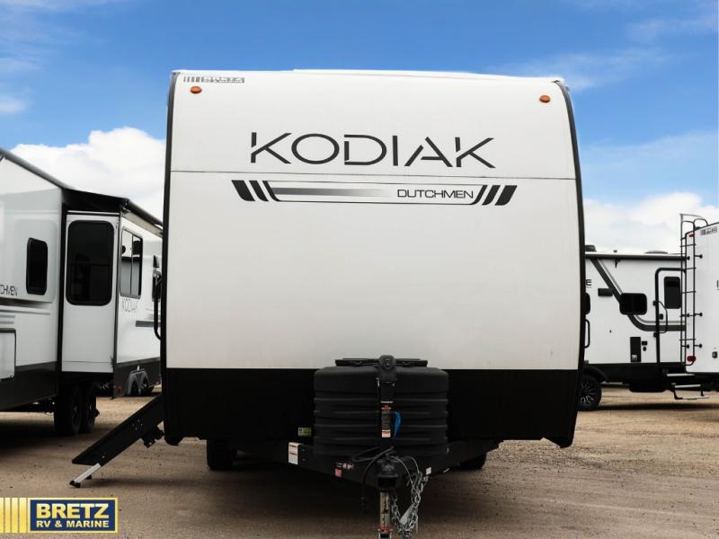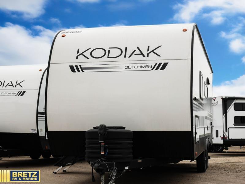 Each Kodiak travel trailer by Dutchmen includes a diamond front plate, easy lube axles, and a power tongue jack for hassle-free towing. The bear cave storage will allow you to bring along all the camp gear, and the power awning with an LED light will create an inviting outdoor space. Head inside to enjoy the designer valances, blackout roller shades, and seamless countertops. There is also HyperDeck flooring that will withstand your many adventures plus a 6' 8" interior height for more head room. A high output furnace and 13.5k BTU A/C will keep you comfortable, and the on-demand tankless water heater will provide instant hot water when you need it!