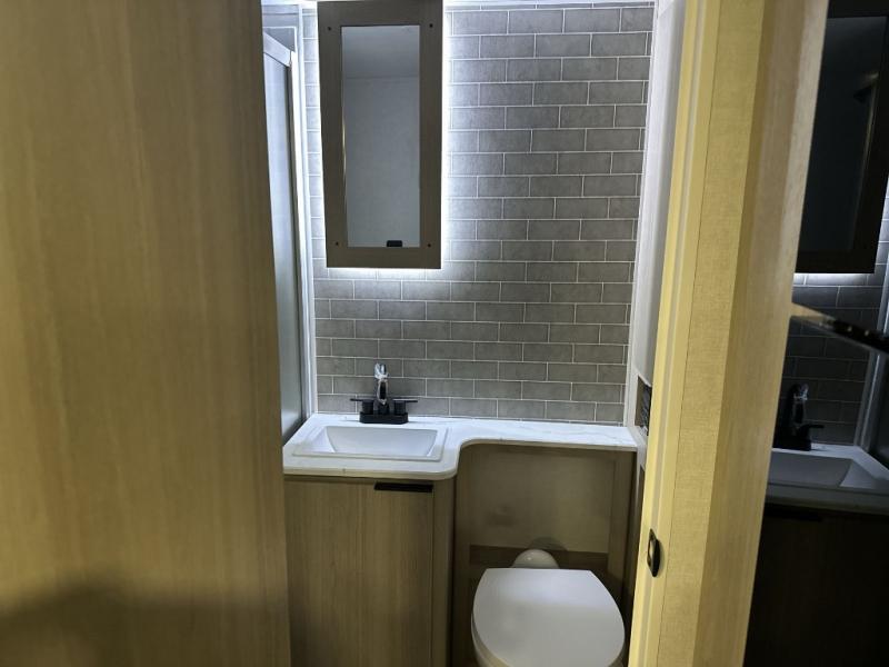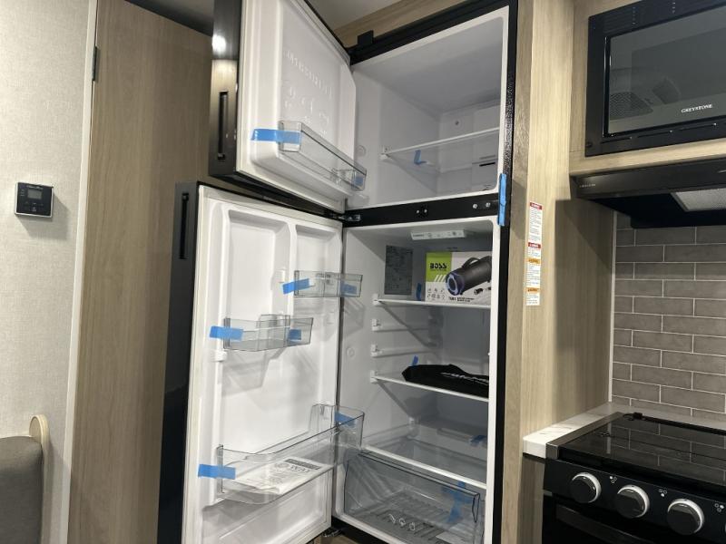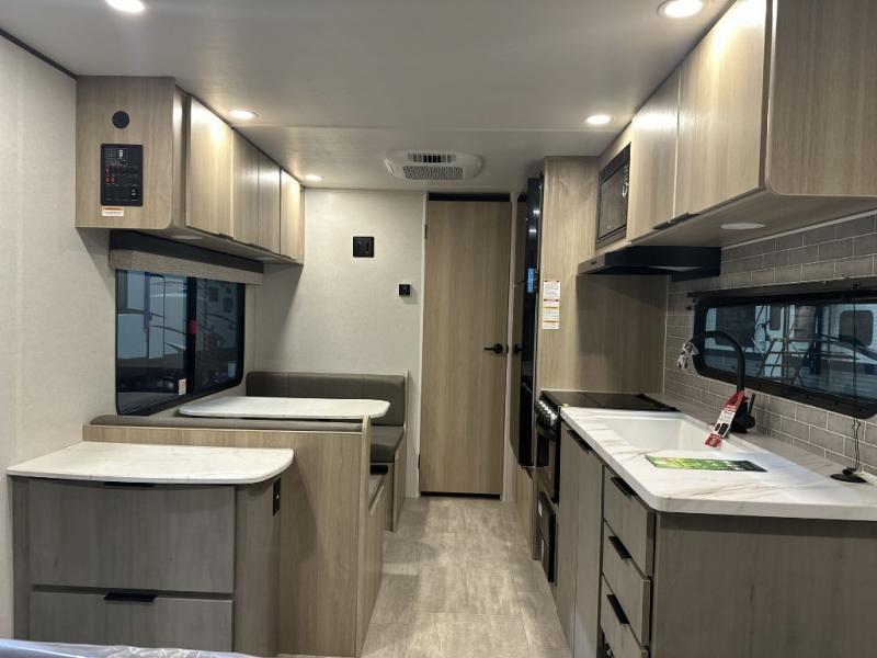 This couple's trailer is perfect for weekend excursions or extended getaways at your favorite state park. You will have your own queen bed up front with storage space for your things, and the full rear bath will add privacy and convenience. Prepare your meals on the cooktop or in the microwave oven, and you can dine together at the booth dinette. The dinette can also be used as additional sleeping space for one guest or two kids.