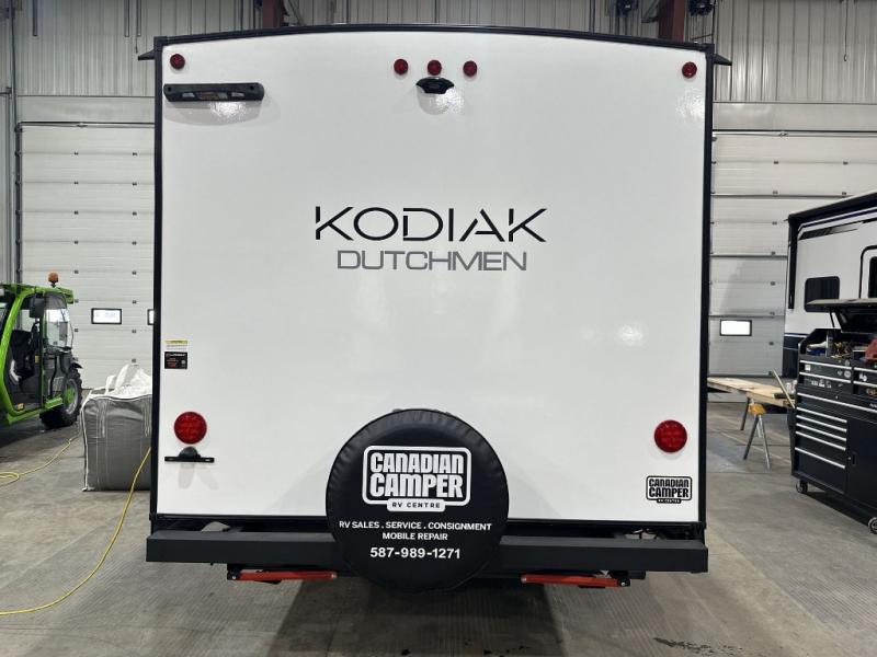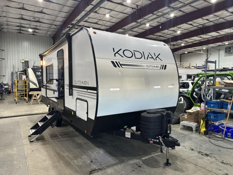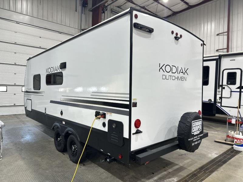 Each Kodiak travel trailer by Dutchmen includes a diamond front plate, easy lube axles, and a power tongue jack for hassle-free towing. The bear cave storage will allow you to bring along all the camp gear, and the power awning with an LED light will create an inviting outdoor space. Head inside to enjoy the designer valances, blackout roller shades, and seamless countertops. There is also HyperDeck flooring that will withstand your many adventures plus a 6' 8" interior height for more head room. A high output furnace and 13.5k BTU A/C will keep you comfortable, and the on-demand tankless water heater will provide instant hot water when you need it!