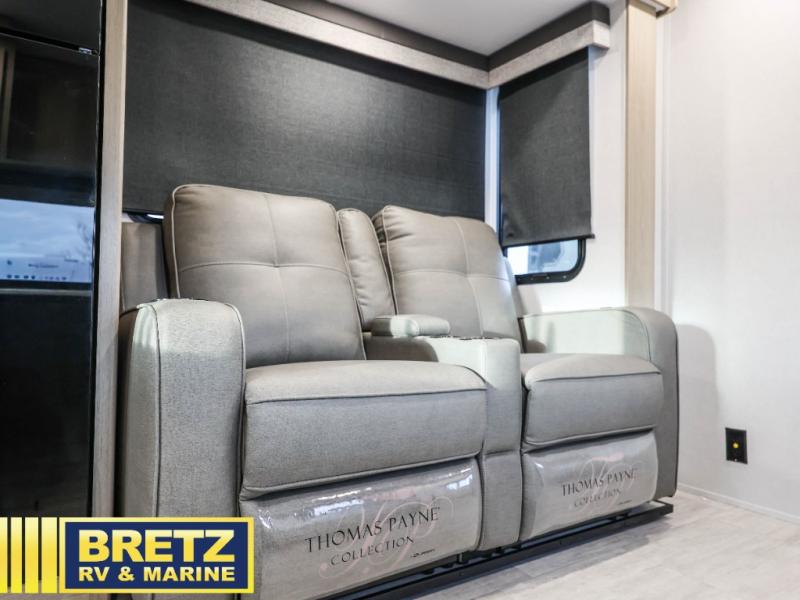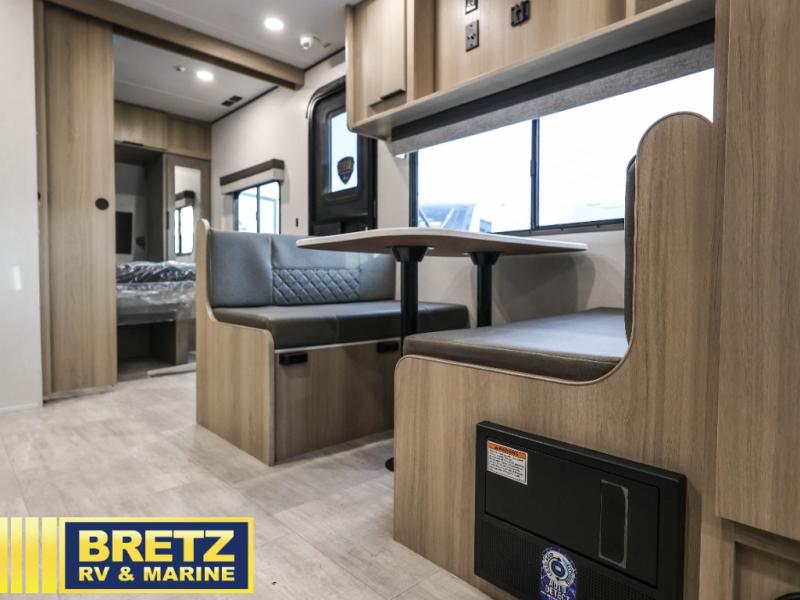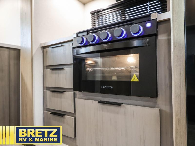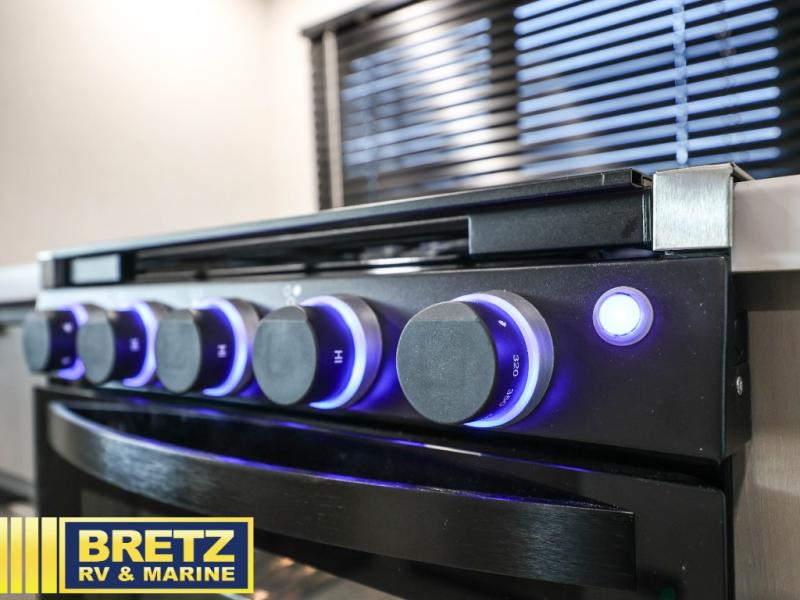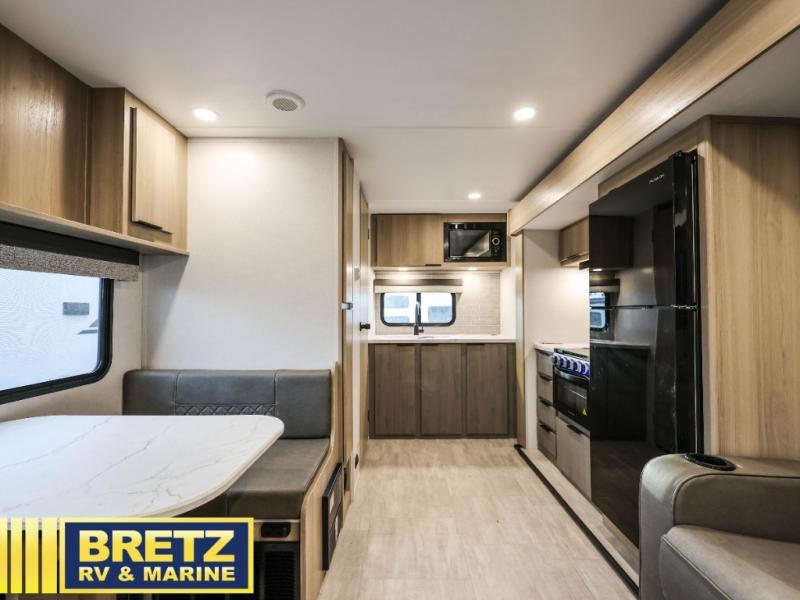- Kitchen Amenities: The kitchen offers seamless countertops, a high-rise faucet, a microwave, and a 10 cu. ft. 12V refrigerator.