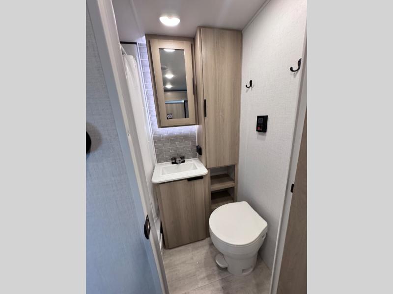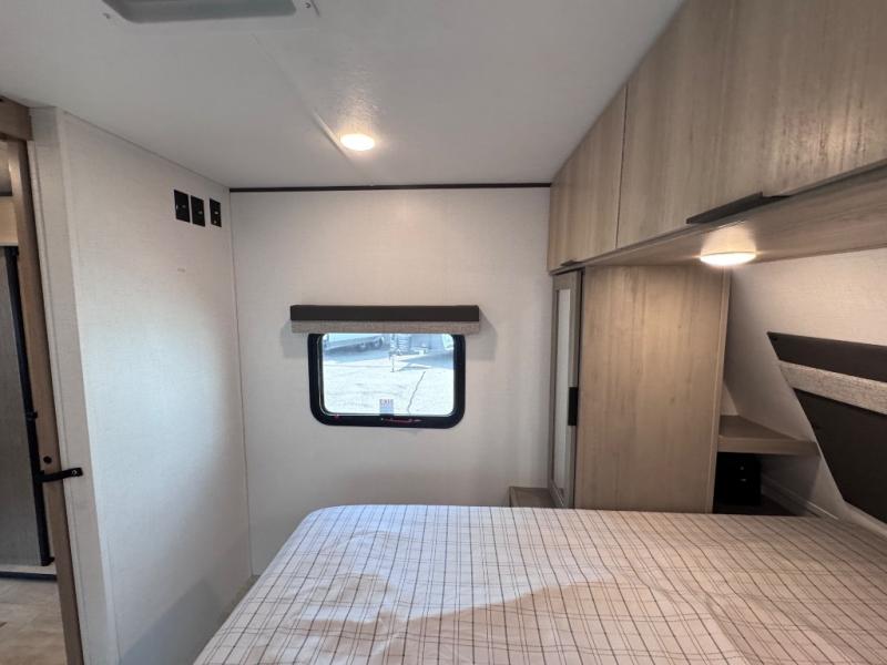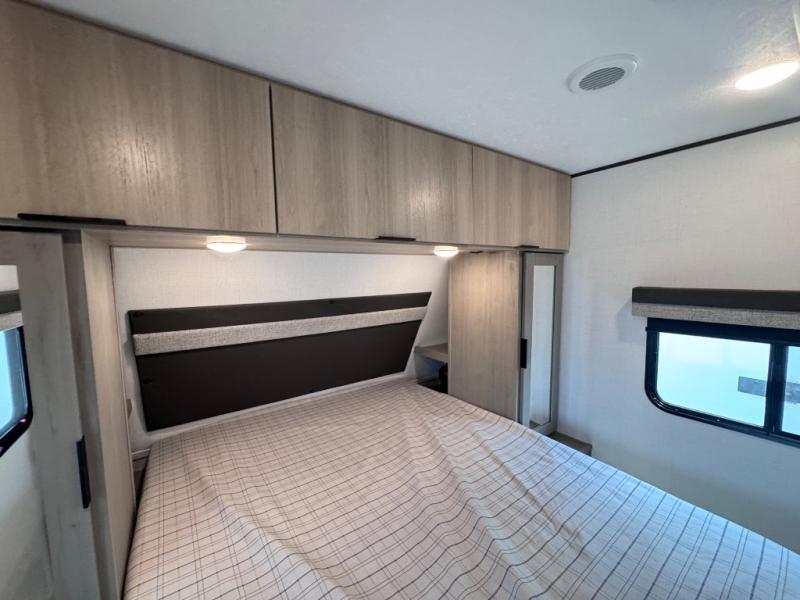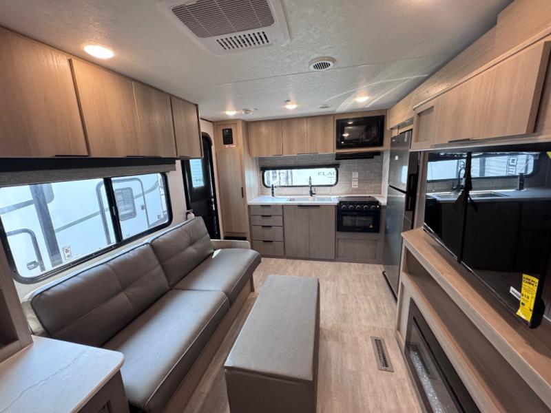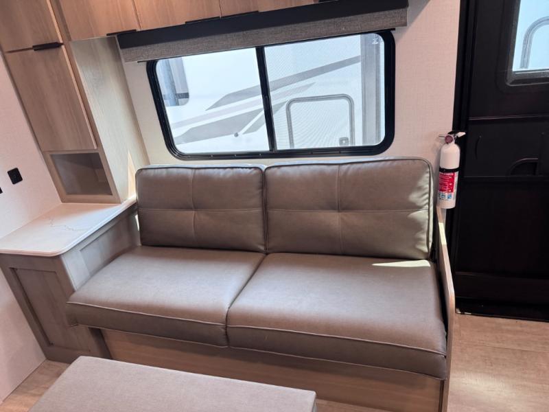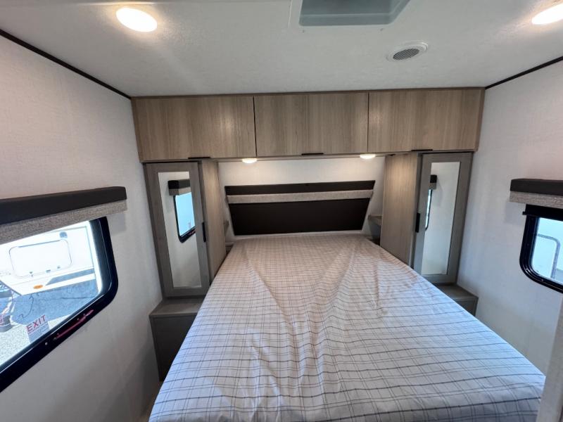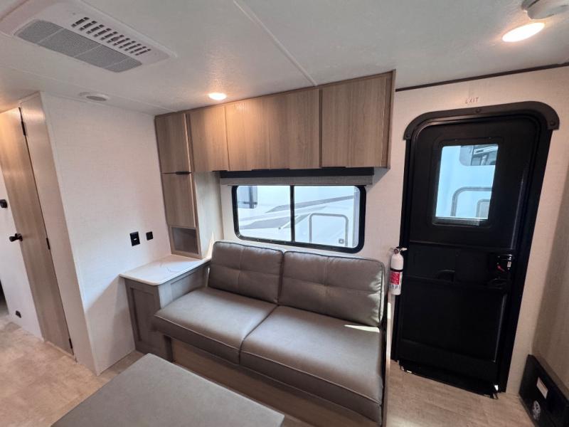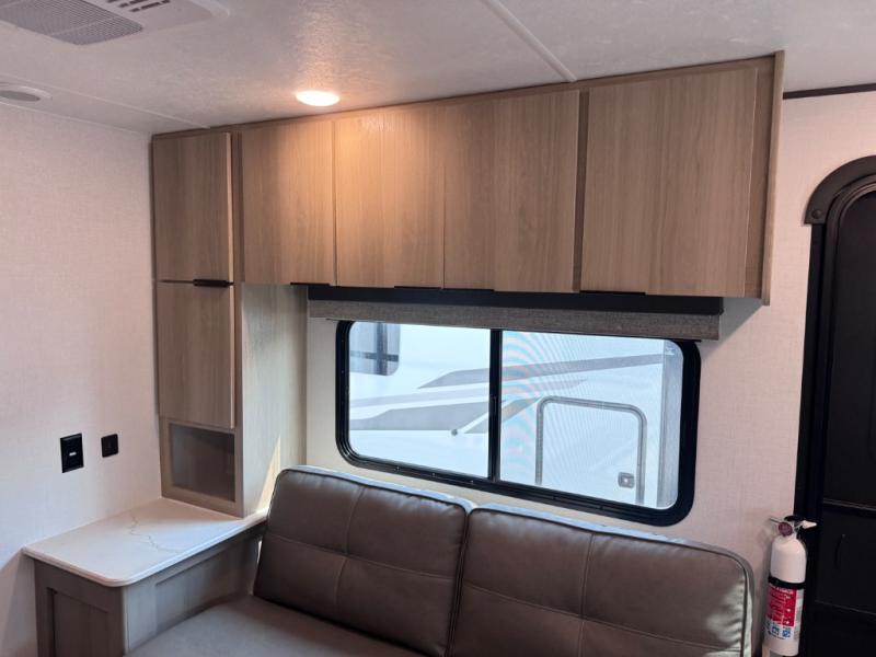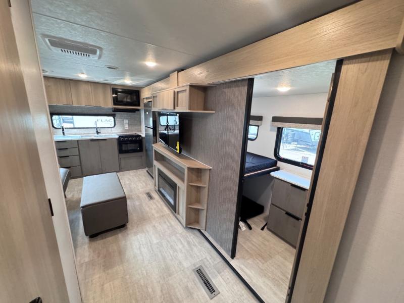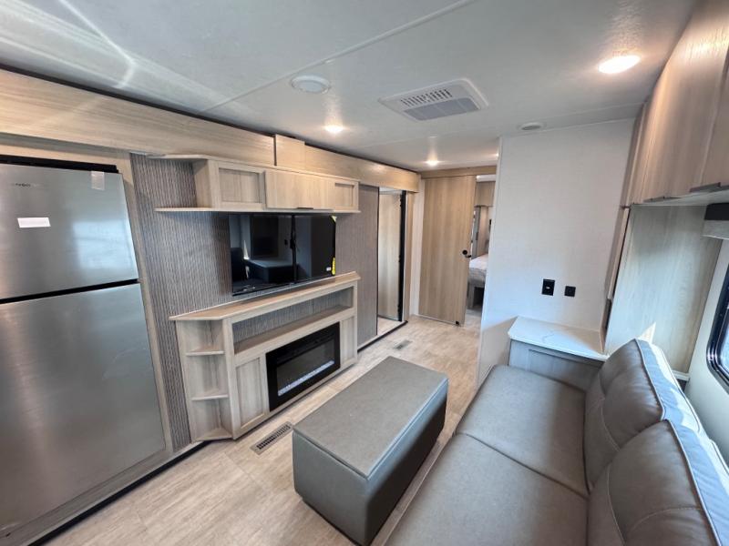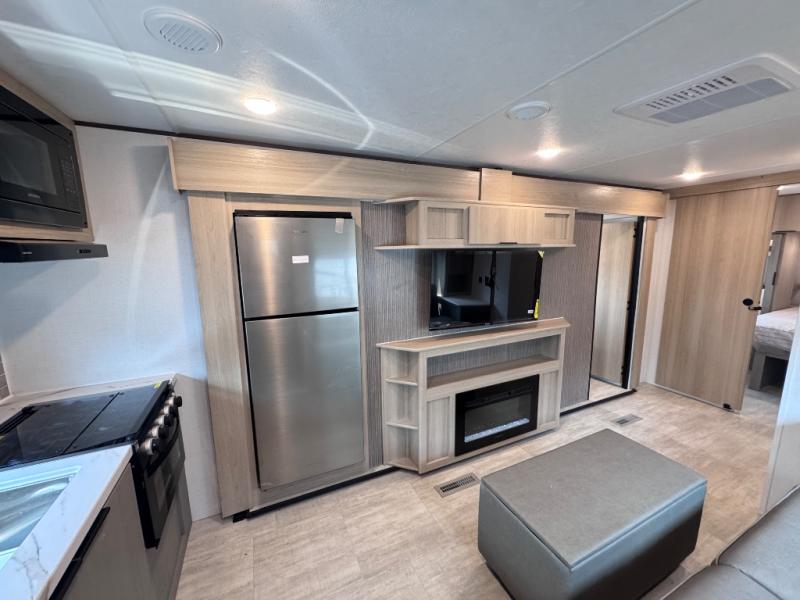 You'll love every minute spent in this spacious travel trailer. There is a front private bedroom with a queen bed and dual bedside closets to keep your things organized. The jack knife sofa sits across from the fireplace so you can enjoy your evenings indoors, and the hidden convertible bunk is behind the entertainment center for a smart usage of space! The rear kitchen includes a cooktop with an oven, a microwave, plus a 12V refrigerator and pantry for food storage. And don't overlook the mid-coach full bath for quick and easy showers!