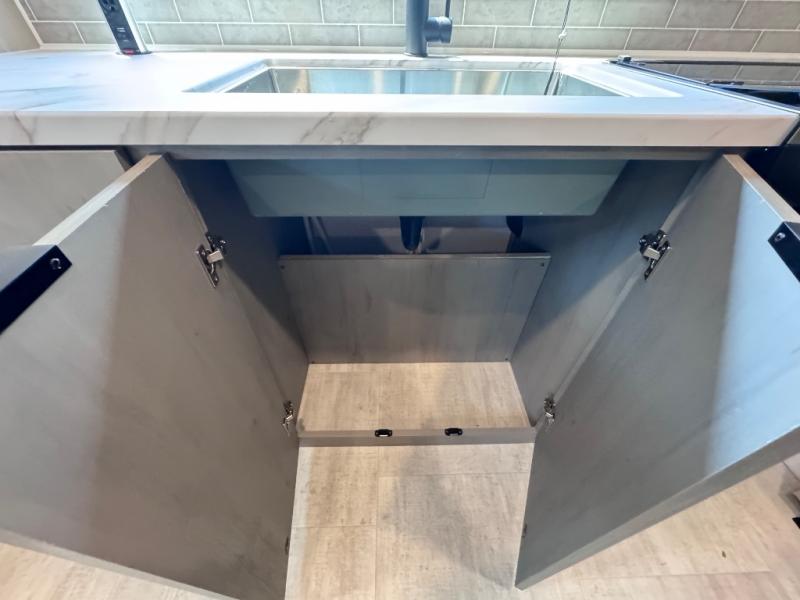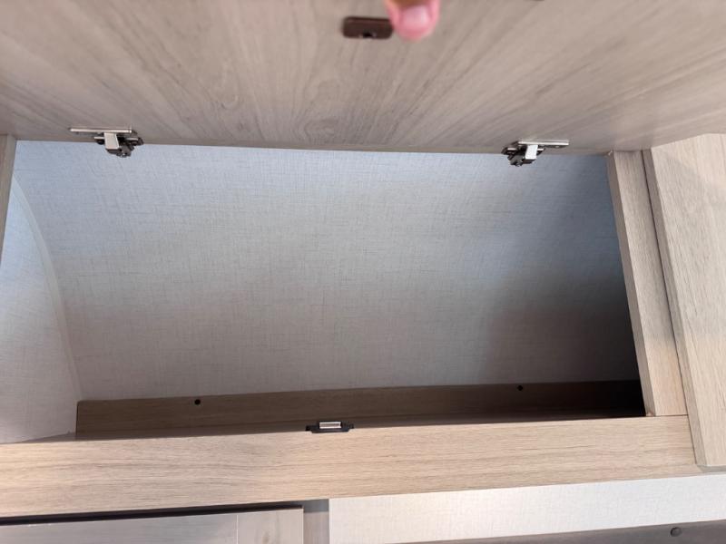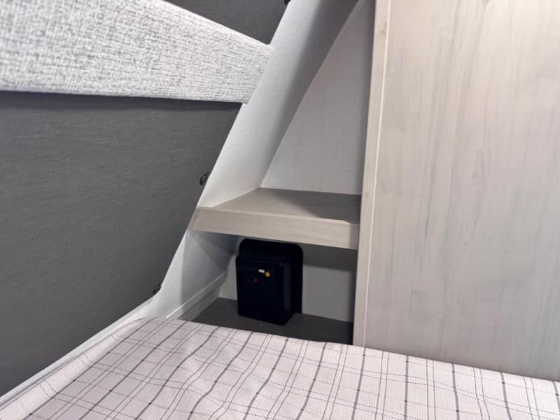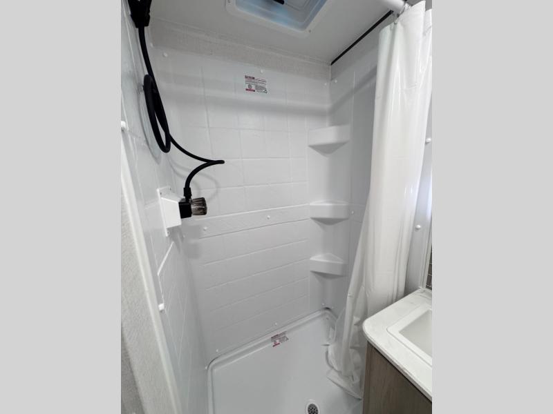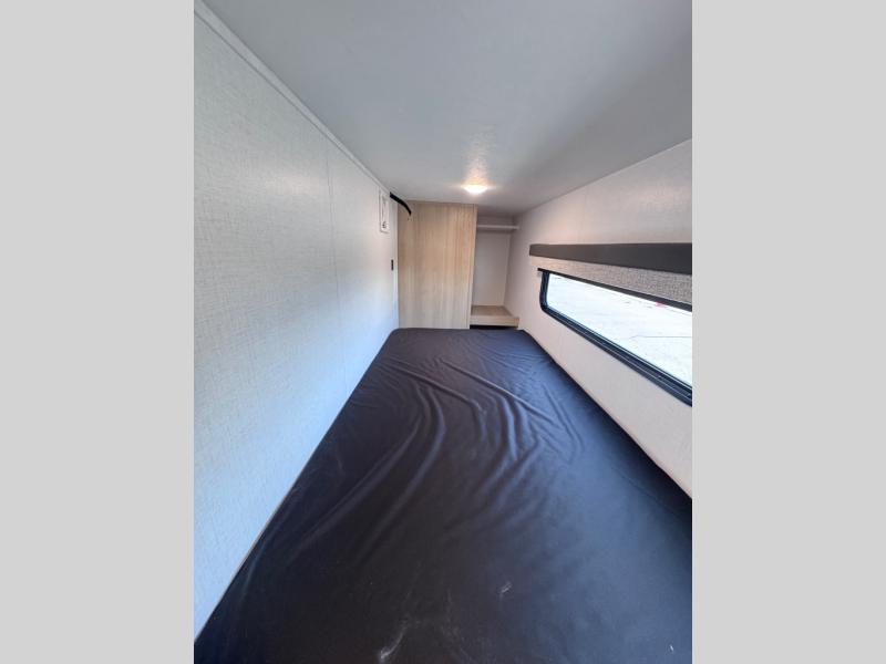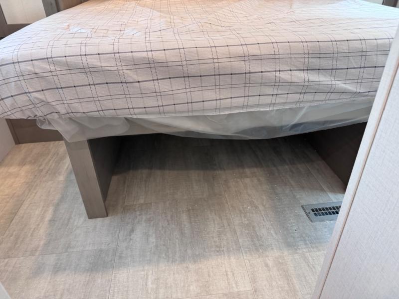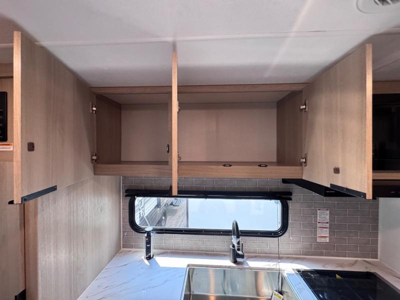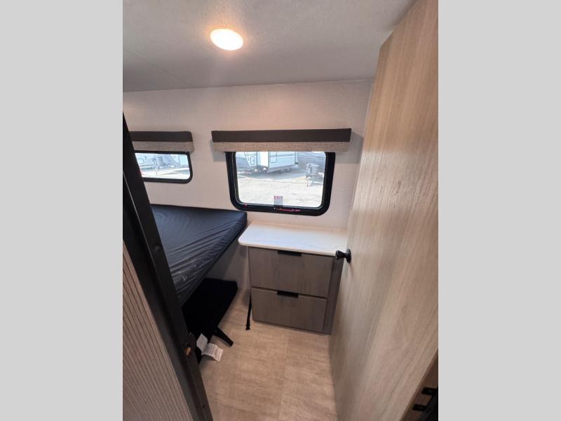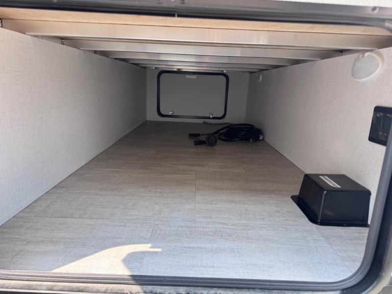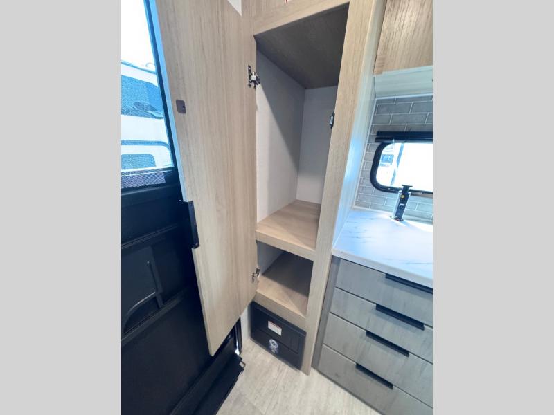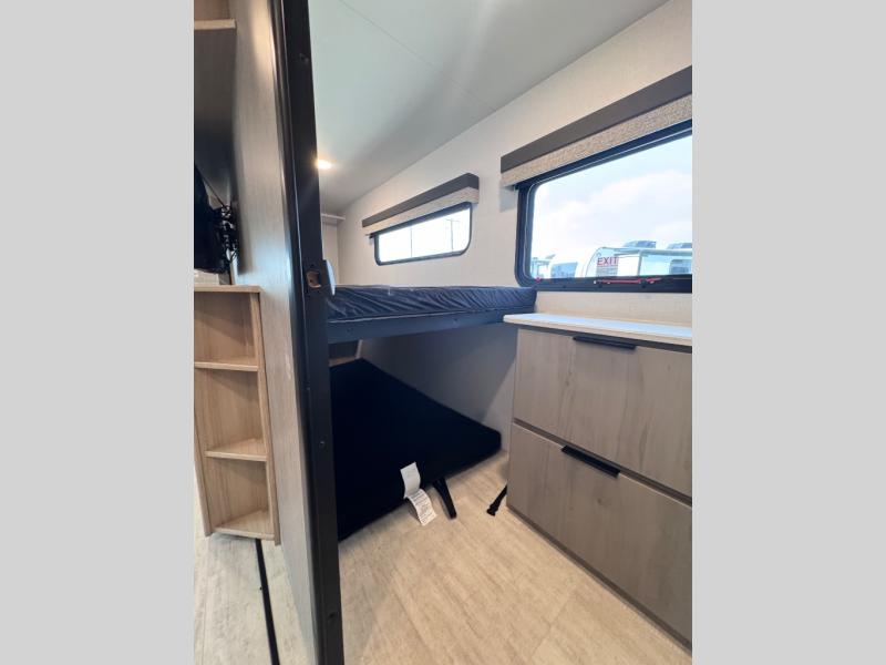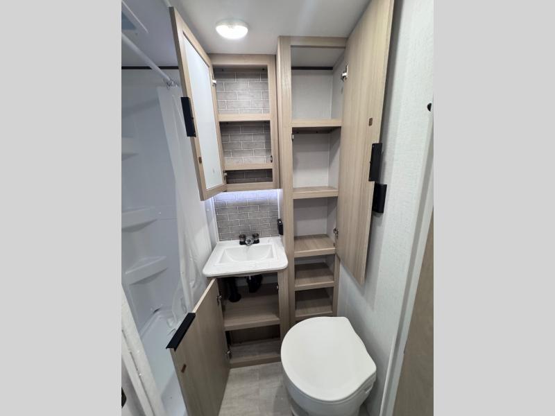 You'll love every minute spent in this spacious travel trailer. There is a front private bedroom with a queen bed and dual bedside closets to keep your things organized. The jack knife sofa sits across from the fireplace so you can enjoy your evenings indoors, and the hidden convertible bunk is behind the entertainment center for a smart usage of space! The rear kitchen includes a cooktop with an oven, a microwave, plus a 12V refrigerator and pantry for food storage. And don't overlook the mid-coach full bath for quick and easy showers!