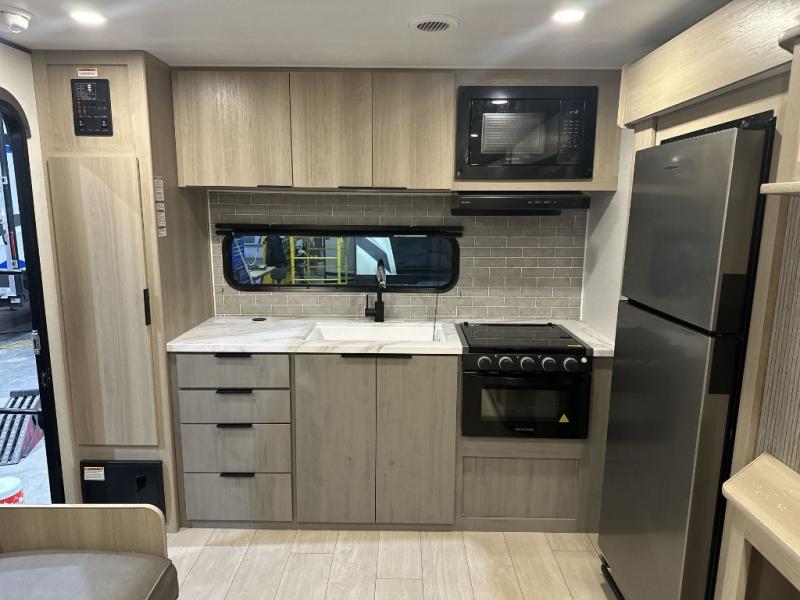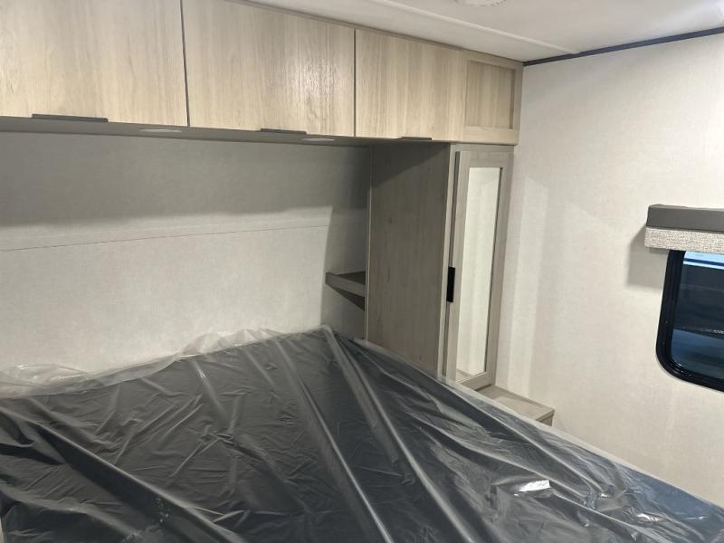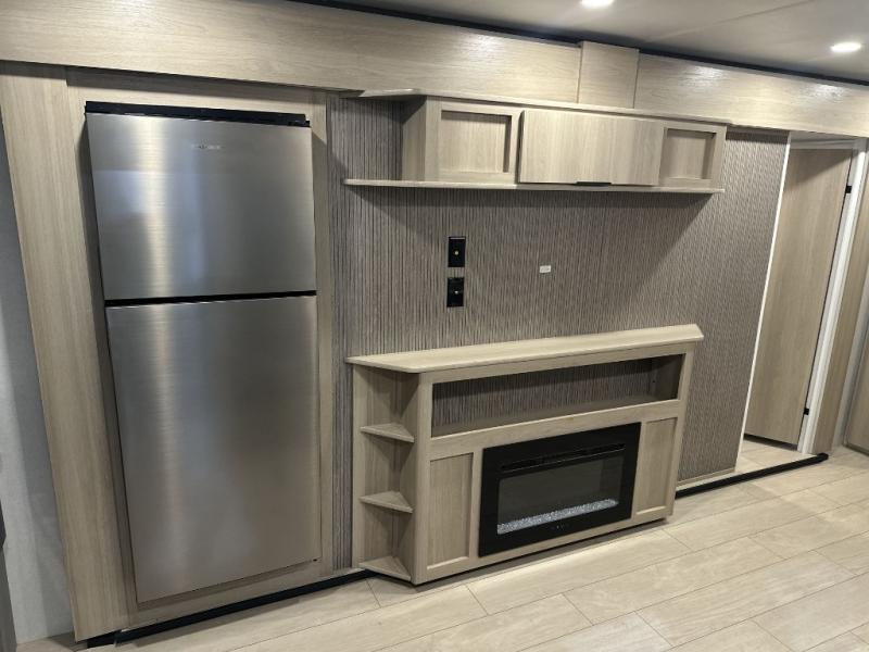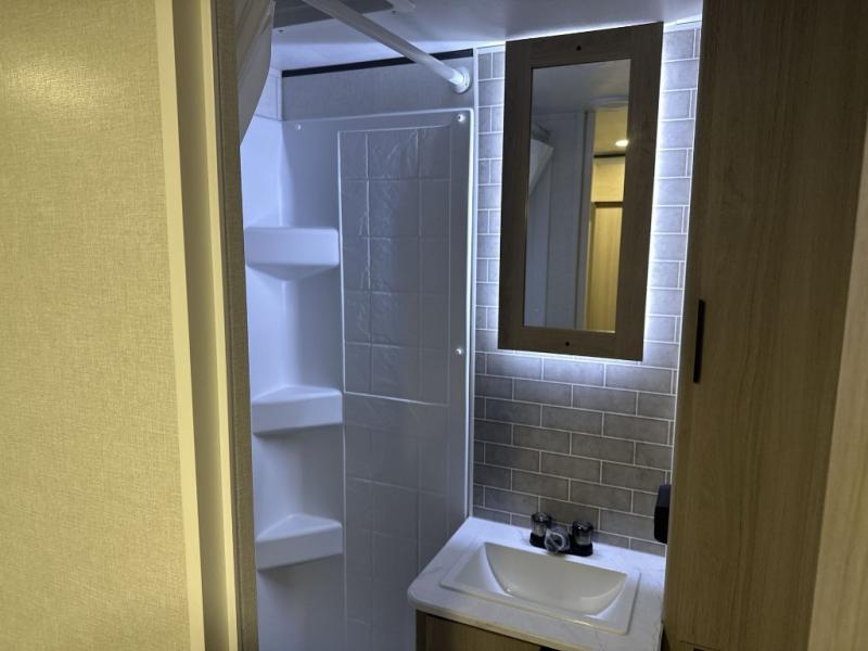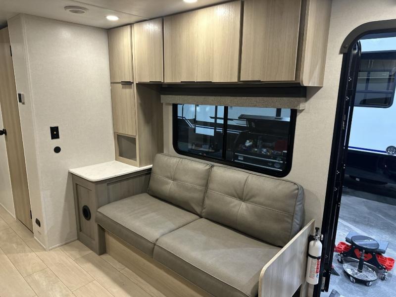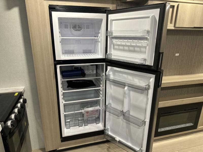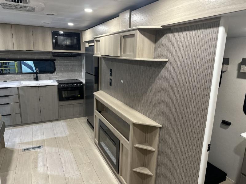 You'll love every minute spent in this spacious travel trailer. There is a front private bedroom with a queen bed and dual bedside closets to keep your things organized. The jack knife sofa sits across from the fireplace so you can enjoy your evenings indoors, and the hidden convertible bunk is behind the entertainment center for a smart usage of space! The rear kitchen includes a cooktop with an oven, a microwave, plus a 12V refrigerator and pantry for food storage. And don't overlook the mid-coach full bath for quick and easy showers!