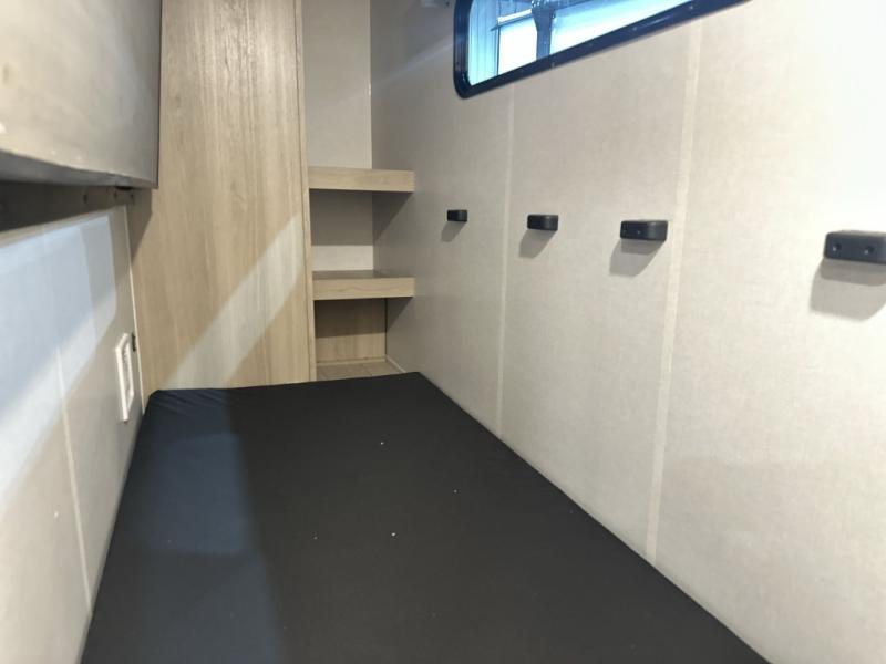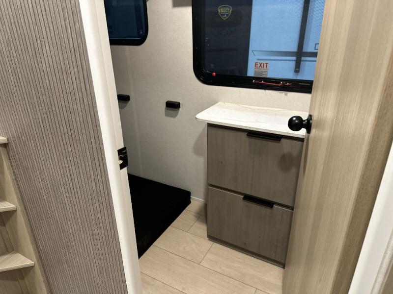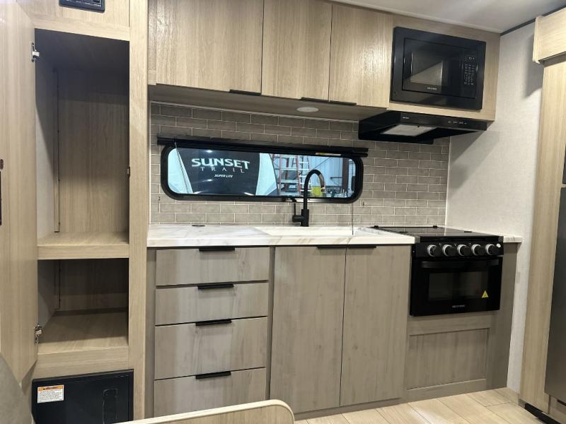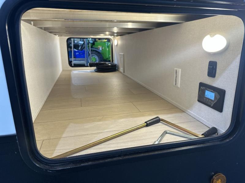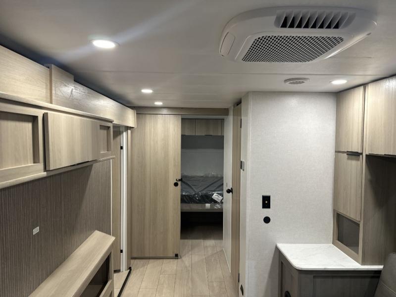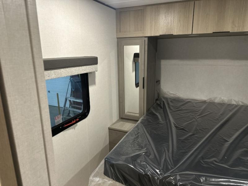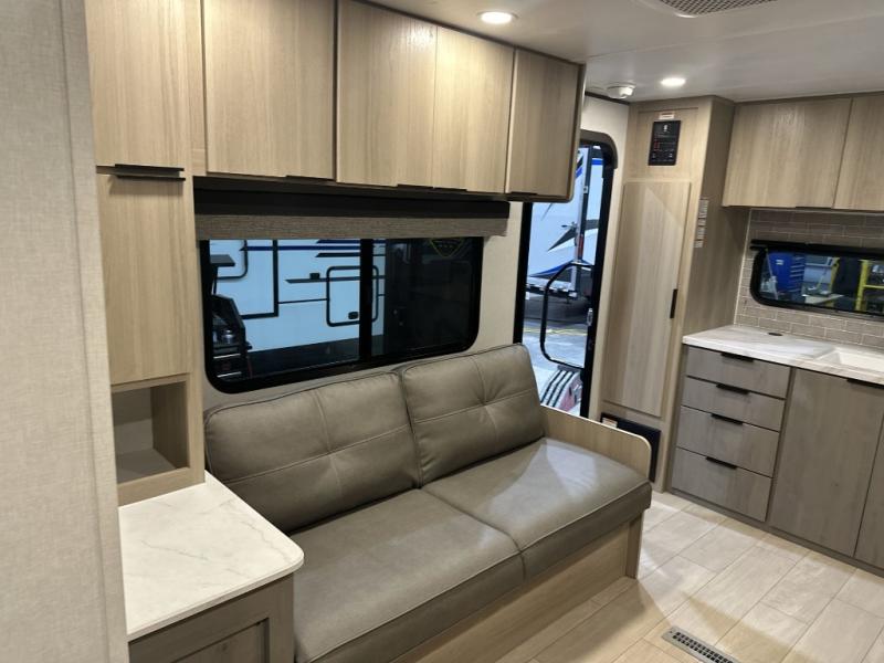 You'll love every minute spent in this spacious travel trailer. There is a front private bedroom with a queen bed and dual bedside closets to keep your things organized. The jack knife sofa sits across from the fireplace so you can enjoy your evenings indoors, and the hidden convertible bunk is behind the entertainment center for a smart usage of space! The rear kitchen includes a cooktop with an oven, a microwave, plus a 12V refrigerator and pantry for food storage. And don't overlook the mid-coach full bath for quick and easy showers!