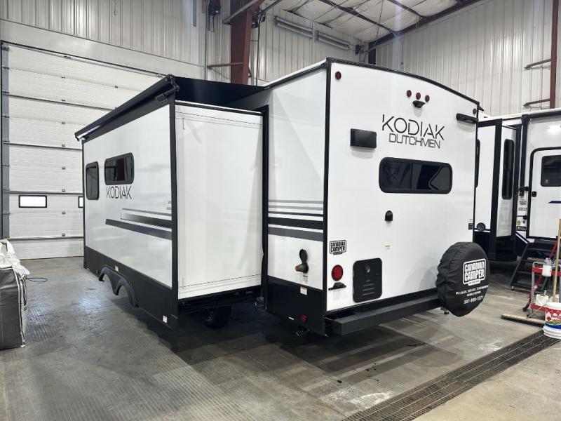 Each Kodiak travel trailer by Dutchmen includes a diamond front plate, easy lube axles, and a power tongue jack for hassle-free towing. The bear cave storage will allow you to bring along all the camp gear, and the power awning with an LED light will create an inviting outdoor space. Head inside to enjoy the designer valances, blackout roller shades, and seamless countertops. There is also HyperDeck flooring that will withstand your many adventures plus a 6' 8" interior height for more head room. A high output furnace and 13.5k BTU A/C will keep you comfortable, and the on-demand tankless water heater will provide instant hot water when you need it!