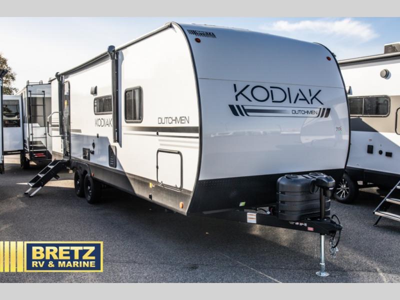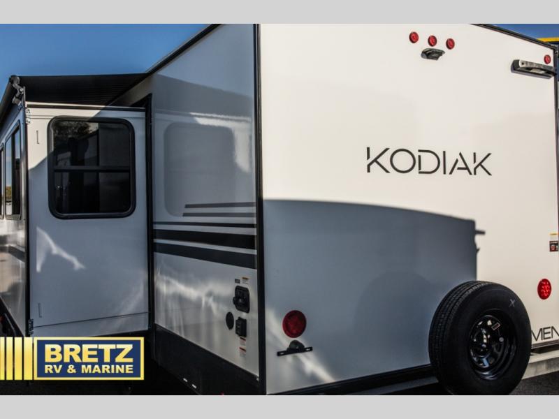 Each Kodiak travel trailer by Dutchmen includes a diamond front plate, easy lube axles, and a power tongue jack for hassle-free towing. The bear cave storage will allow you to bring along all the camp gear, and the power awning with an LED light will create an inviting outdoor space. Head inside to enjoy the designer valances, blackout roller shades, and seamless countertops. There is also HyperDeck flooring that will withstand your many adventures plus a 6' 8" interior height for more head room. A high output furnace and 13.5k BTU A/C will keep you comfortable, and the on-demand tankless water heater will provide instant hot water when you need it!