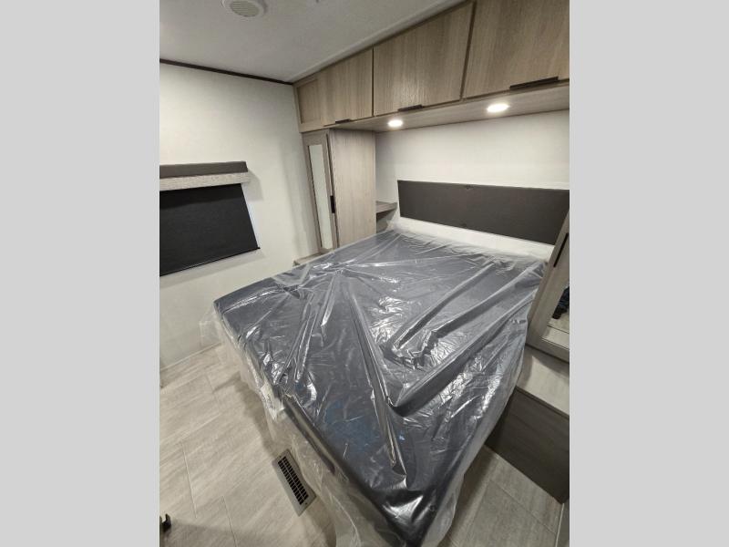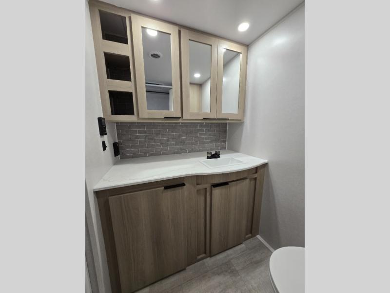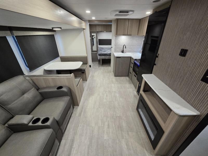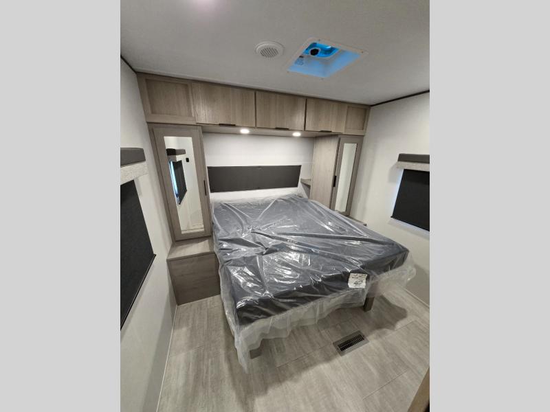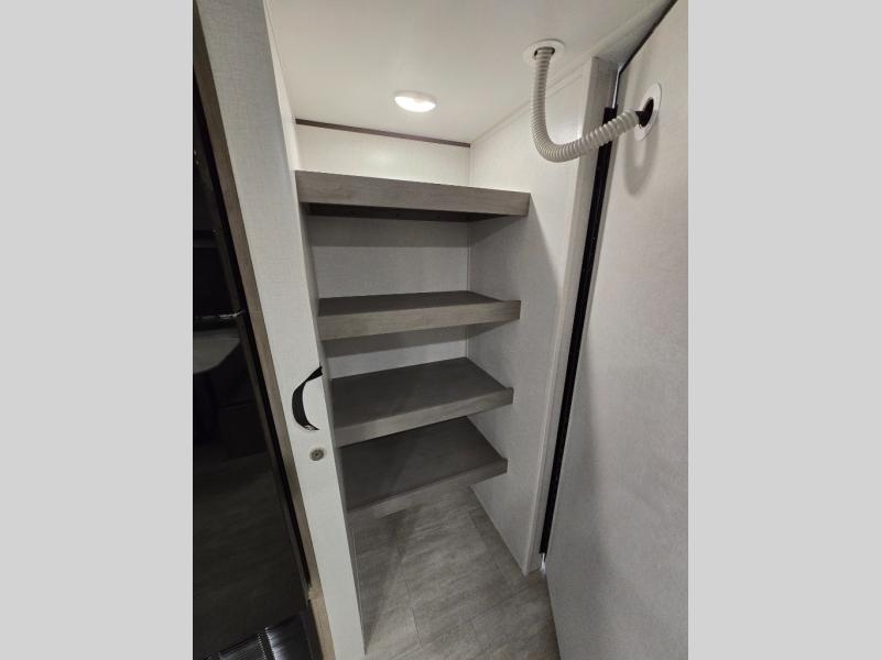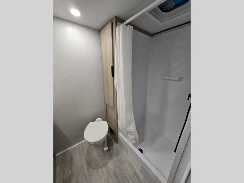 A full rear bath on board this cozy travel trailer will add privacy and convenience you won't want to camp without. The large slide out in the main living area will provide plenty of space to let the chef whip up breakfast on the cooktop, and your crew can get comfy on the theater seats. The 10 cu. ft. 12V refrigerator will allow you to pack your favorite cold ingredients, plus there is a hidden pantry behind the hinged entertainment center for smart storage spaces. This model also includes a front private bedroom with a queen bed, just like at home!