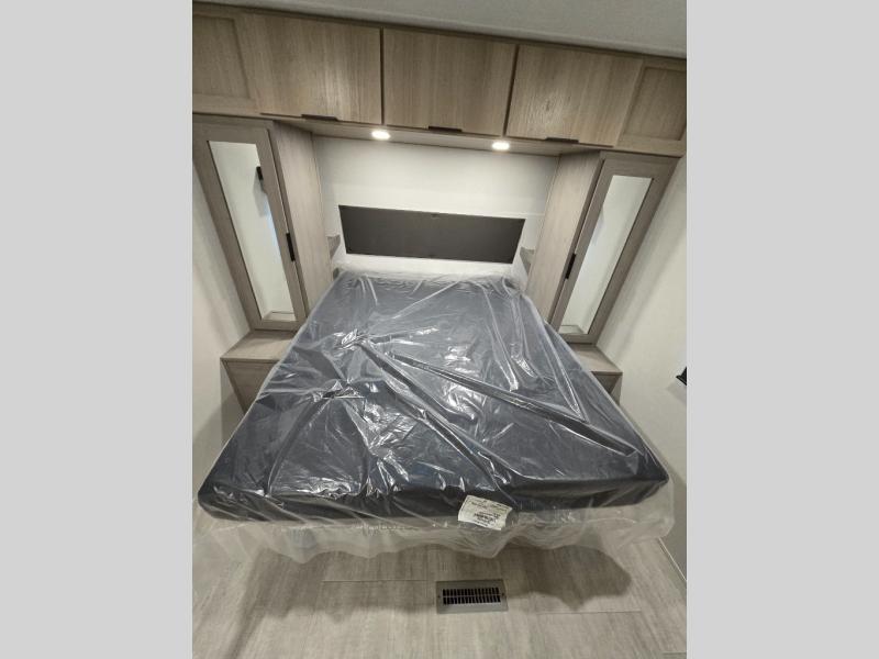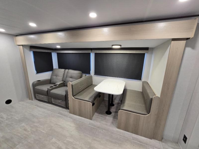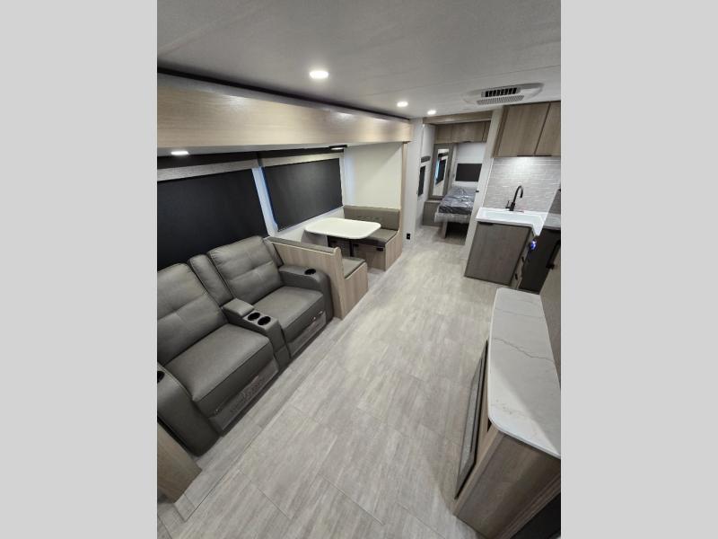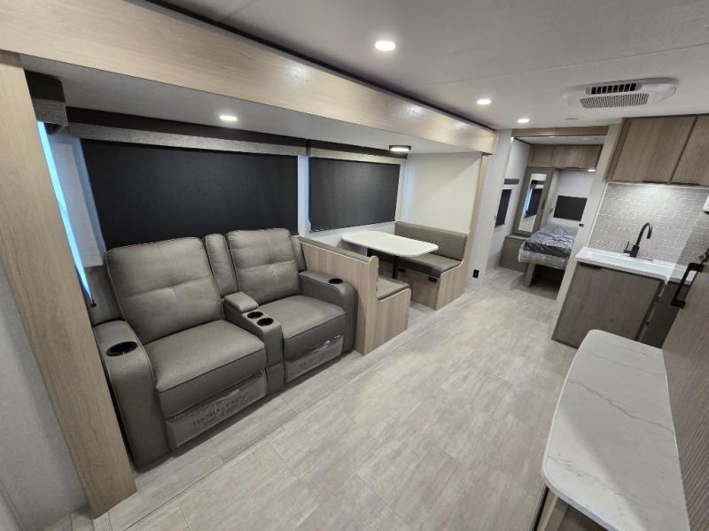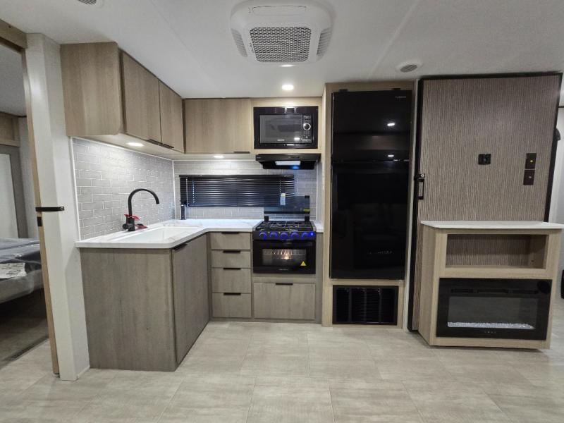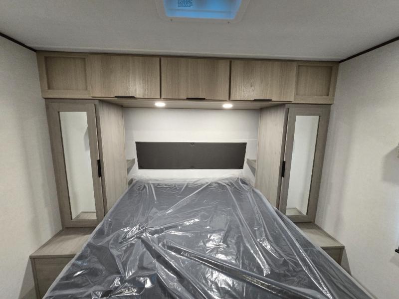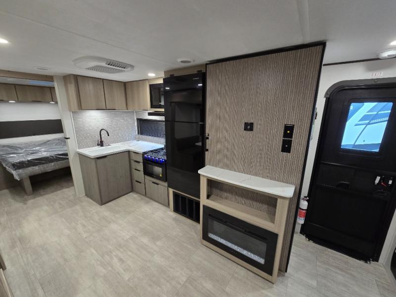 A full rear bath on board this cozy travel trailer will add privacy and convenience you won't want to camp without. The large slide out in the main living area will provide plenty of space to let the chef whip up breakfast on the cooktop, and your crew can get comfy on the theater seats. The 10 cu. ft. 12V refrigerator will allow you to pack your favorite cold ingredients, plus there is a hidden pantry behind the hinged entertainment center for smart storage spaces. This model also includes a front private bedroom with a queen bed, just like at home!