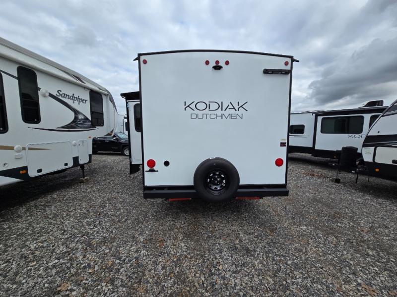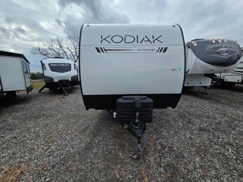 Each Kodiak travel trailer by Dutchmen includes a diamond front plate, easy lube axles, and a power tongue jack for hassle-free towing. The bear cave storage will allow you to bring along all the camp gear, and the power awning with an LED light will create an inviting outdoor space. Head inside to enjoy the designer valances, blackout roller shades, and seamless countertops. There is also HyperDeck flooring that will withstand your many adventures plus a 6' 8" interior height for more head room. A high output furnace and 13.5k BTU A/C will keep you comfortable, and the on-demand tankless water heater will provide instant hot water when you need it!