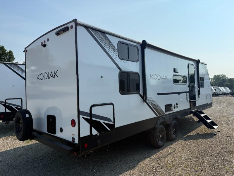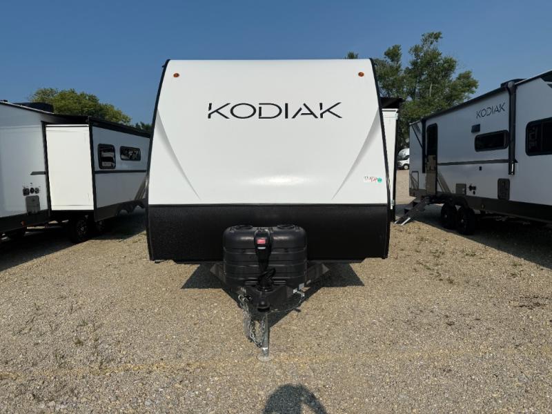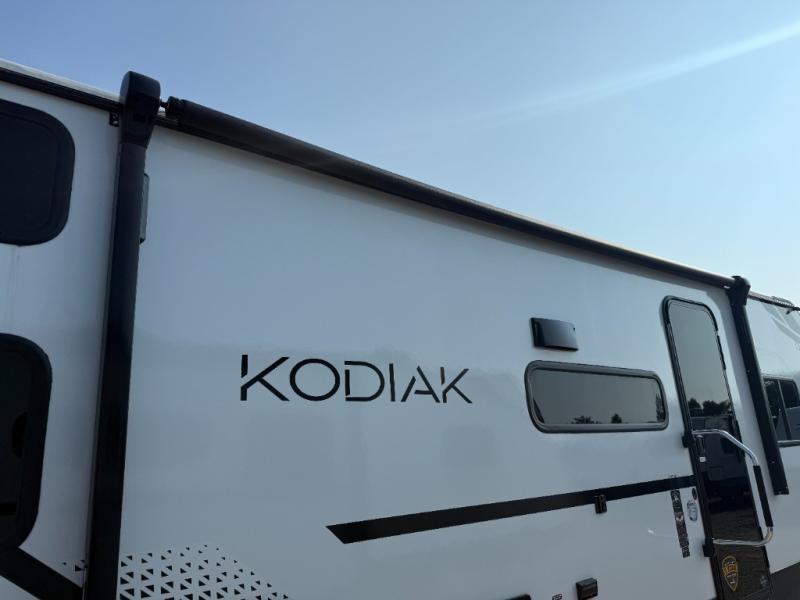 Each Kodiak travel trailer by Dutchmen includes a diamond front plate, easy lube axles, and a power tongue jack for hassle-free towing. The bear cave storage will allow you to bring along all the camp gear, and the power awning with an LED light will create an inviting outdoor space. Head inside to enjoy the designer valances, blackout roller shades, and seamless countertops. There is also HyperDeck flooring that will withstand your many adventures plus a 6' 8" interior height for more head room. A high output furnace and 13.5k BTU A/C will keep you comfortable, and the on-demand tankless water heater will provide instant hot water when you need it!