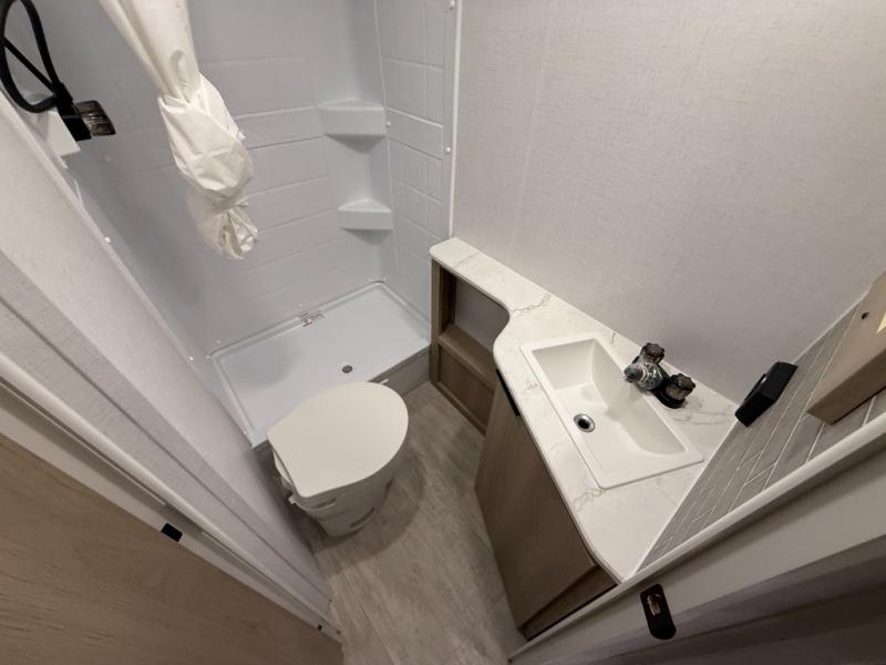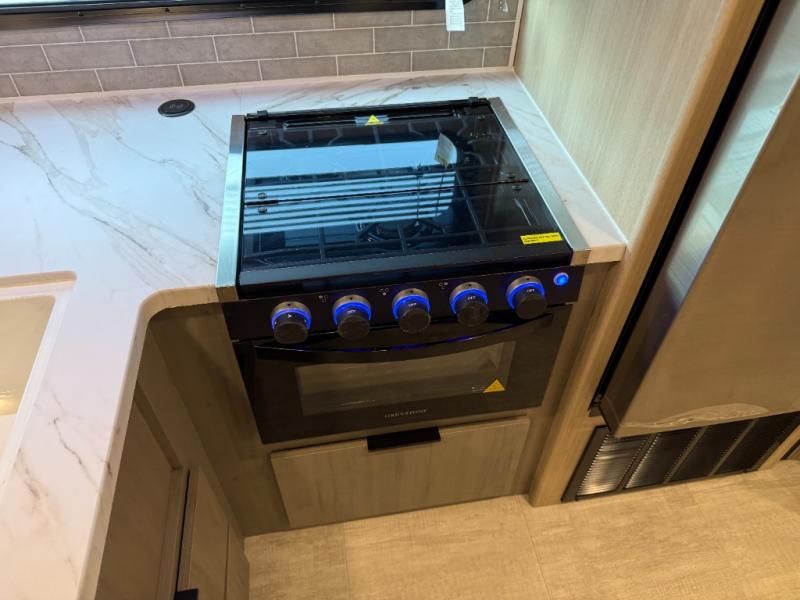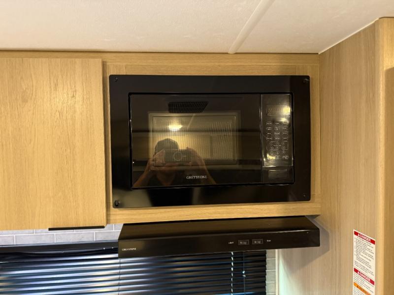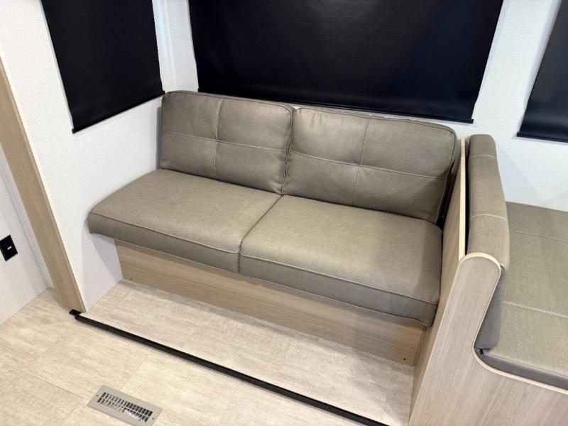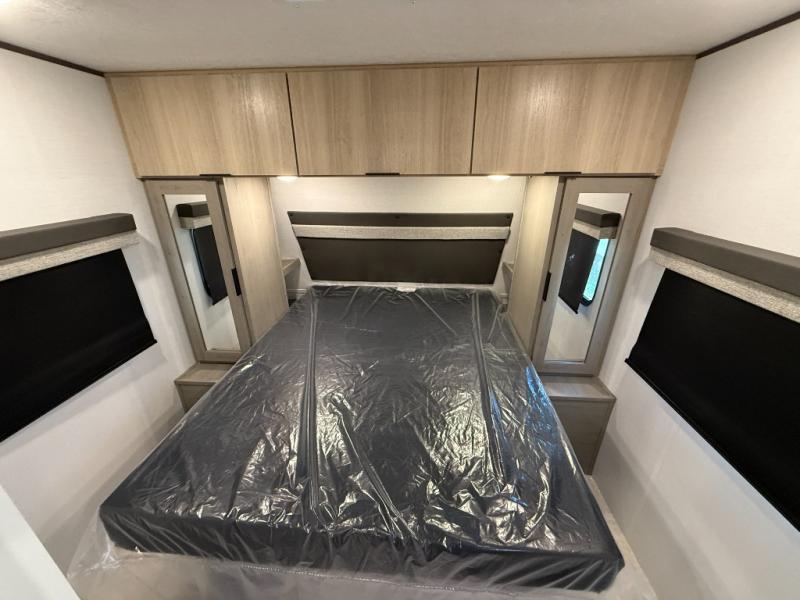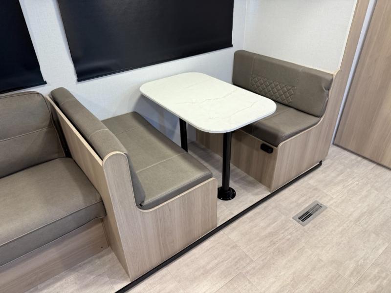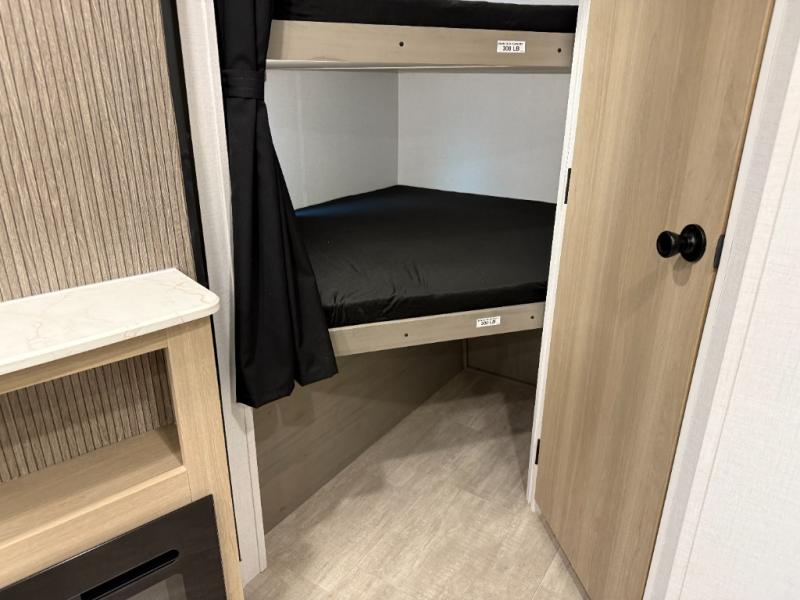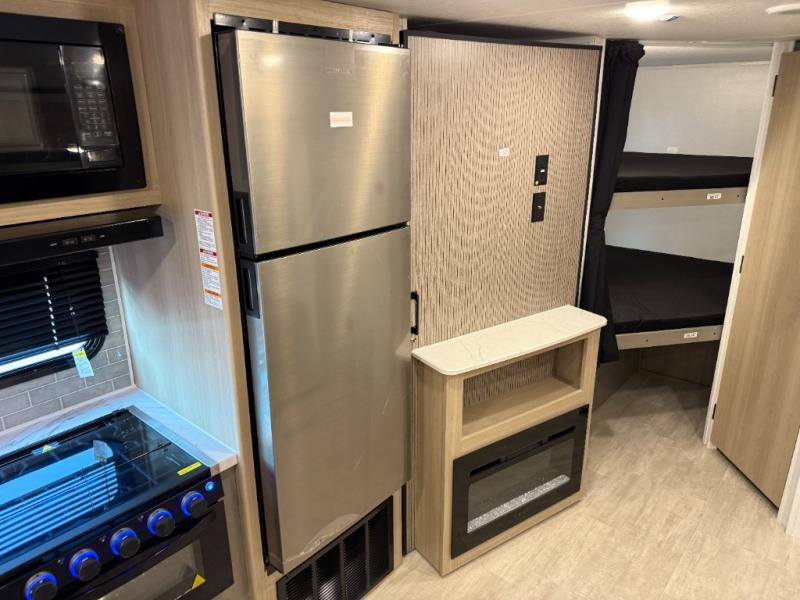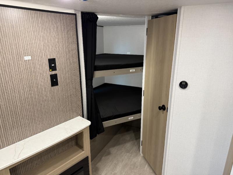 This bunkhouse model is perfect for weekend excursions or extended getaways at your favorite state park. You will have your own queen bed up front with storage space for your things, and the double-size bunks in the back will be perfect for guests. Prepare your meals on the cooktop or in the microwave oven, and you can dine together at the booth dinette. The dinette can also be used as additional sleeping space for one guest or two kids. Outside, a 14' power awning will provide some shade, and an outdoor refrigerator will keep cold drinks close by!