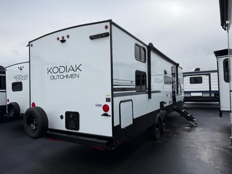 Each Kodiak travel trailer by Dutchmen includes a diamond front plate, easy lube axles, and a power tongue jack for hassle-free towing. The bear cave storage will allow you to bring along all the camp gear, and the power awning with an LED light will create an inviting outdoor space. Head inside to enjoy the designer valances, blackout roller shades, and seamless countertops. There is also HyperDeck flooring that will withstand your many adventures plus a 6' 8" interior height for more head room. A high output furnace and 13.5k BTU A/C will keep you comfortable, and the on-demand tankless water heater will provide instant hot water when you need it!