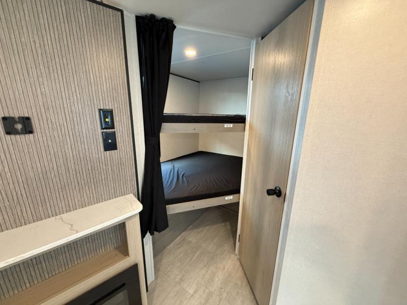 This bunkhouse model is perfect for weekend excursions or extended getaways at your favorite state park. You will have your own queen bed up front with storage space for your things, and the double-size bunks in the back will be perfect for guests. Prepare your meals on the cooktop or in the microwave oven, and you can dine together at the booth dinette. The dinette can also be used as additional sleeping space for one guest or two kids. Outside, a 14' power awning will provide some shade, and an outdoor refrigerator will keep cold drinks close by!
