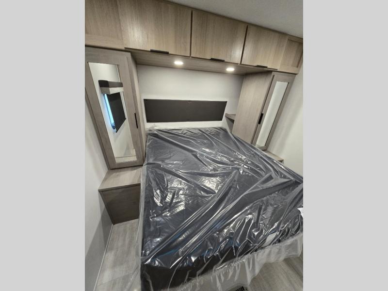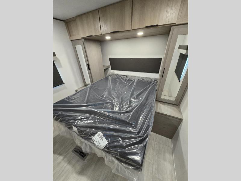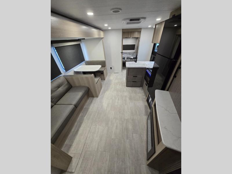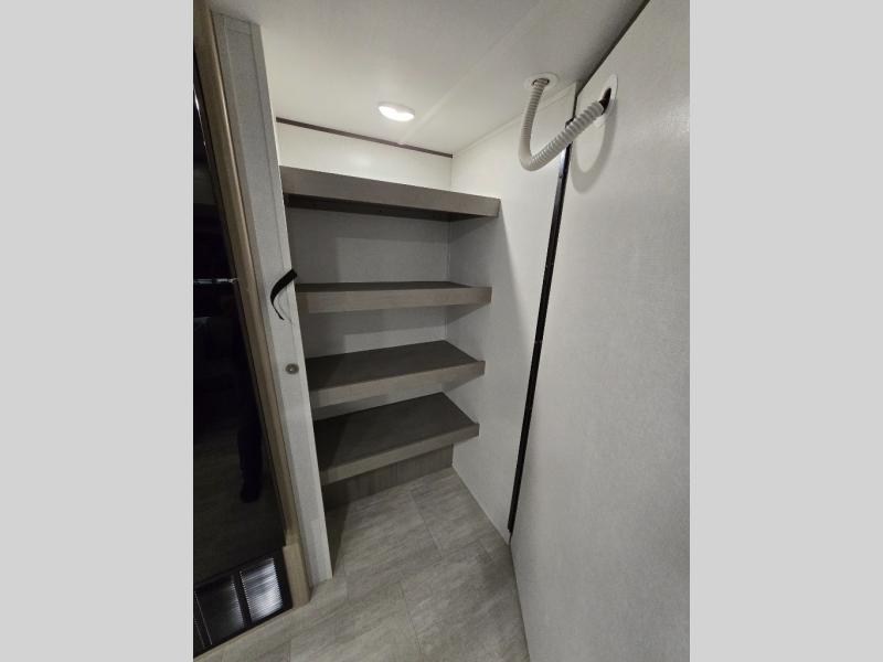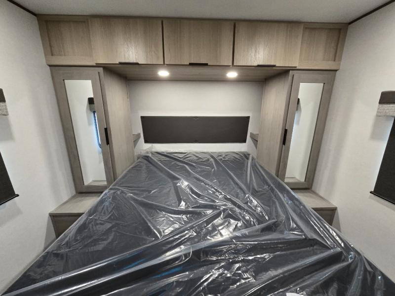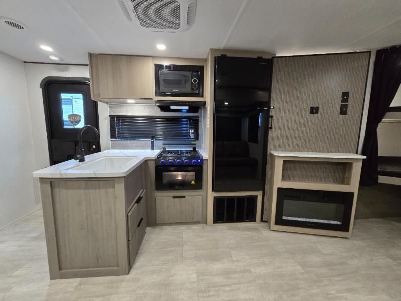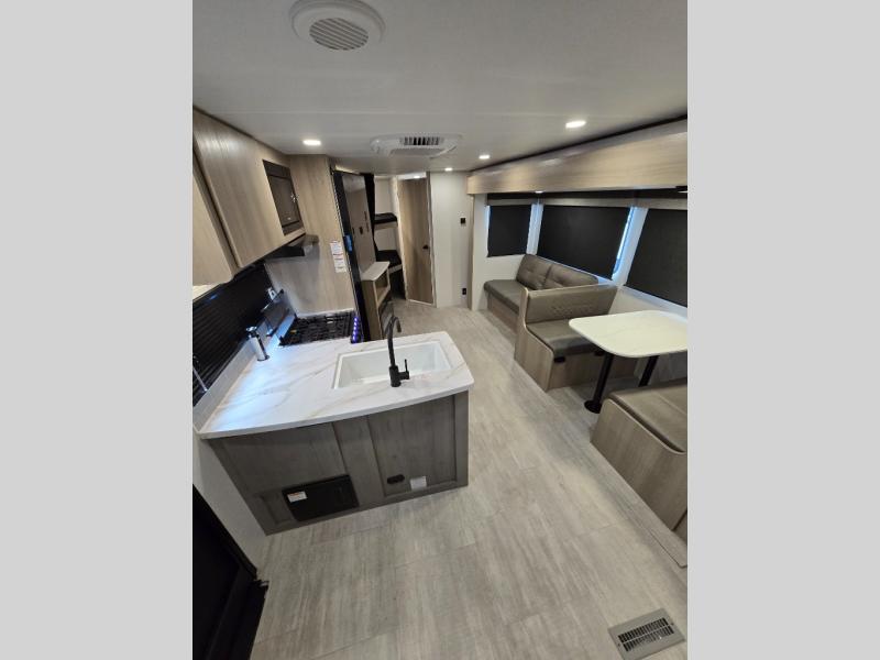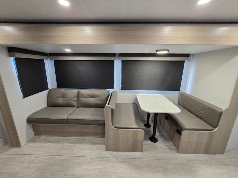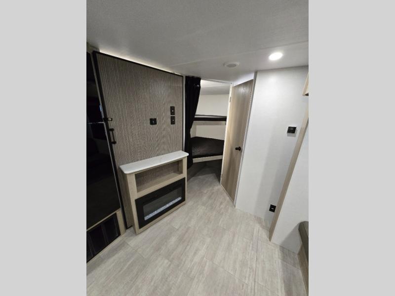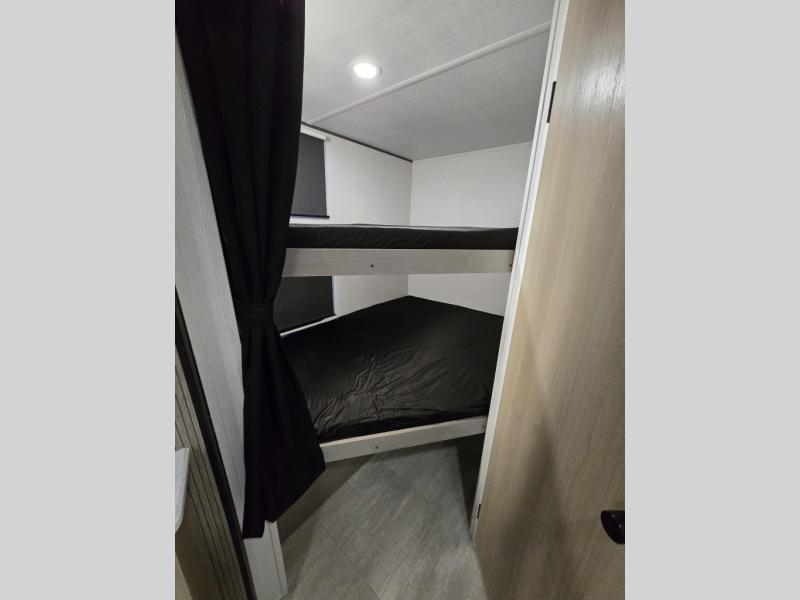This bunkhouse model is perfect for weekend excursions or extended getaways at your favorite state park. You will have your own queen bed up front with storage space for your things, and the double-size bunks in the back will be perfect for guests. Prepare your meals on the cooktop or in the microwave oven, and you can dine together at the booth dinette. The dinette can also be used as additional sleeping space for one guest or two kids. Outside, a 14' power awning will provide some shade, and an outdoor refrigerator will keep cold drinks close by!
