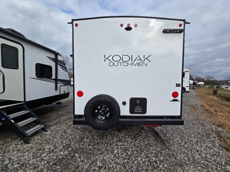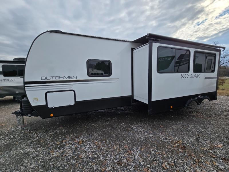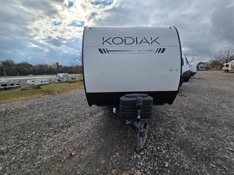 Each Kodiak travel trailer by Dutchmen includes a diamond front plate, easy lube axles, and a power tongue jack for hassle-free towing. The bear cave storage will allow you to bring along all the camp gear, and the power awning with an LED light will create an inviting outdoor space. Head inside to enjoy the designer valances, blackout roller shades, and seamless countertops. There is also HyperDeck flooring that will withstand your many adventures plus a 6' 8" interior height for more head room. A high output furnace and 13.5k BTU A/C will keep you comfortable, and the on-demand tankless water heater will provide instant hot water when you need it!