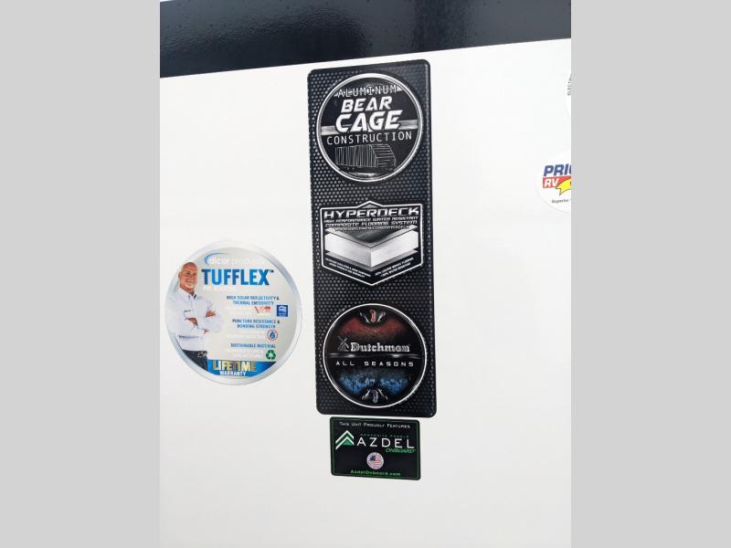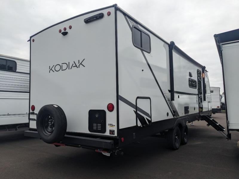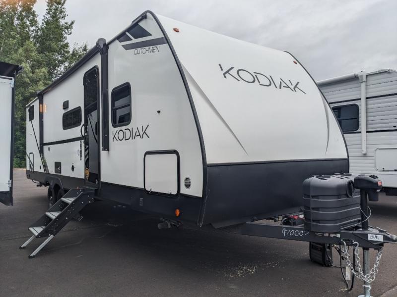 Each Kodiak travel trailer by Dutchmen includes a diamond front plate, easy lube axles, and a power tongue jack for hassle-free towing. The bear cave storage will allow you to bring along all the camp gear, and the power awning with an LED light will create an inviting outdoor space. Head inside to enjoy the designer valances, blackout roller shades, and seamless countertops. There is also HyperDeck flooring that will withstand your many adventures plus a 6' 8" interior height for more head room. A high output furnace and 13.5k BTU A/C will keep you comfortable, and the on-demand tankless water heater will provide instant hot water when you need it!