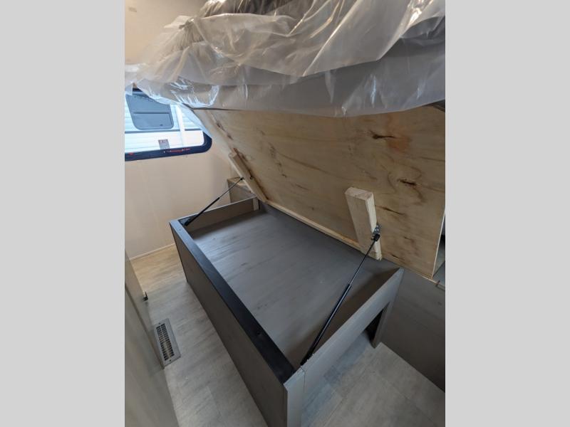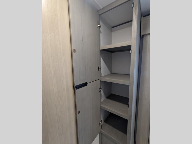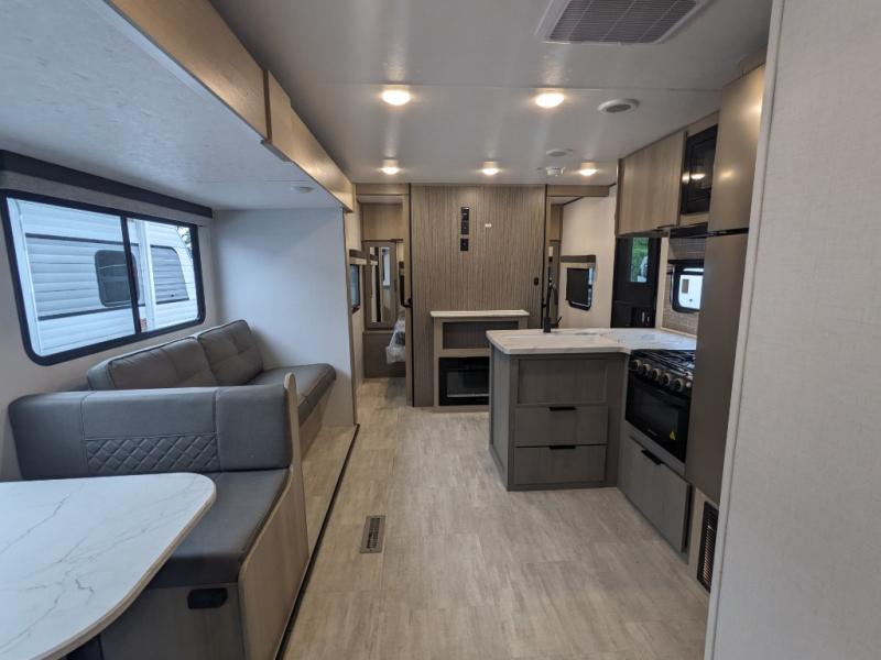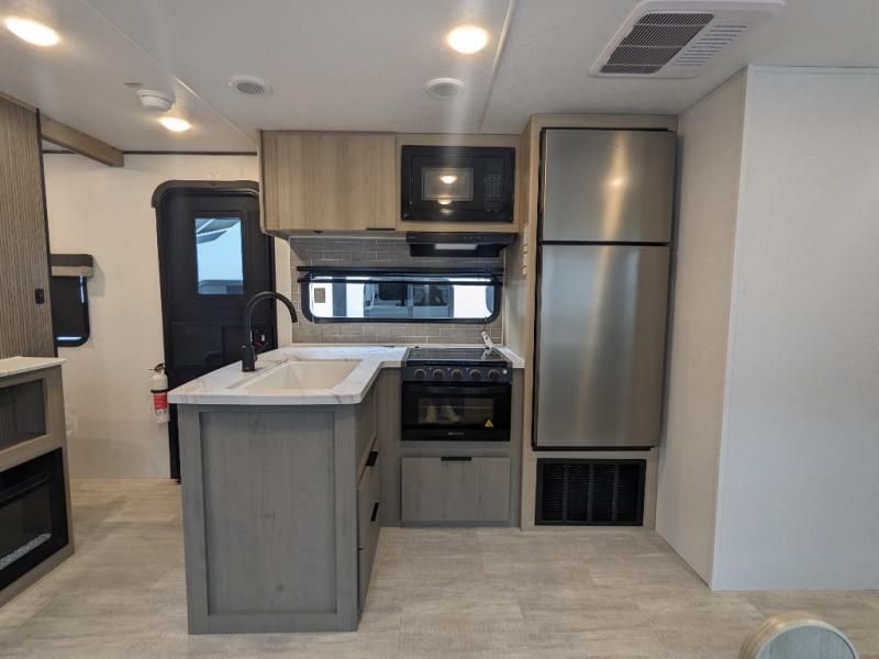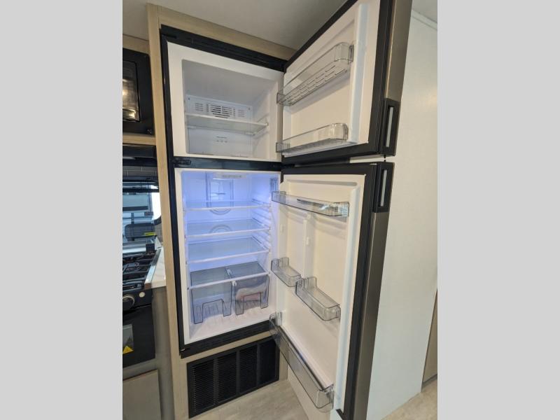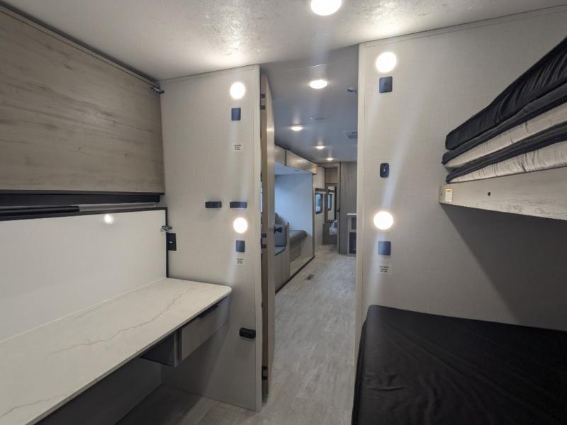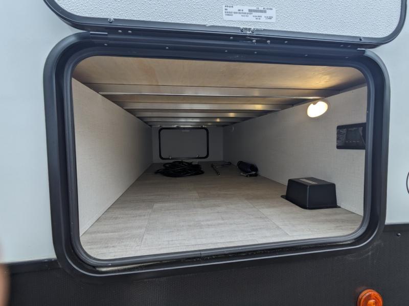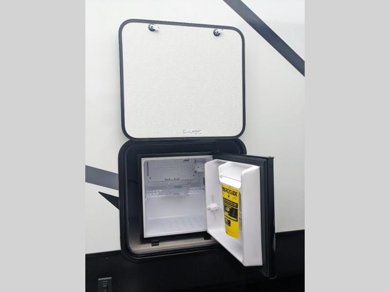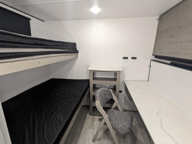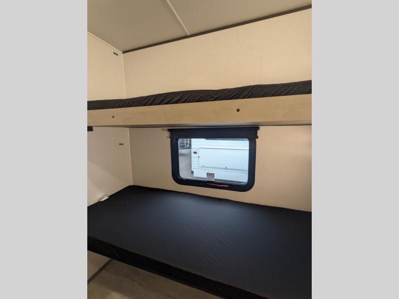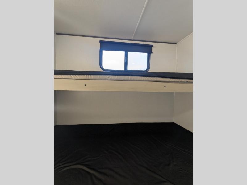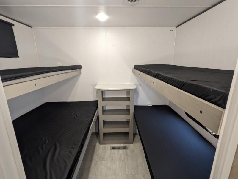 This travel trailer is perfect for weekend excursions or extended getaways at your favorite state park. You will have your own queen bed up front with storage space for your things, and the rear private bunkhouse will be perfect for guests. Here, you'll find a set of bunk beds plus a fold-up bunk over a booth dinette so there is a place to eat or play games back here. The full kitchen will let you cook meals each day, and the 10 cu. ft. refrigerator will keep your food fresh. Outside, a 14' power awning will provide some shade, and an outdoor refrigerator will keep cold drinks close by!