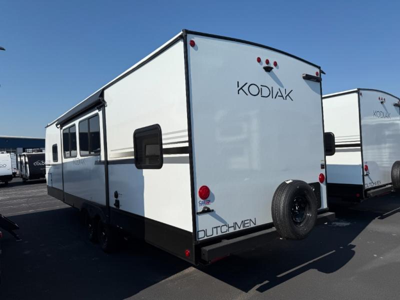 Each Kodiak travel trailer by Dutchmen includes a diamond front plate, easy lube axles, and a power tongue jack for hassle-free towing. The bear cave storage will allow you to bring along all the camp gear, and the power awning with an LED light will create an inviting outdoor space. Head inside to enjoy the designer valances, blackout roller shades, and seamless countertops. There is also HyperDeck flooring that will withstand your many adventures plus a 6' 8" interior height for more head room. A high output furnace and 13.5k BTU A/C will keep you comfortable, and the on-demand tankless water heater will provide instant hot water when you need it!