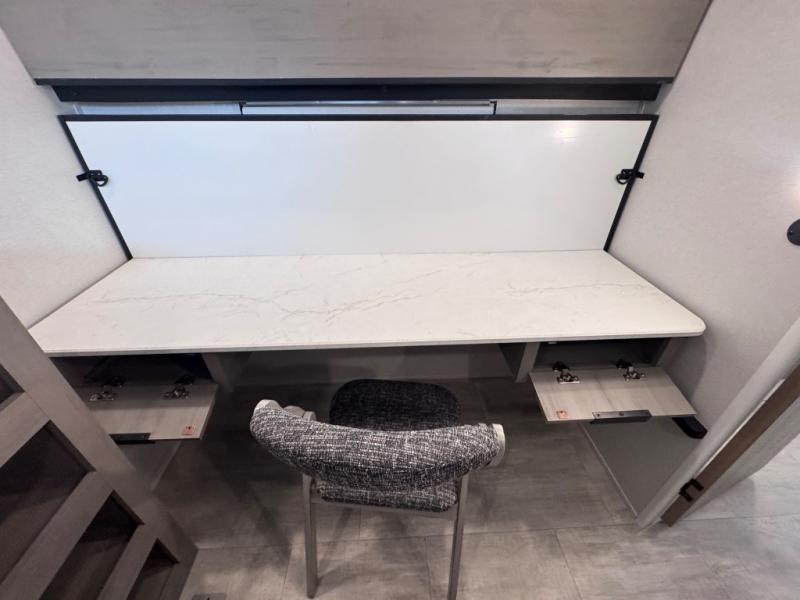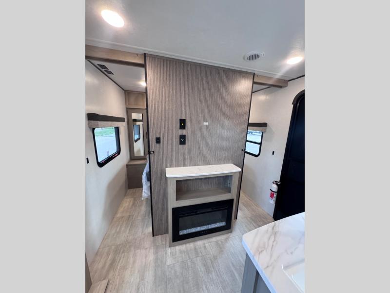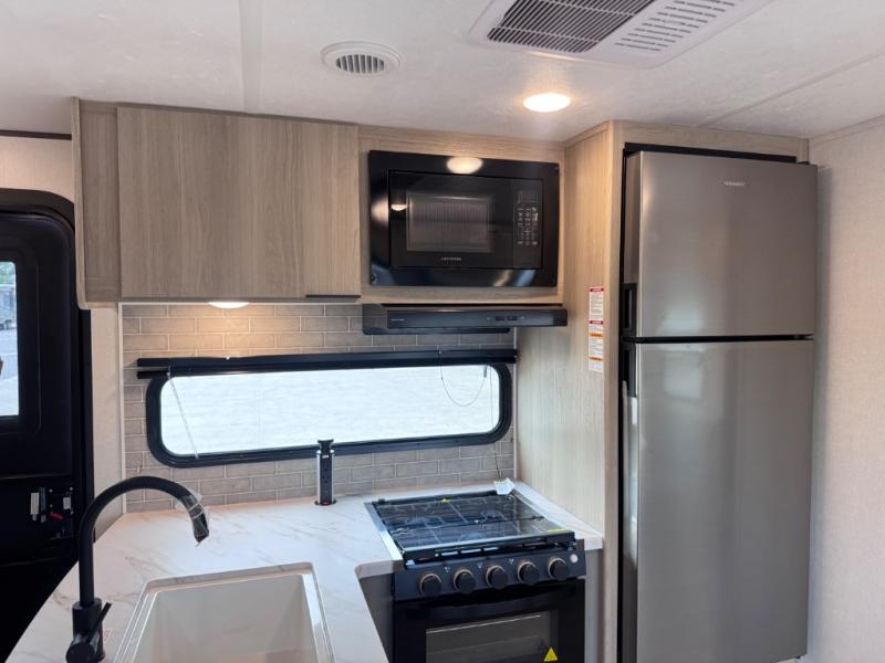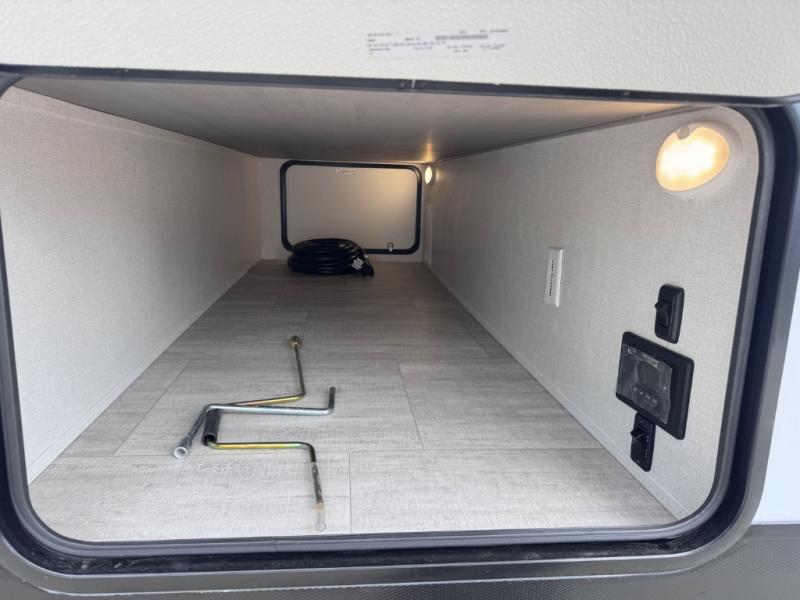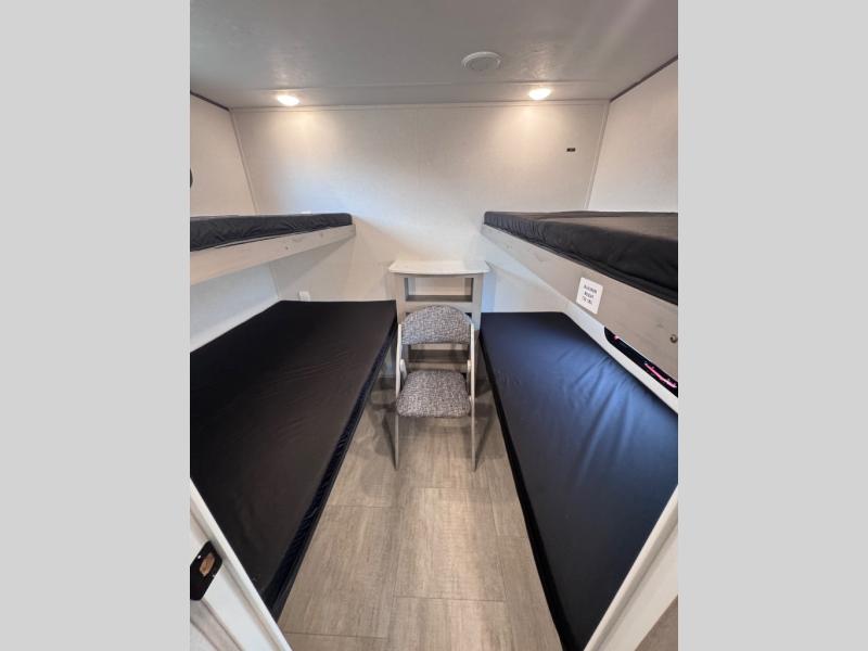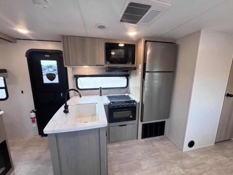 This travel trailer is perfect for weekend excursions or extended getaways at your favorite state park. You will have your own queen bed up front with storage space for your things, and the rear private bunkhouse will be perfect for guests. Here, you'll find a set of bunk beds plus a fold-up bunk over a booth dinette so there is a place to eat or play games back here. The full kitchen will let you cook meals each day, and the 10 cu. ft. refrigerator will keep your food fresh. Outside, a 14' power awning will provide some shade, and an outdoor refrigerator will keep cold drinks close by!