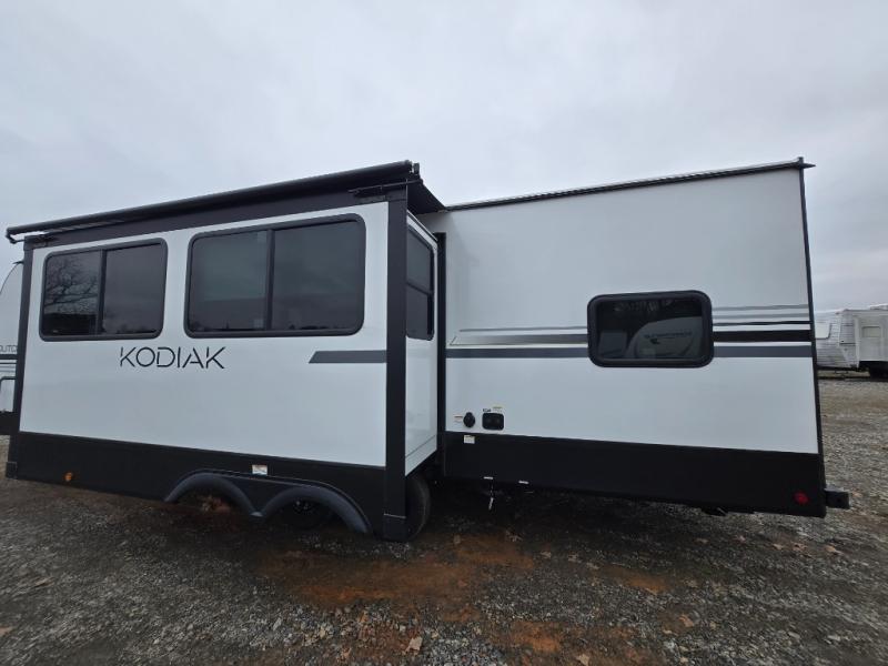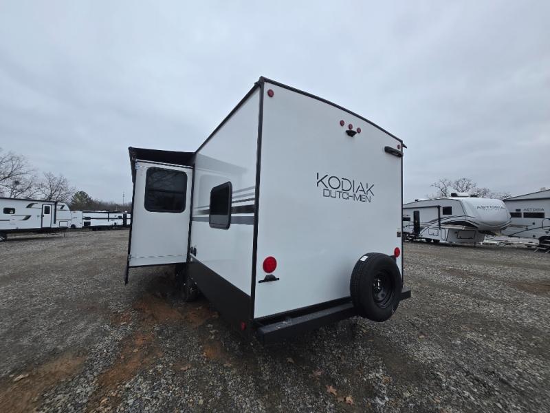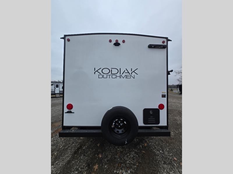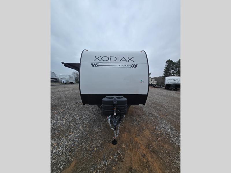 Each Kodiak travel trailer by Dutchmen includes a diamond front plate, easy lube axles, and a power tongue jack for hassle-free towing. The bear cave storage will allow you to bring along all the camp gear, and the power awning with an LED light will create an inviting outdoor space. Head inside to enjoy the designer valances, blackout roller shades, and seamless countertops. There is also HyperDeck flooring that will withstand your many adventures plus a 6' 8" interior height for more head room. A high output furnace and 13.5k BTU A/C will keep you comfortable, and the on-demand tankless water heater will provide instant hot water when you need it!