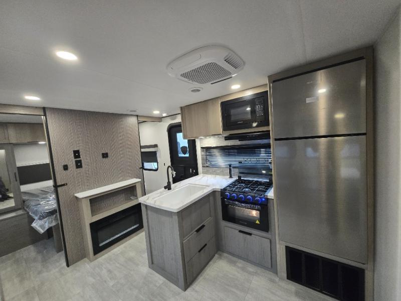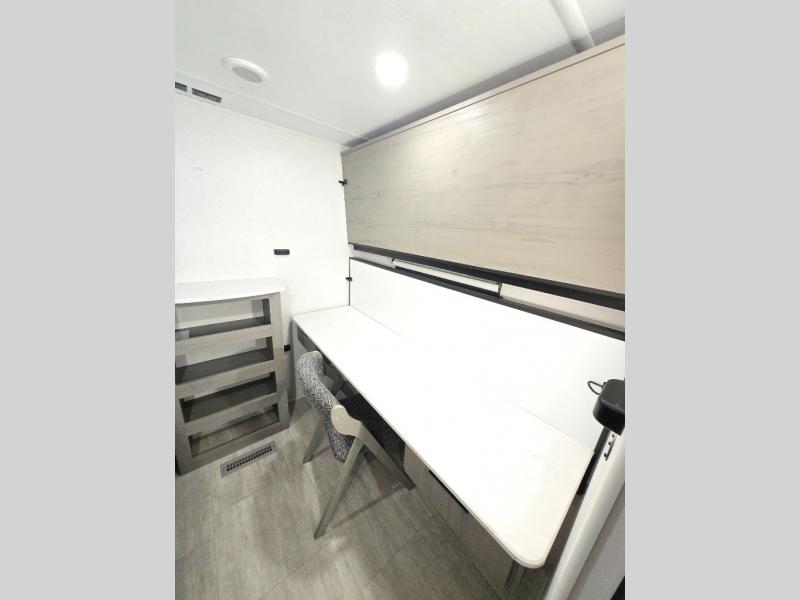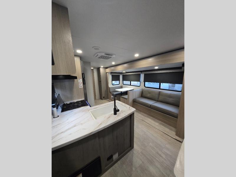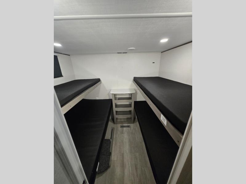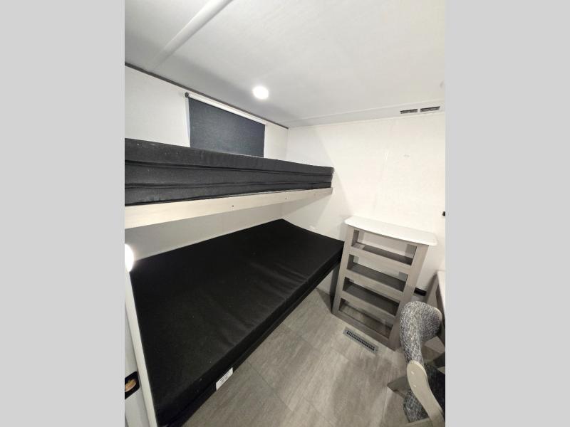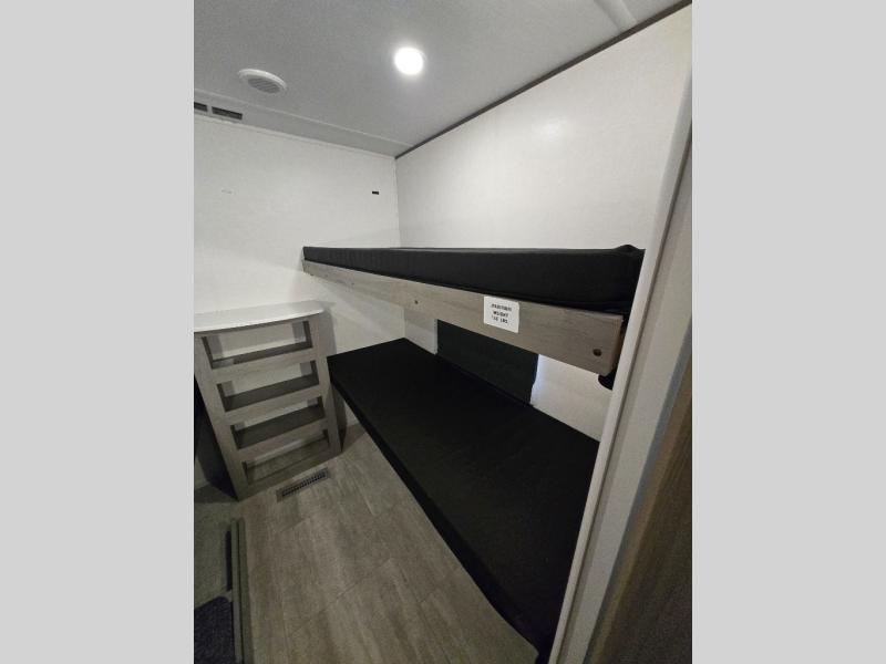 This travel trailer is perfect for weekend excursions or extended getaways at your favorite state park. You will have your own queen bed up front with storage space for your things, and the rear private bunkhouse will be perfect for guests. Here, you'll find a set of bunk beds plus a fold-up bunk over a booth dinette so there is a place to eat or play games back here. The full kitchen will let you cook meals each day, and the 10 cu. ft. refrigerator will keep your food fresh. Outside, a 14' power awning will provide some shade, and an outdoor refrigerator will keep cold drinks close by!