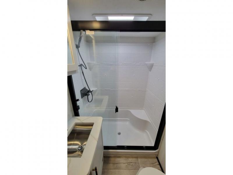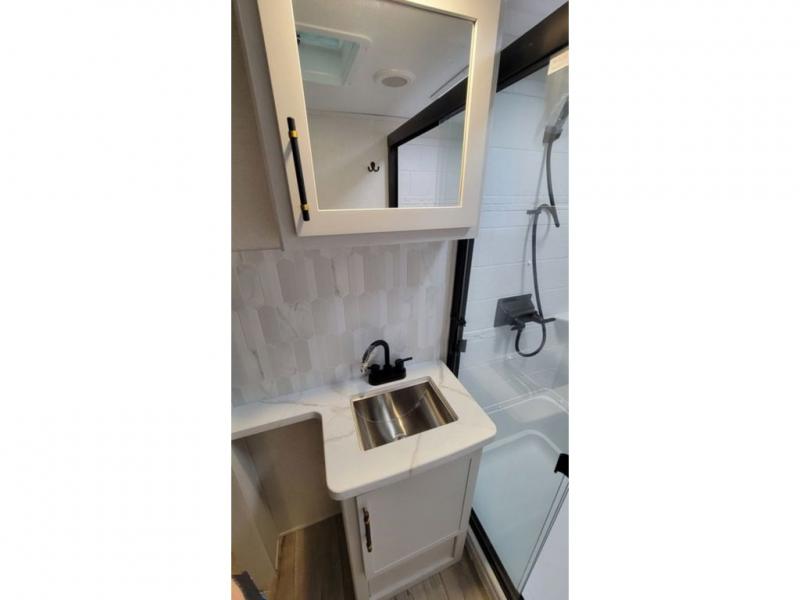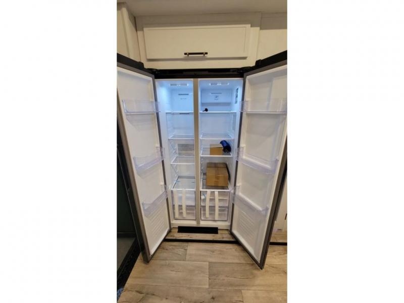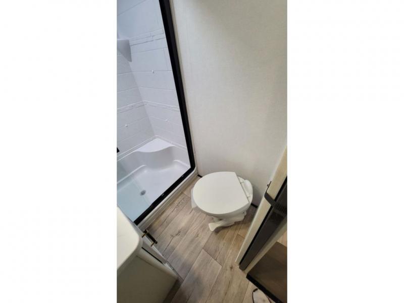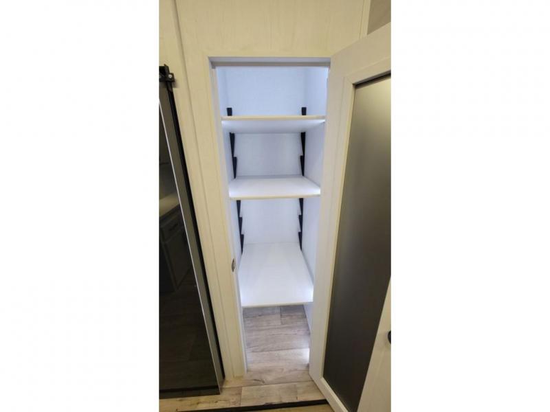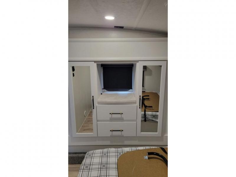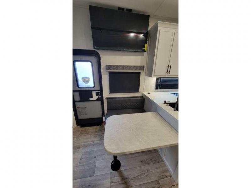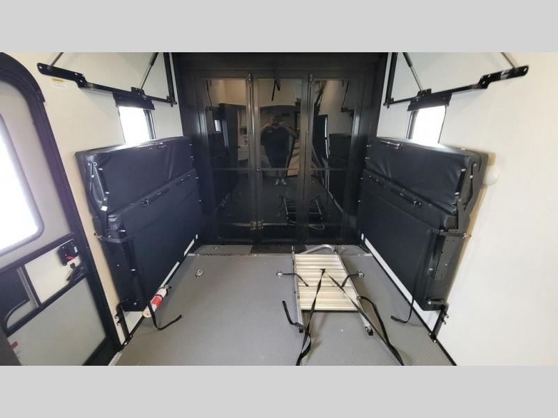 Load up your favorite off-road toys, grab a few friends and head out for a weekend of fun! This Voltage V-Series features a 14' garage with sleeping for seven or eight with the Bed Lift System over the dual sofas and dinette which convert to more sleeping in the garage area, a loft, and private front bedroom with queen bed. The main combined kitchen and living space features a reclining sofa with foot rest housed in the large slide that also includes a 16 cu. ft. 12V refrigerator and pantry for all of your food storage needs. There are full kitchen and bath amenities to keep you fueled and clean, and you will also enjoy the 40" TV and fireplace when relaxing inside. A 21' awning offers additional living space outside, and there is a Pac & Stack half bath in the garage for added convenience when coming in from a ride located beneath the loft. This unit also offers ample storage with a full pass-through compartment outside, and inside cabinets, pantry storage, plus wardrobe, dresser, and under bed storage as well.