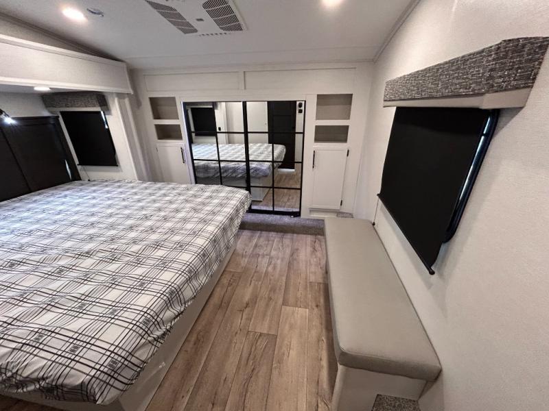 14FT CARAGE / 5.5K GENERATOR /Automatic Leveling System/ 3 AC's / Slide Toppers/Two Bathrooms/ 3 SEASON DOOR